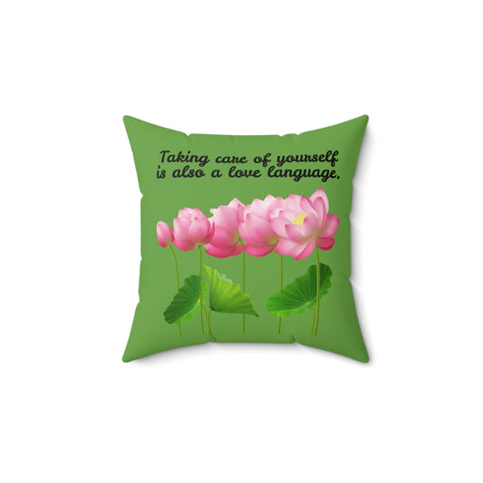 Cuidarse a uno mismo también es un lenguaje de amor, almohada con diseño de flores florecientes, almohada verde con flores rosas, almohada decorativa