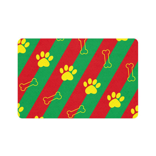Alfombrilla para comida para mascotas con rayas rojas y verdes con diseño de huellas de patas y huesos