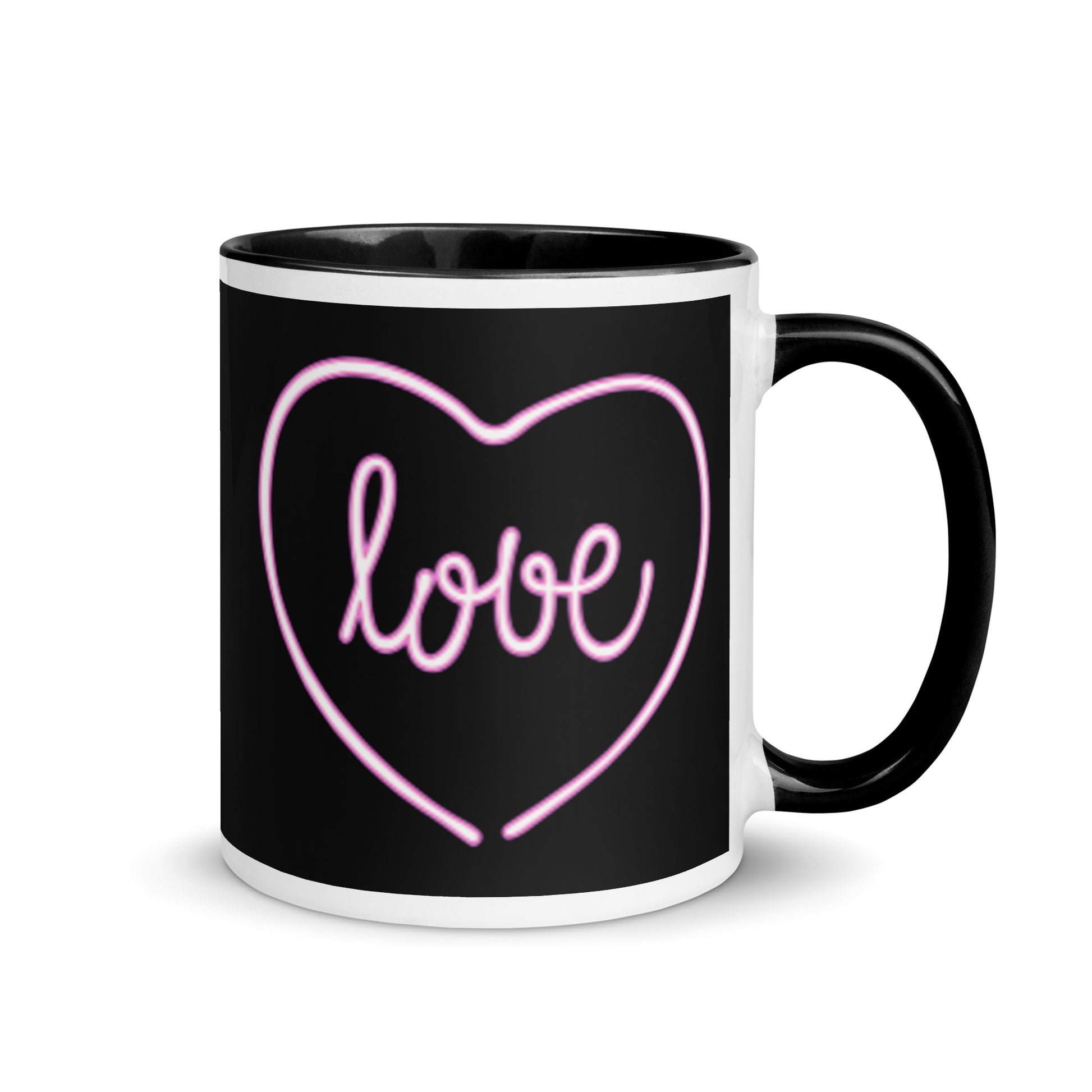 Esta taza para el día de San Valentín presenta un diseño de contorno de corazón con la inscripción "love" en el centro sobre un fondo negro. Tiene un borde, un interior y un asa de colores para darle un divertido detalle adicional. Esta taza de café está hecha de cerámica y es apta para lavavajillas y microondas. Es duradera y resistente, por lo que dura como nueva durante mucho tiempo.
