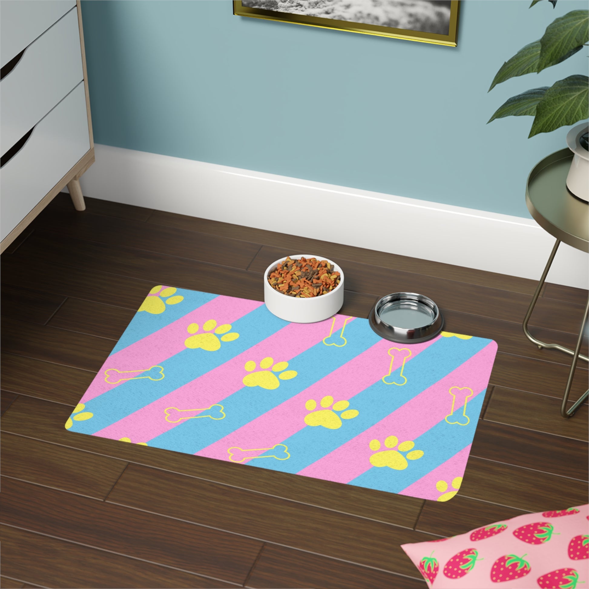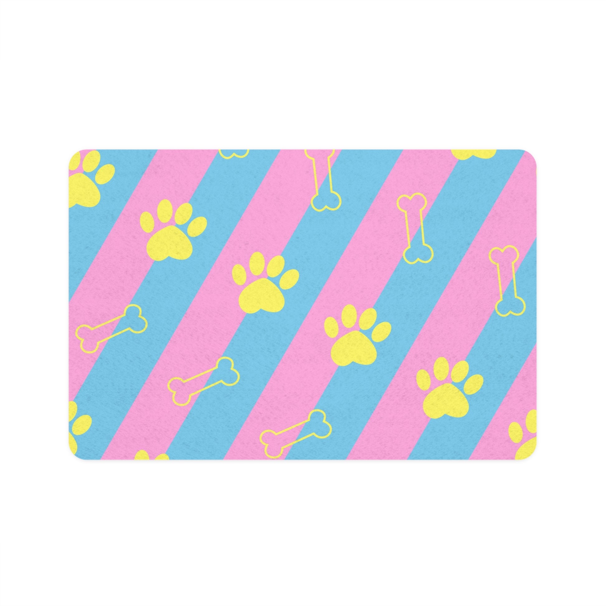 Alfombrilla para comida para mascotas con rayas azules y rosas con diseño de huellas de patas y huesos
