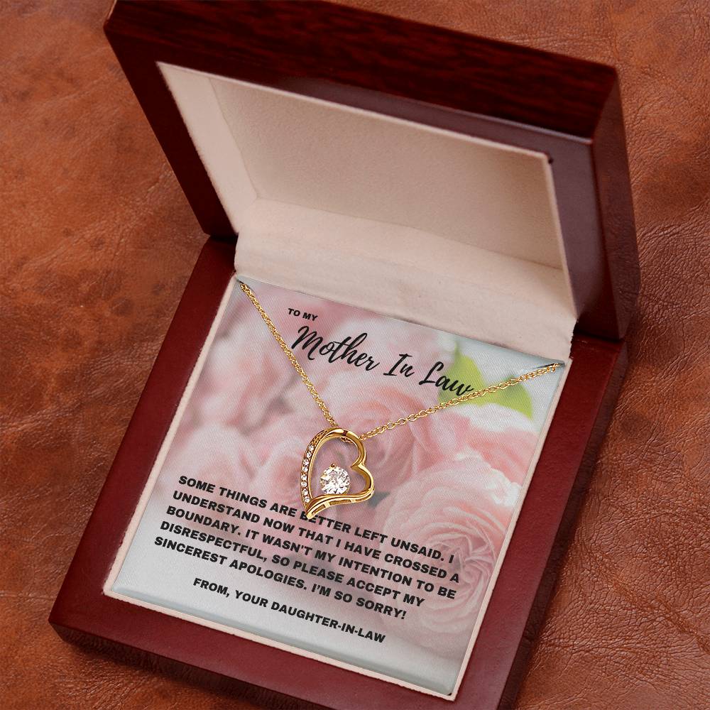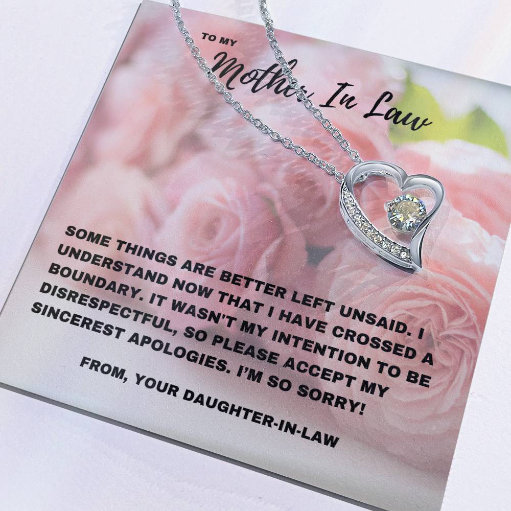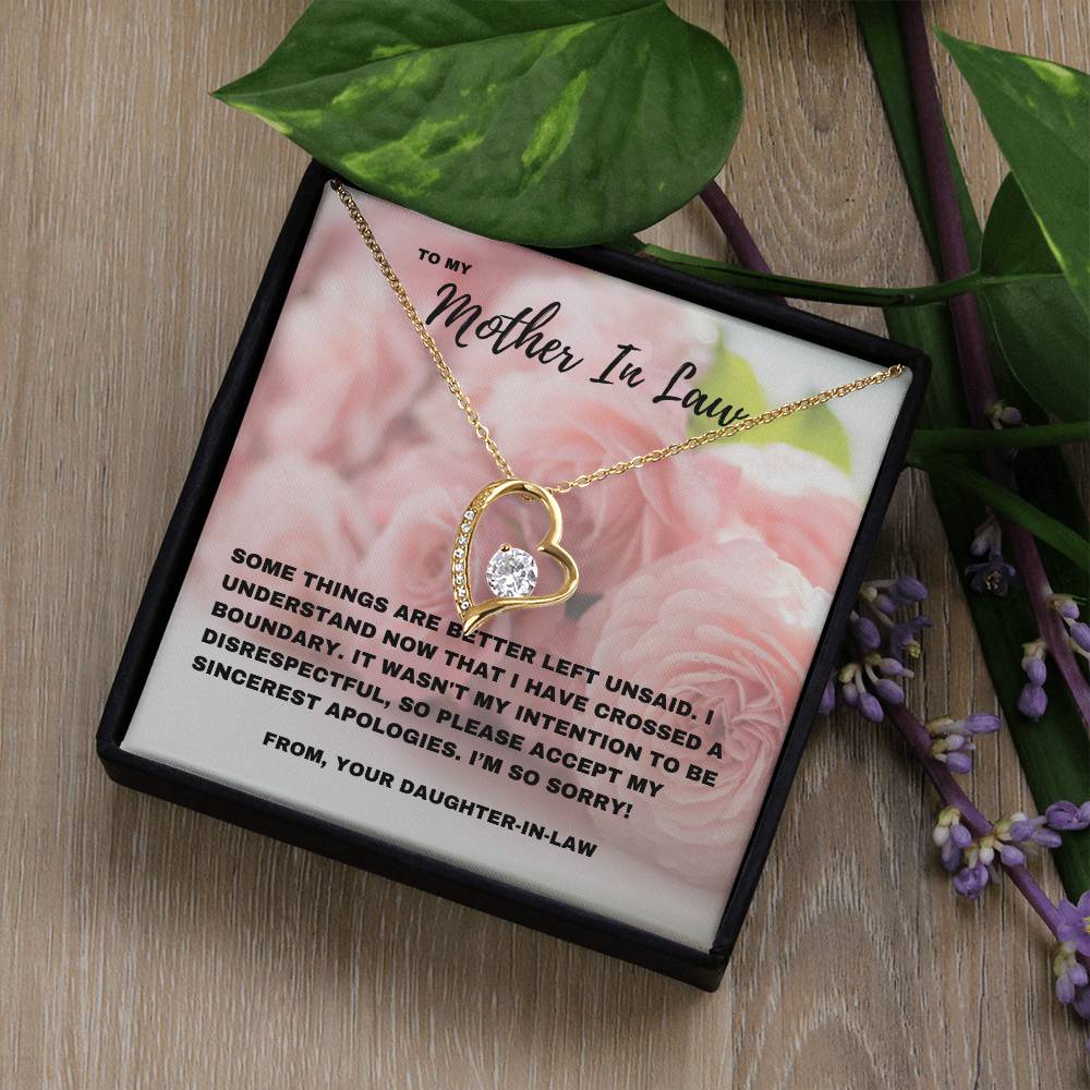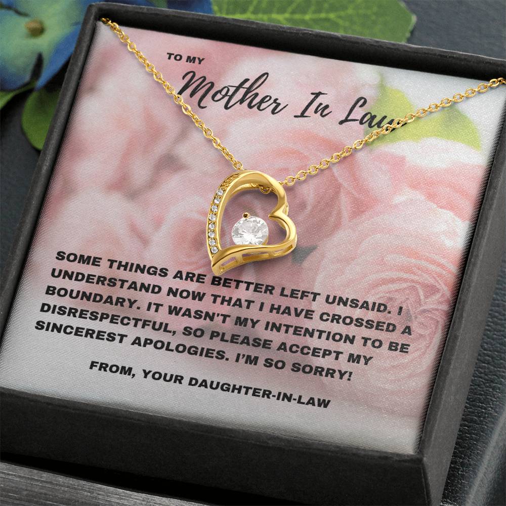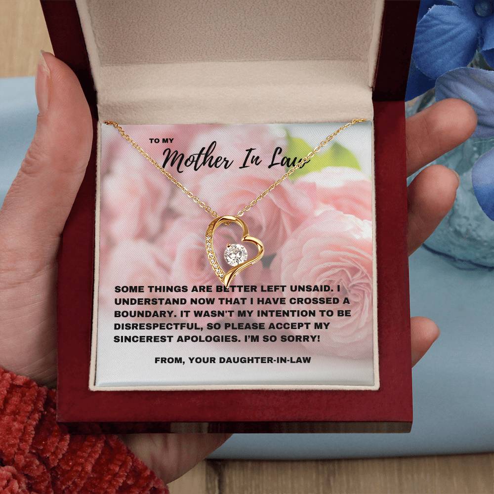 Este elegante collar Forever Love, acompañado de una tarjeta con un mensaje sincero que dice “Algunas cosas es mejor no decirlas”, es la manera perfecta de expresar tus más sinceras disculpas. Ya sea que hayas cruzado un límite o hayas causado dolor sin querer, este regalo es una manera significativa de mostrarle a tu suegra que lo sientes.