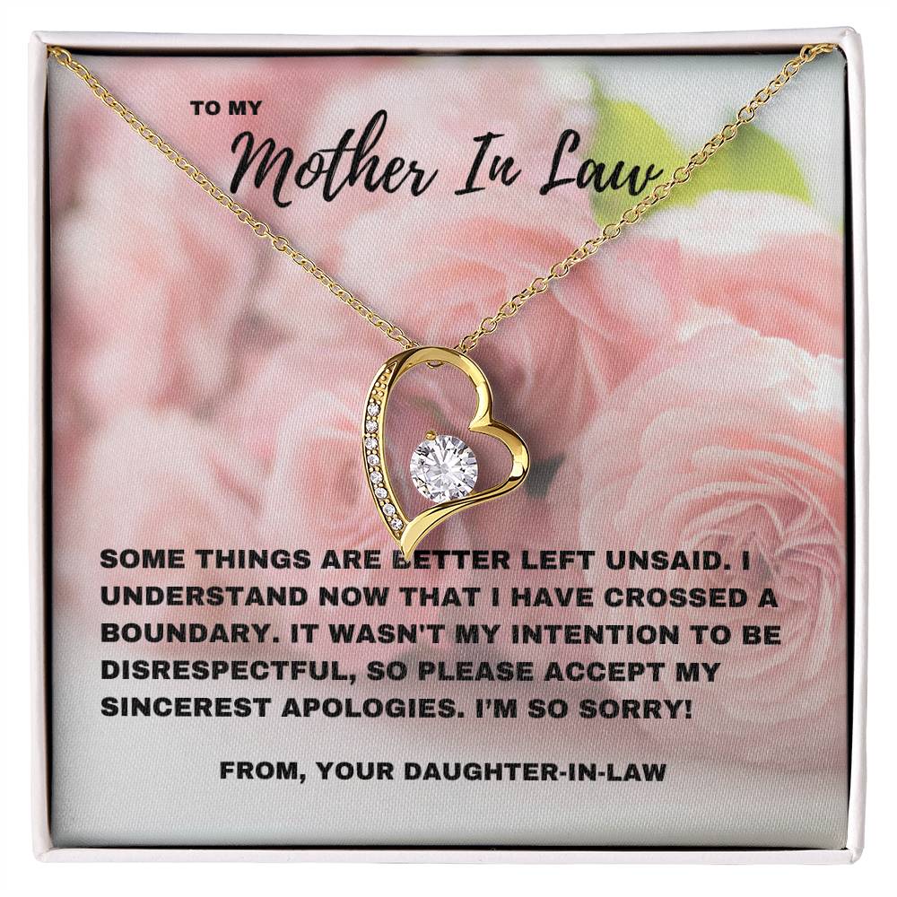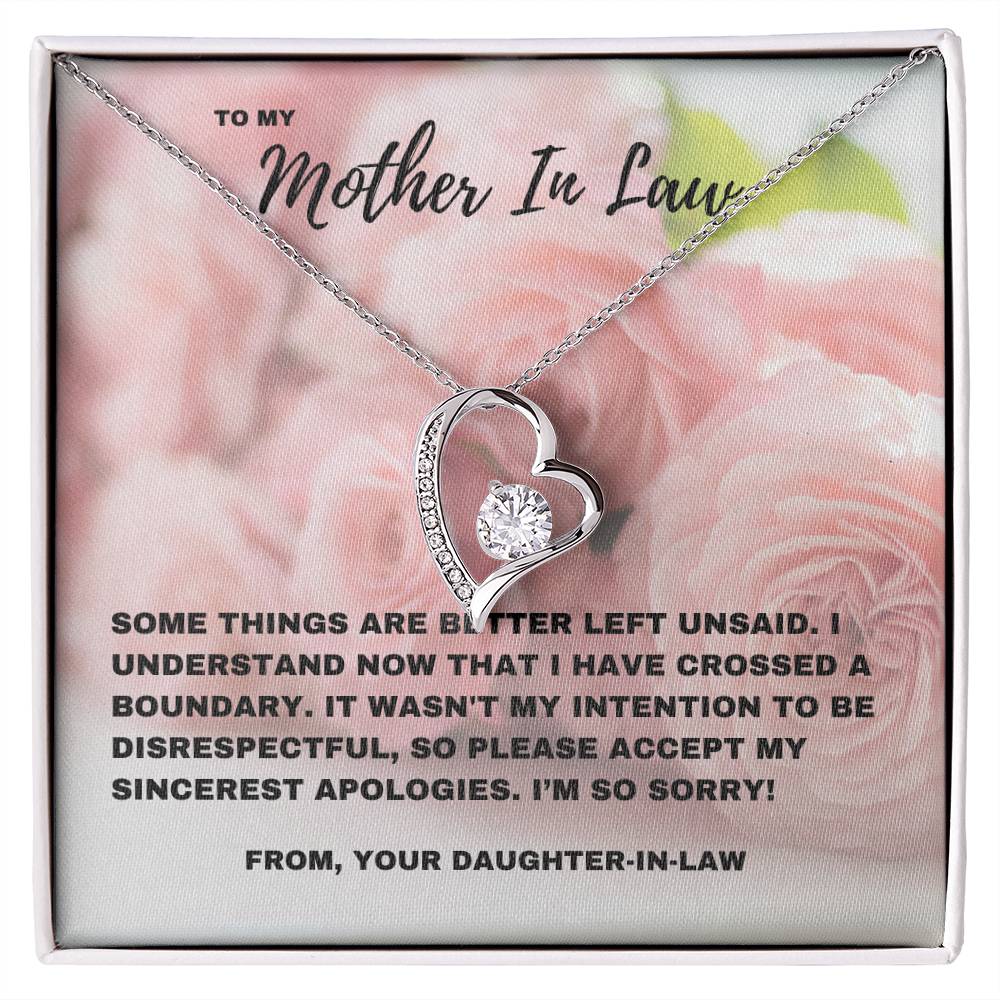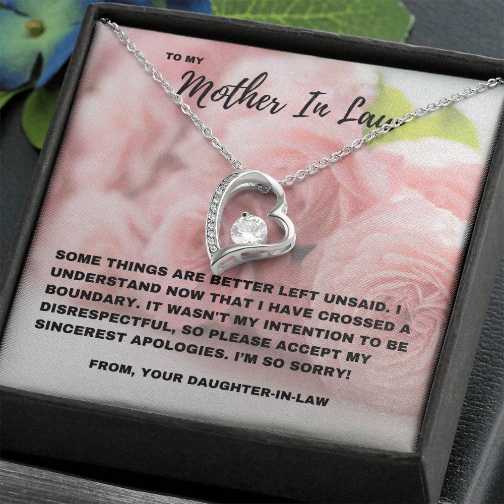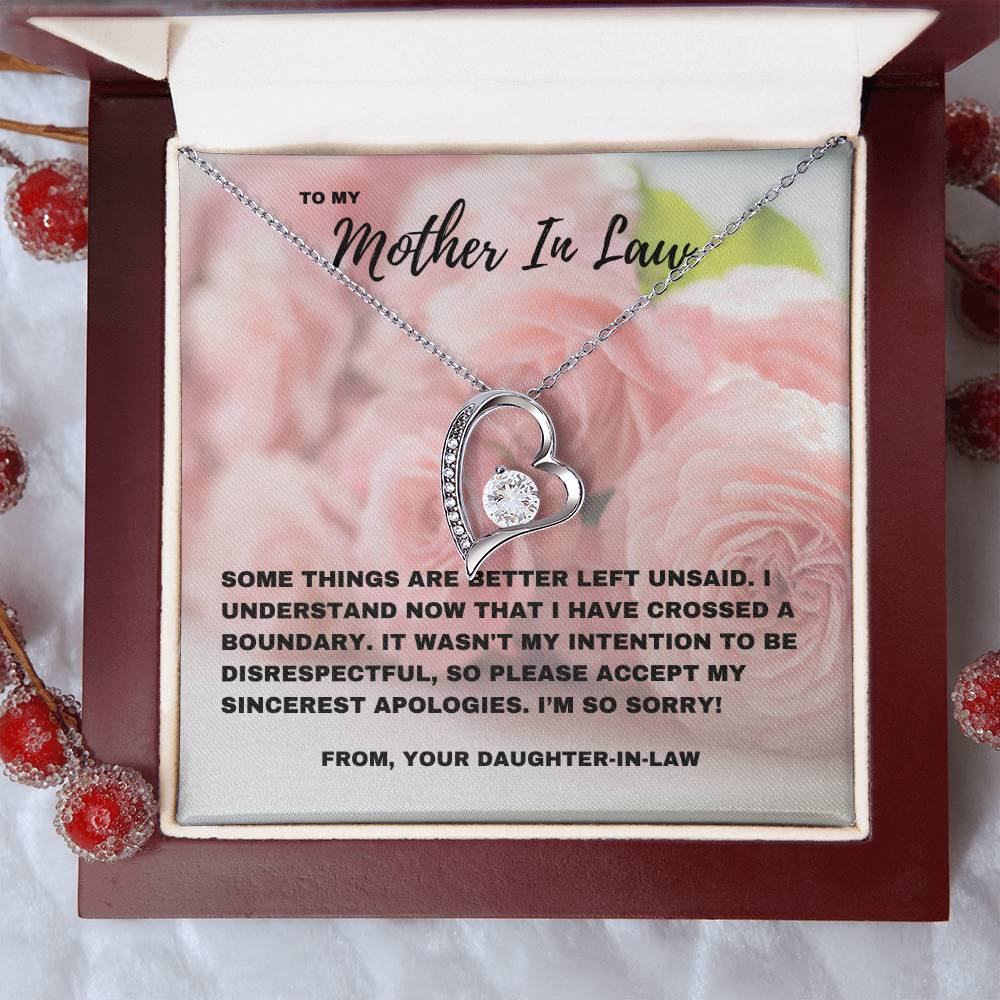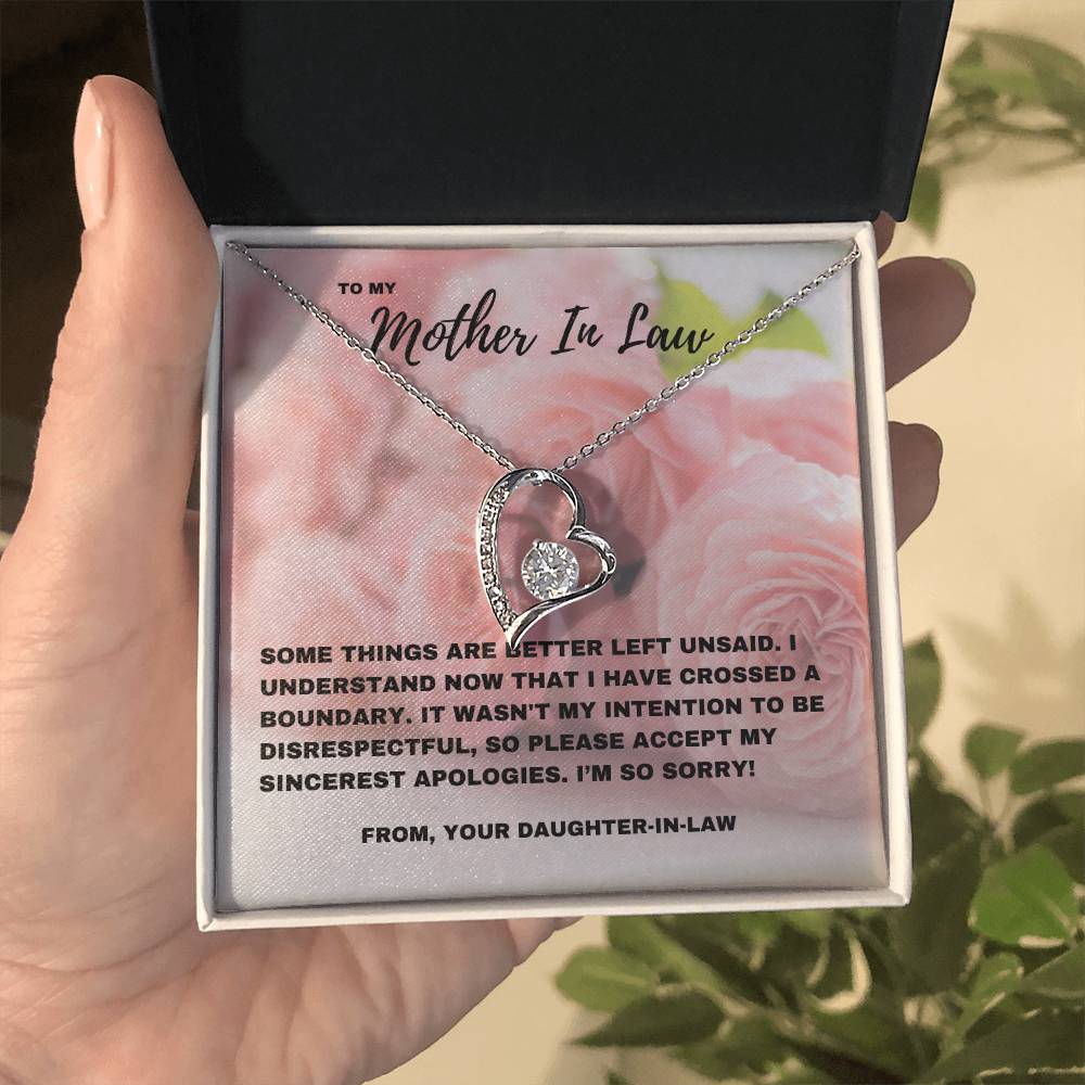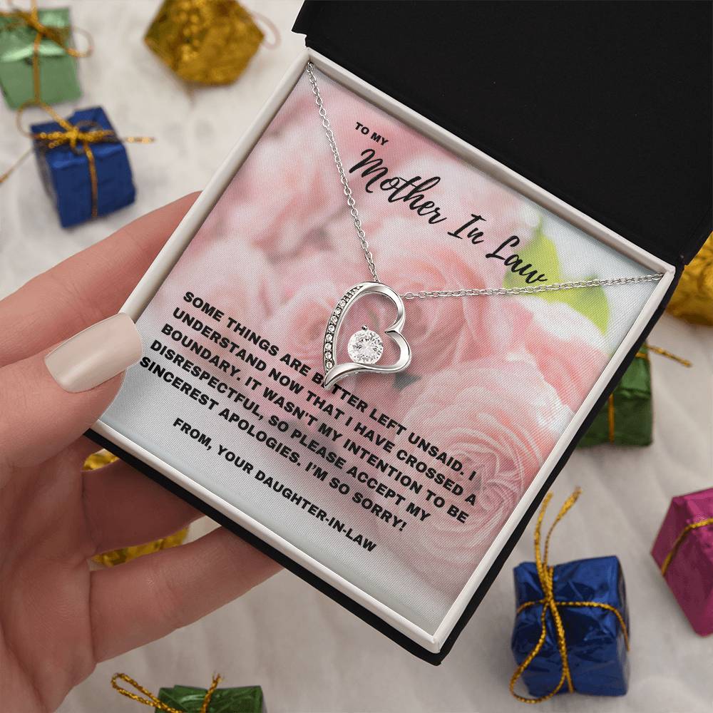 Este elegante collar Forever Love, acompañado de una tarjeta con un mensaje sincero que dice “Algunas cosas es mejor no decirlas”, es la manera perfecta de expresar tus más sinceras disculpas. Ya sea que hayas cruzado un límite o hayas causado dolor sin querer, este regalo es una manera significativa de mostrarle a tu suegra que lo sientes.