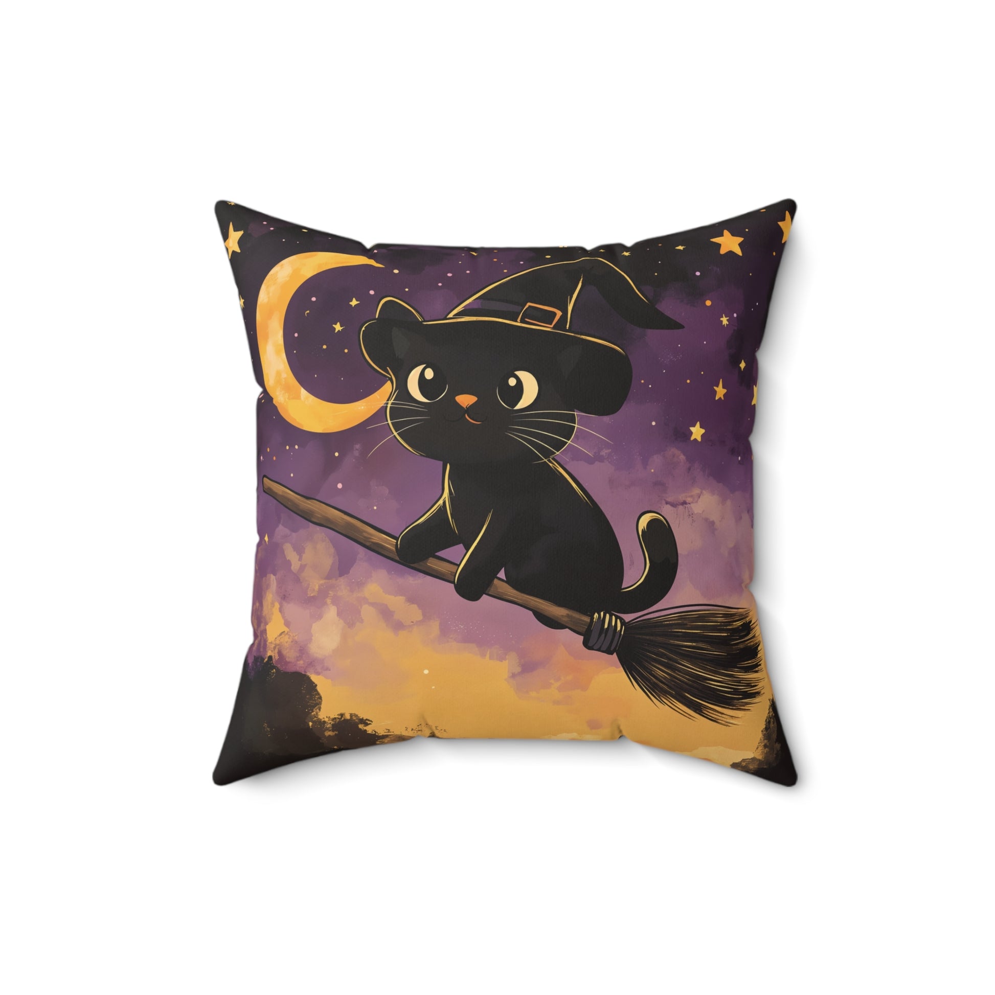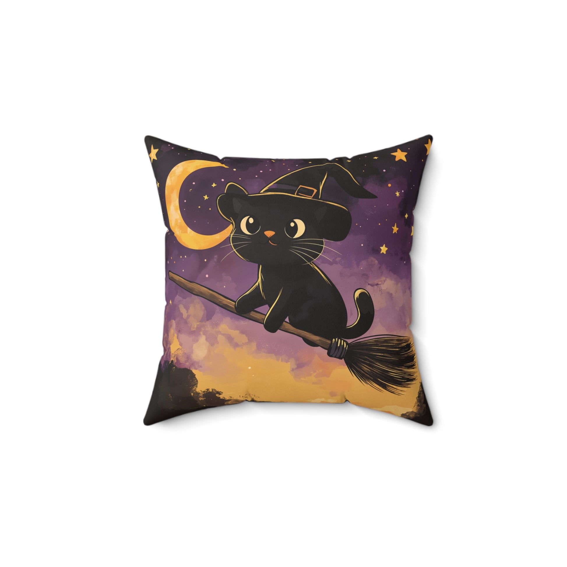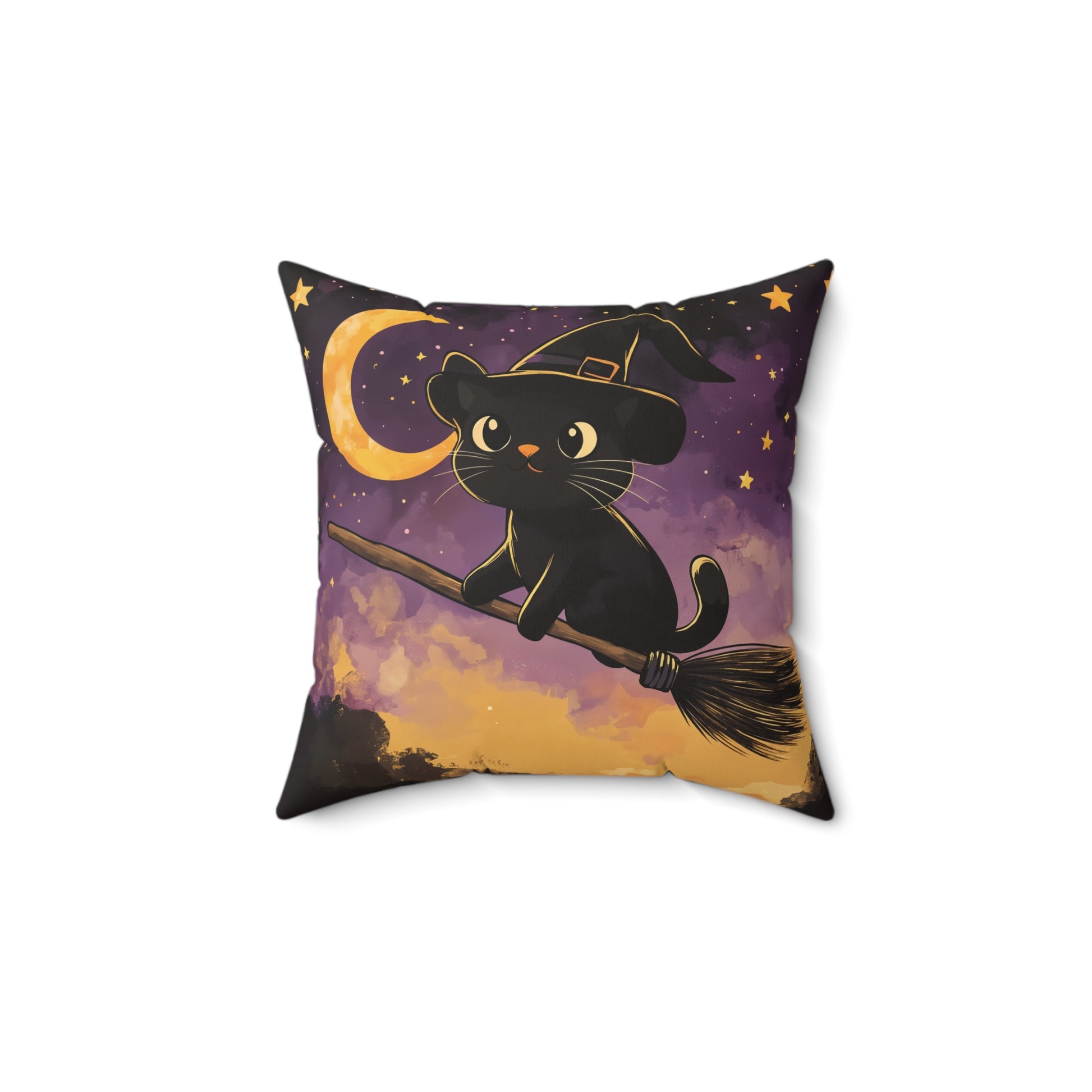 Add a touch of magic to your Halloween decor with this Cute Black Cat on Broomstick throw pillow! Featuring an adorable black cat wearing a witch’s hat, soaring through a starry night sky on a broomstick, this pillow brings whimsy and charm to any space. The soft hues of purple, gold, and black create a cozy, festive atmosphere that’s perfect for the spooky season.