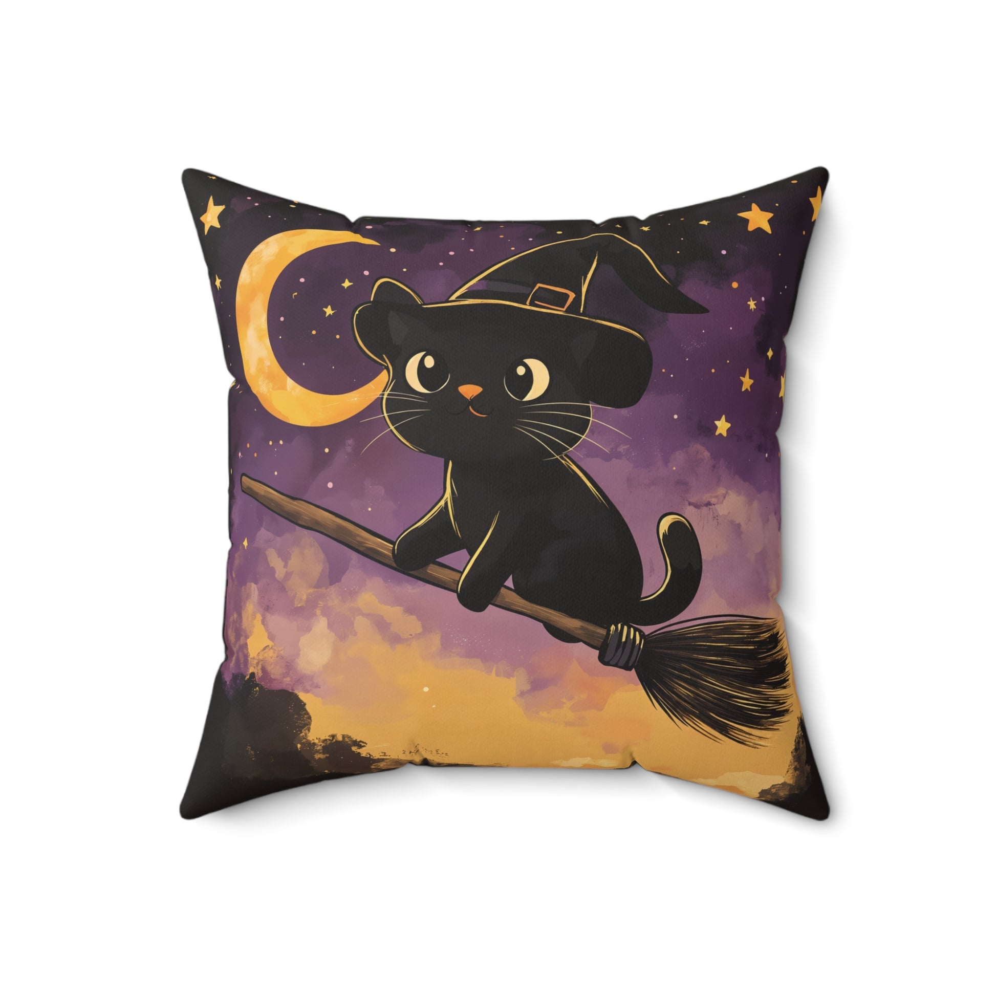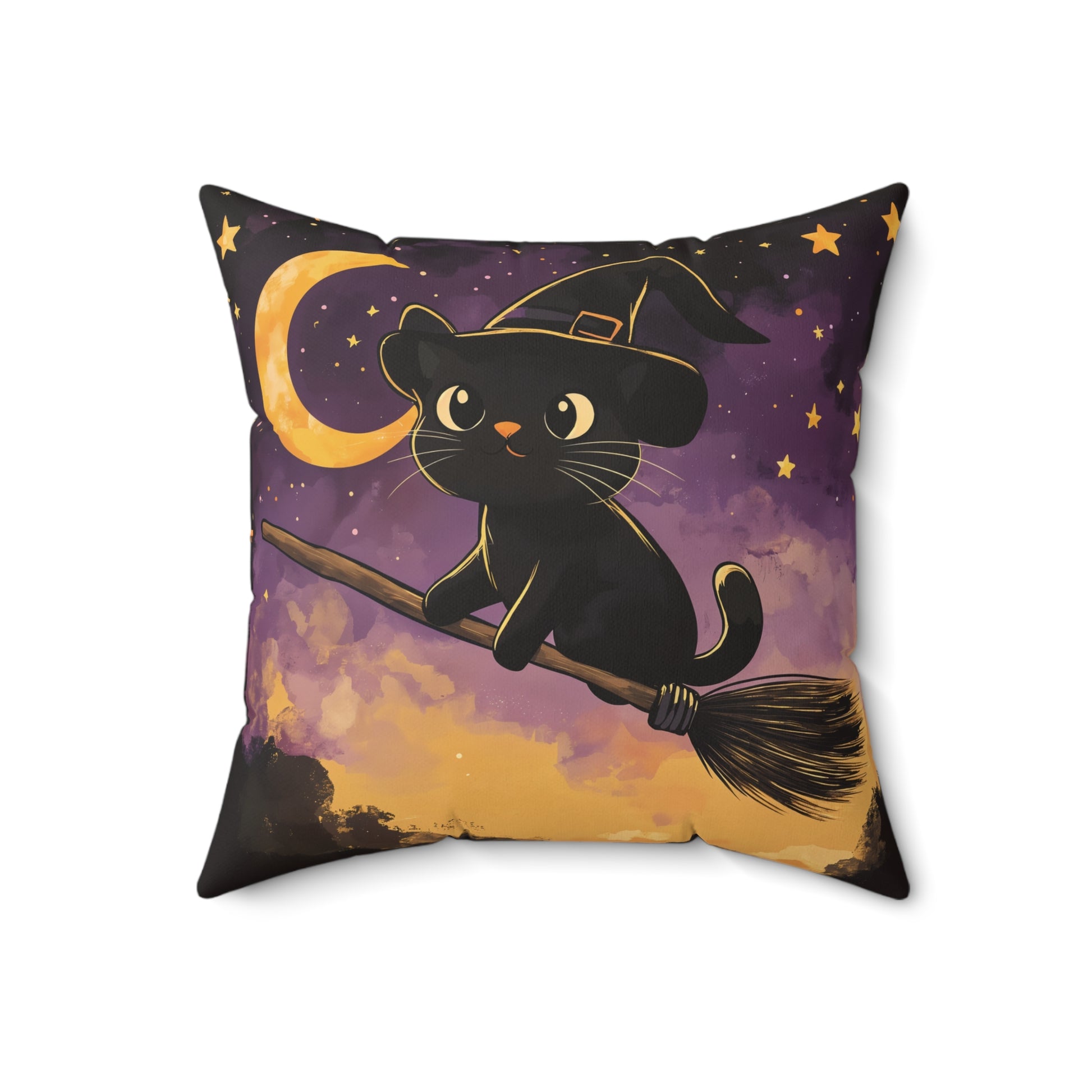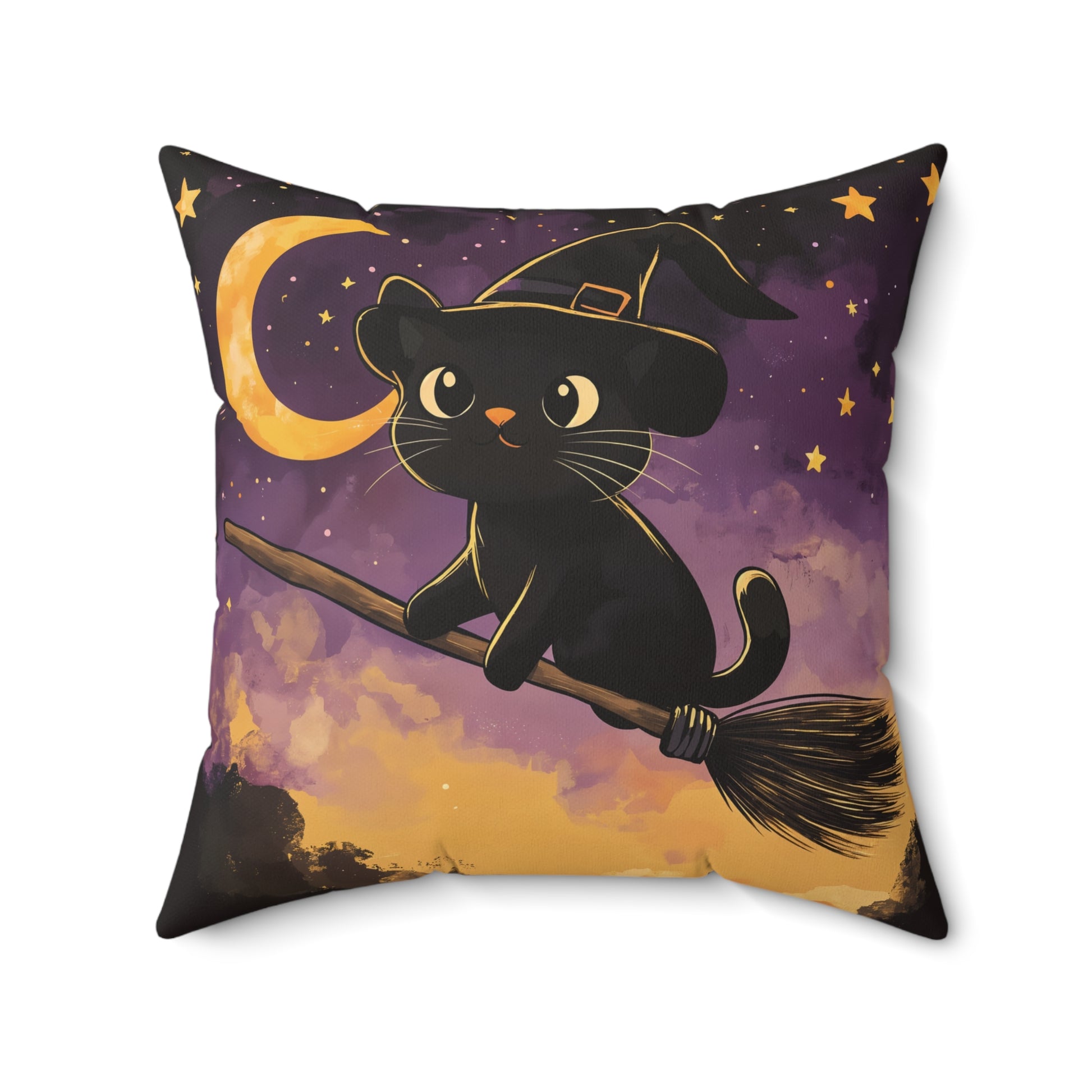 Add a touch of magic to your Halloween decor with this Cute Black Cat on Broomstick throw pillow! Featuring an adorable black cat wearing a witch’s hat, soaring through a starry night sky on a broomstick, this pillow brings whimsy and charm to any space. The soft hues of purple, gold, and black create a cozy, festive atmosphere that’s perfect for the spooky season.