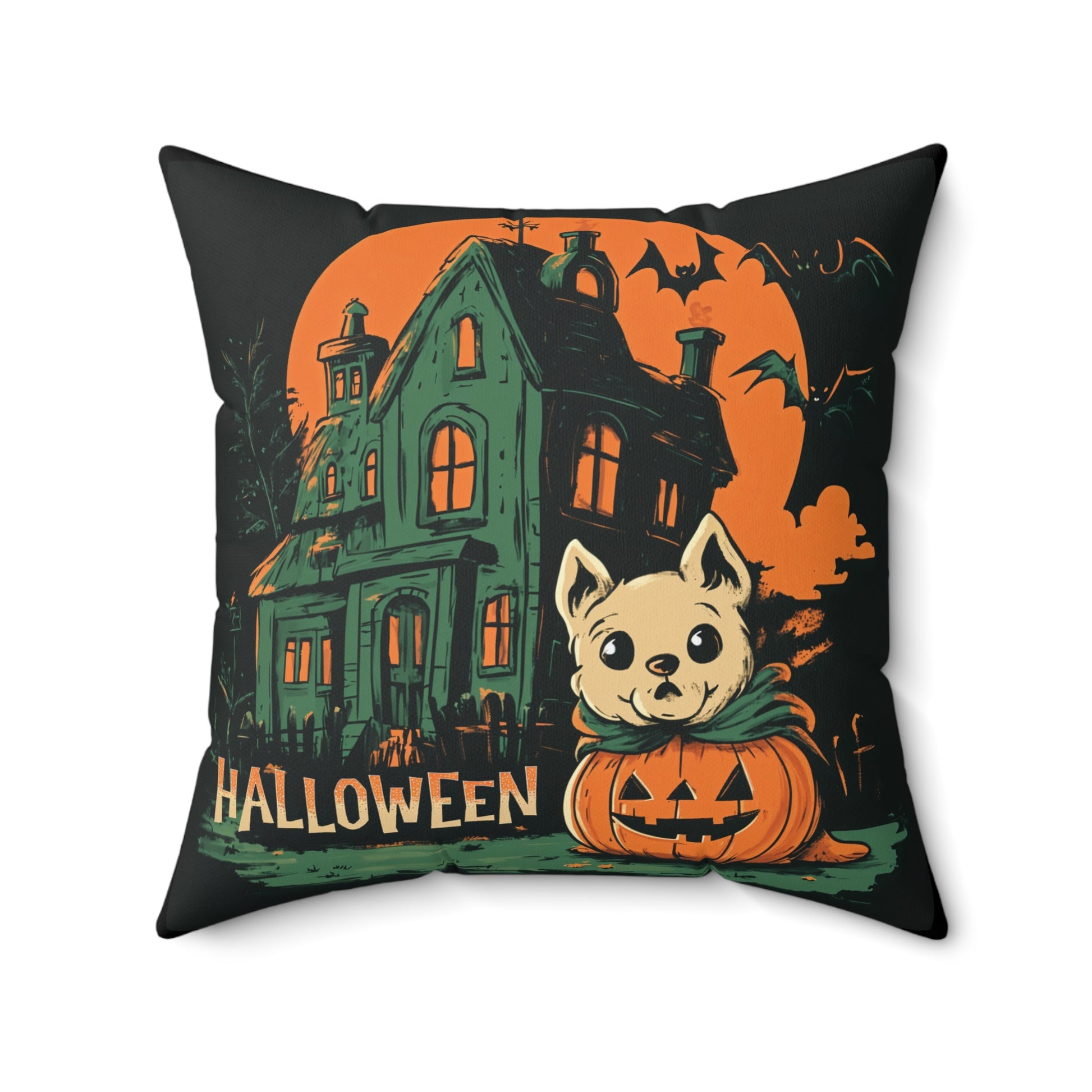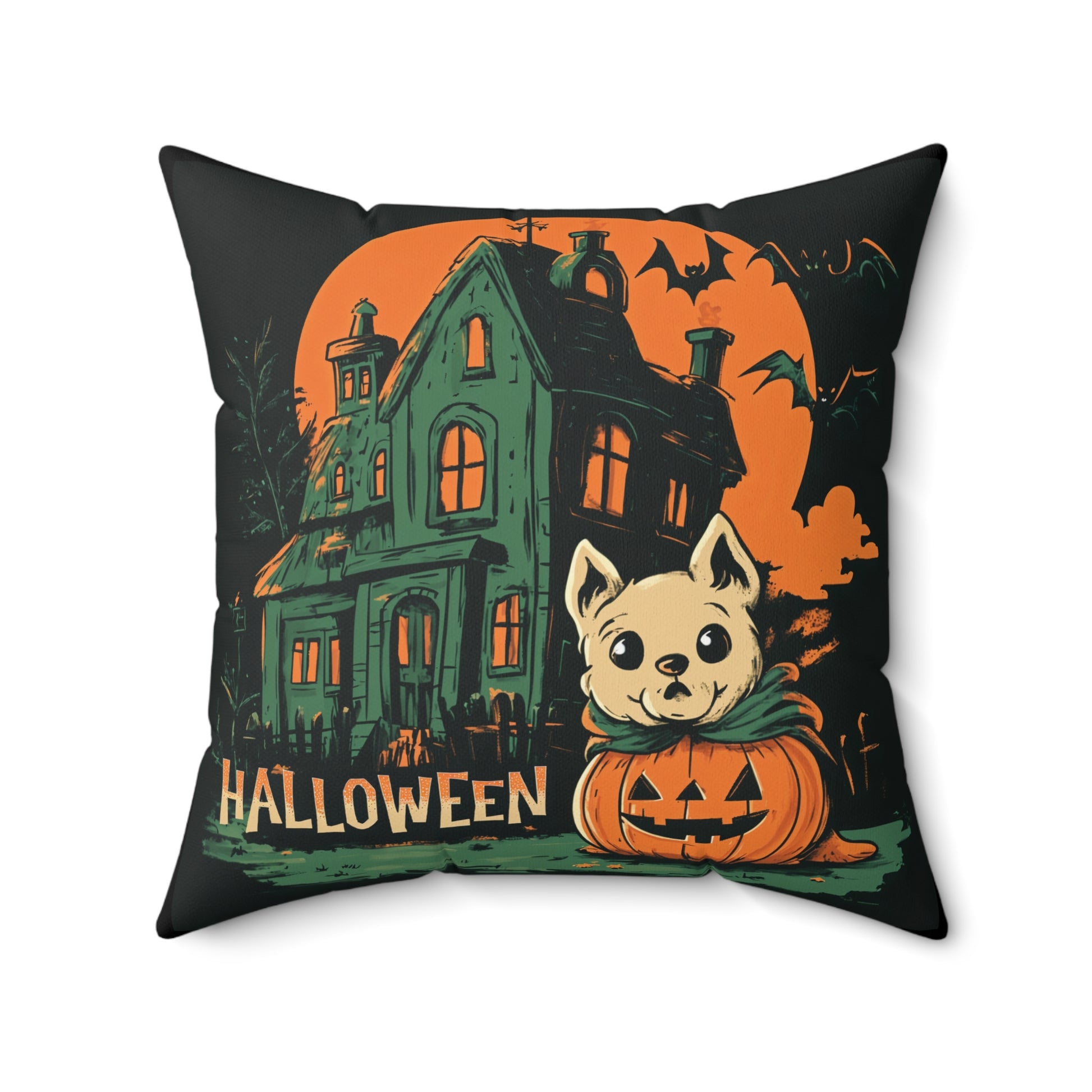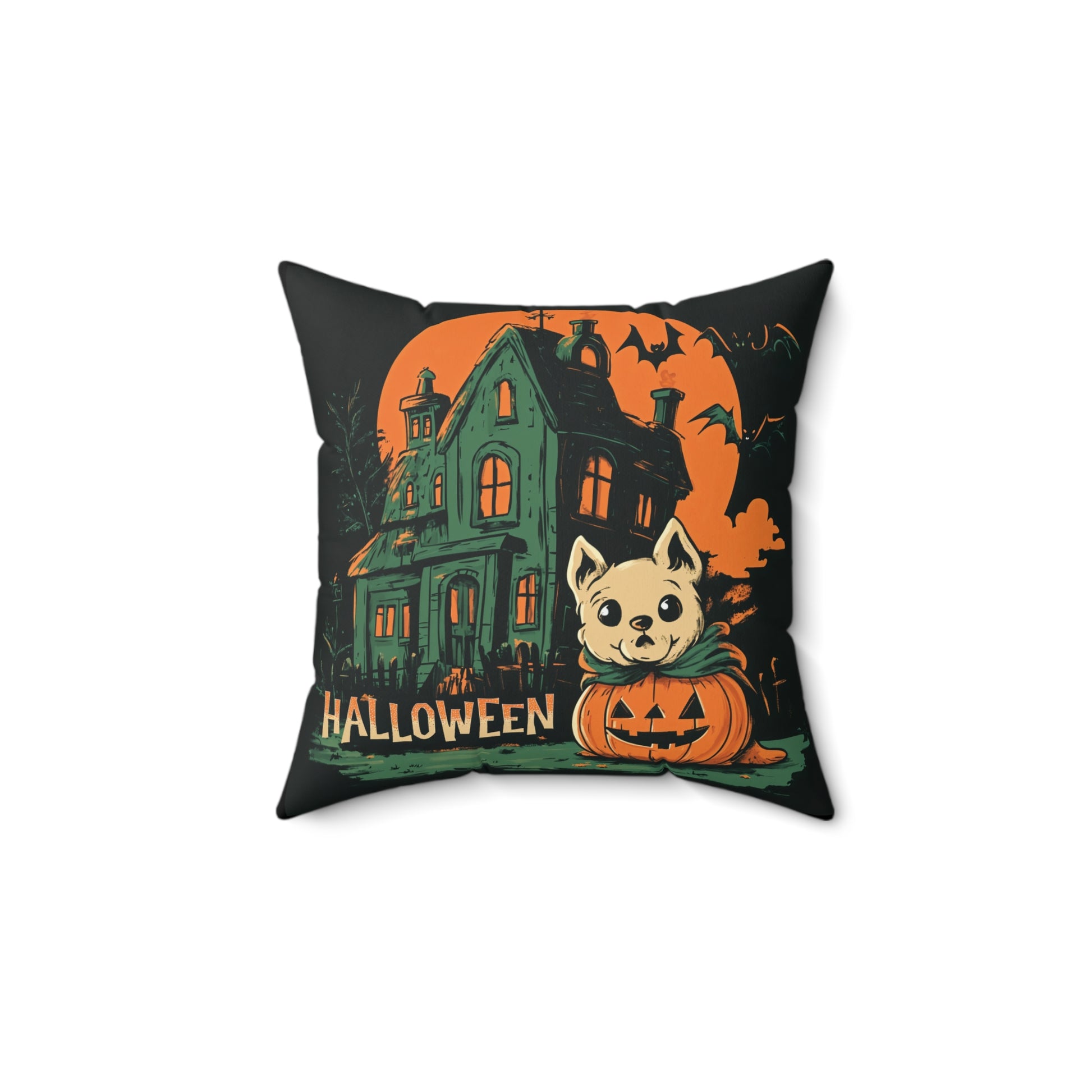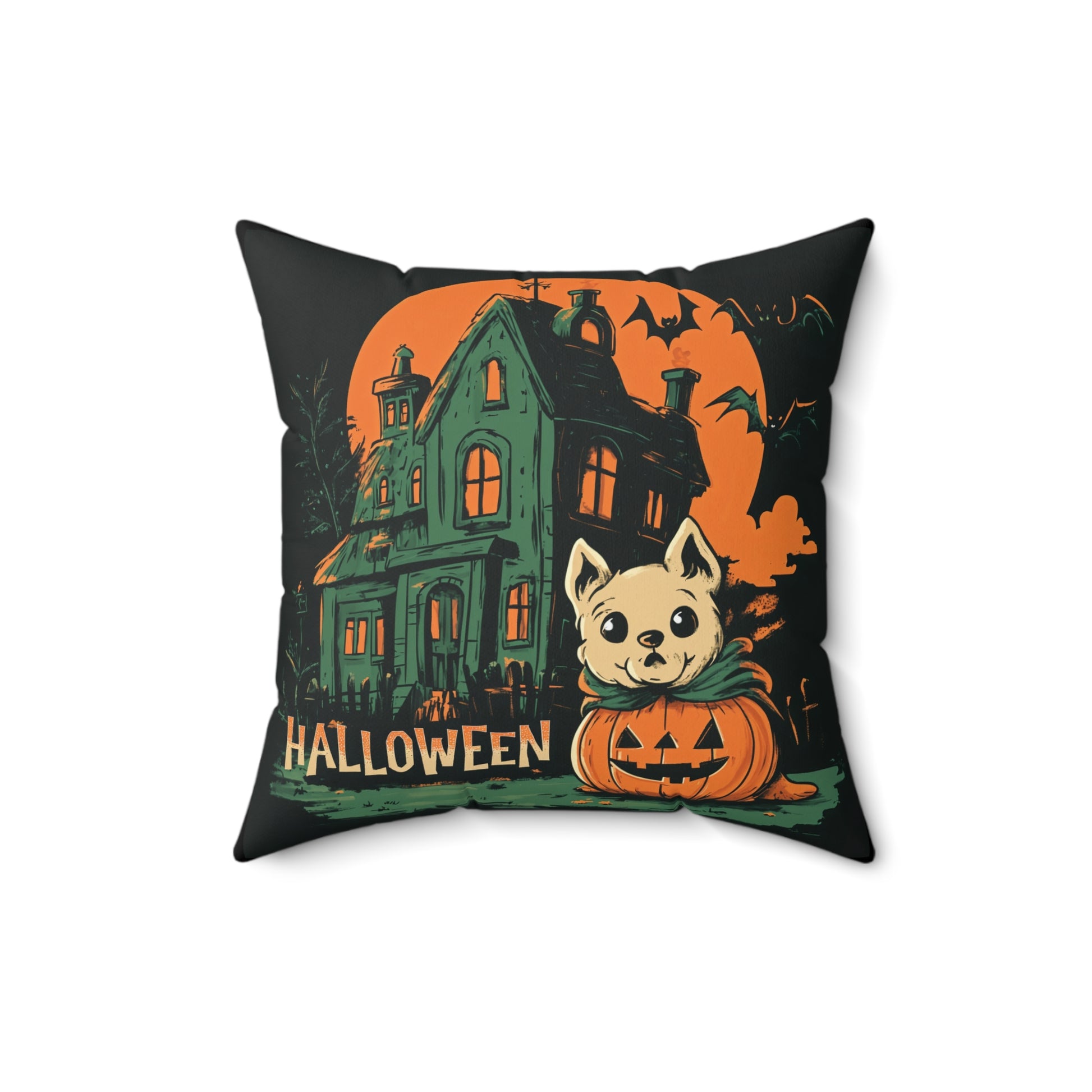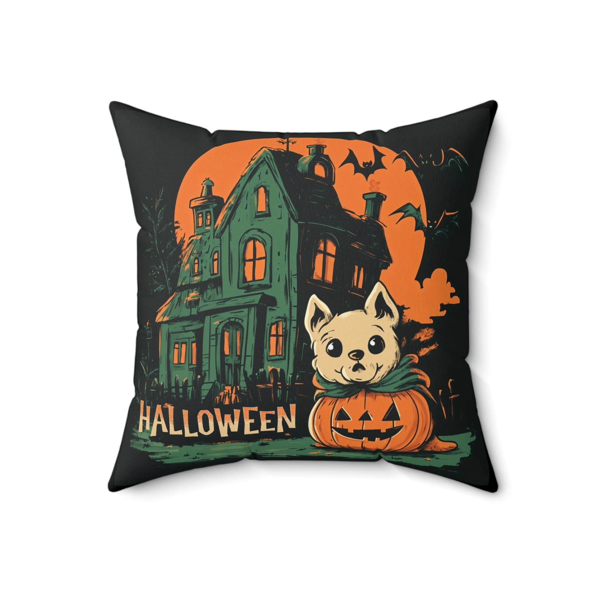 Cute Dog & Haunted House Halloween Throw Pillow – Square Decorative Pillow for Spooky Home Decor