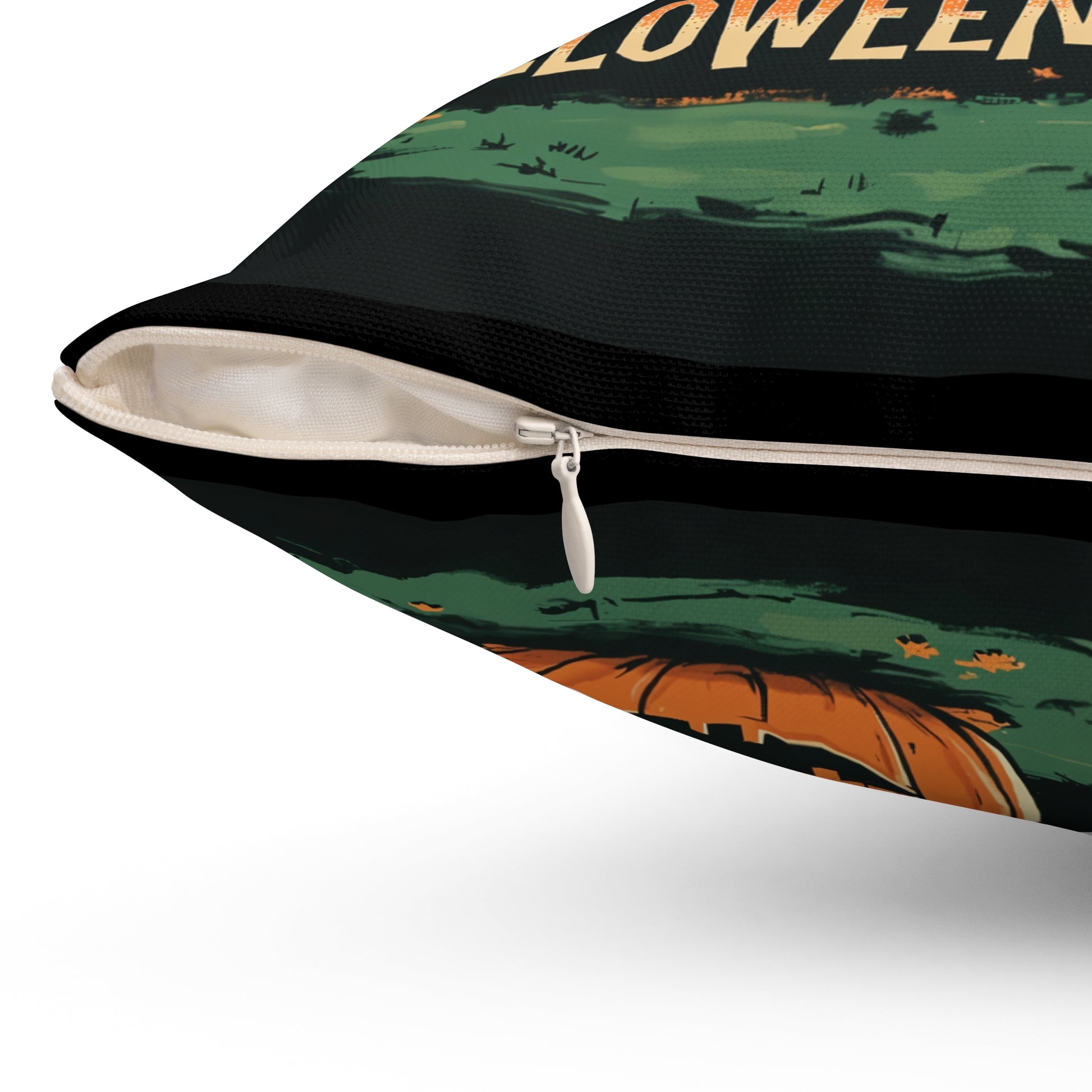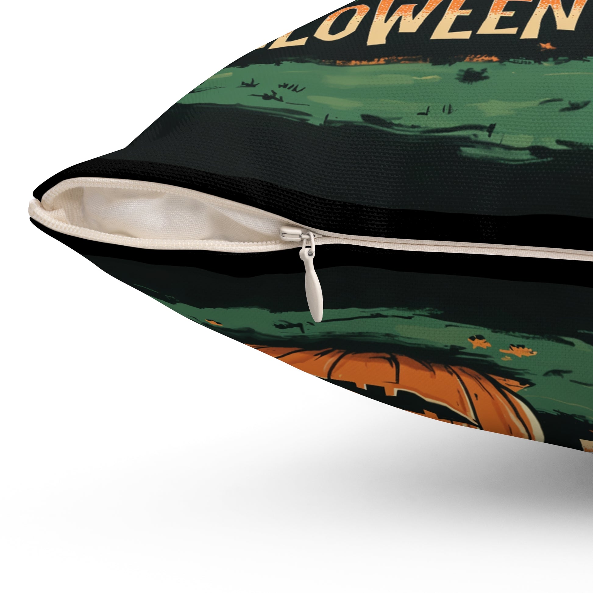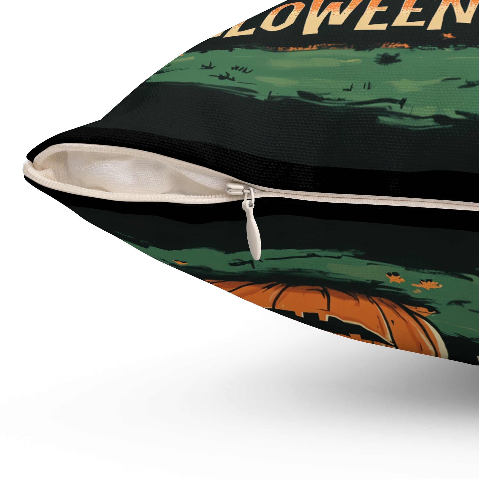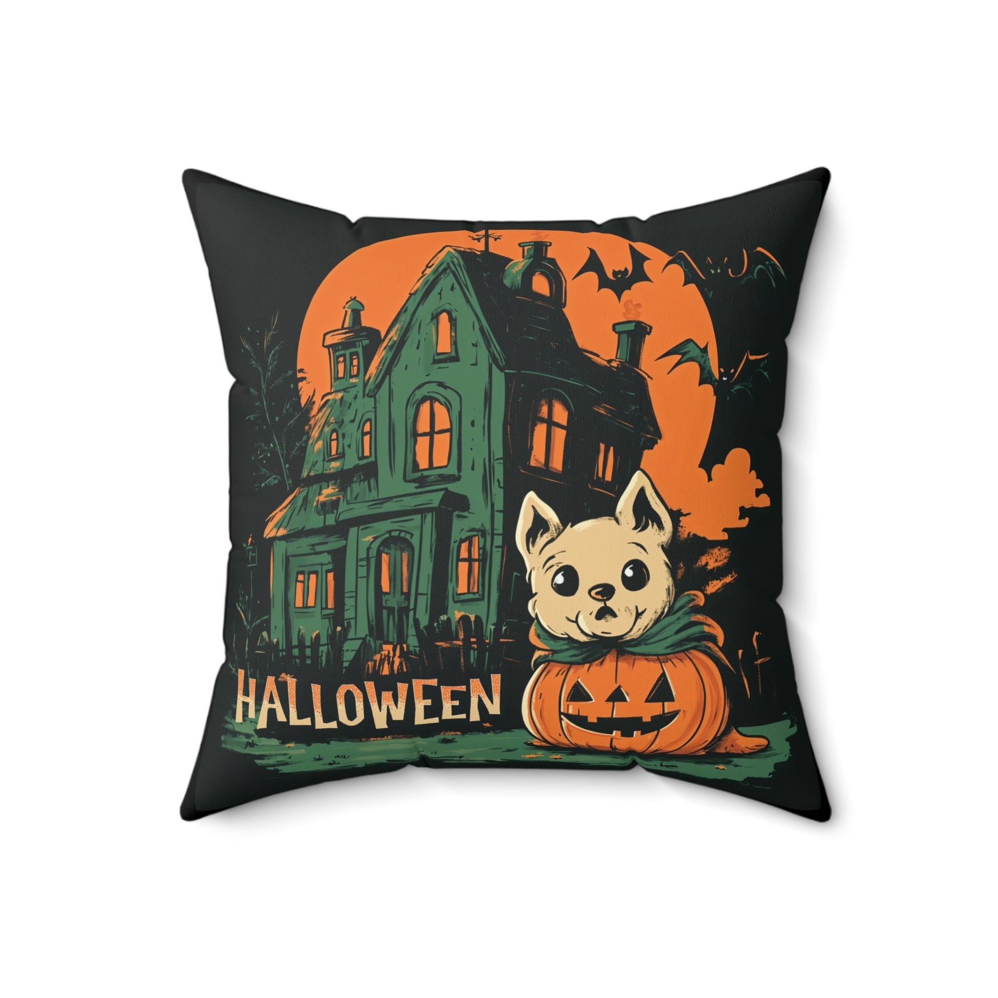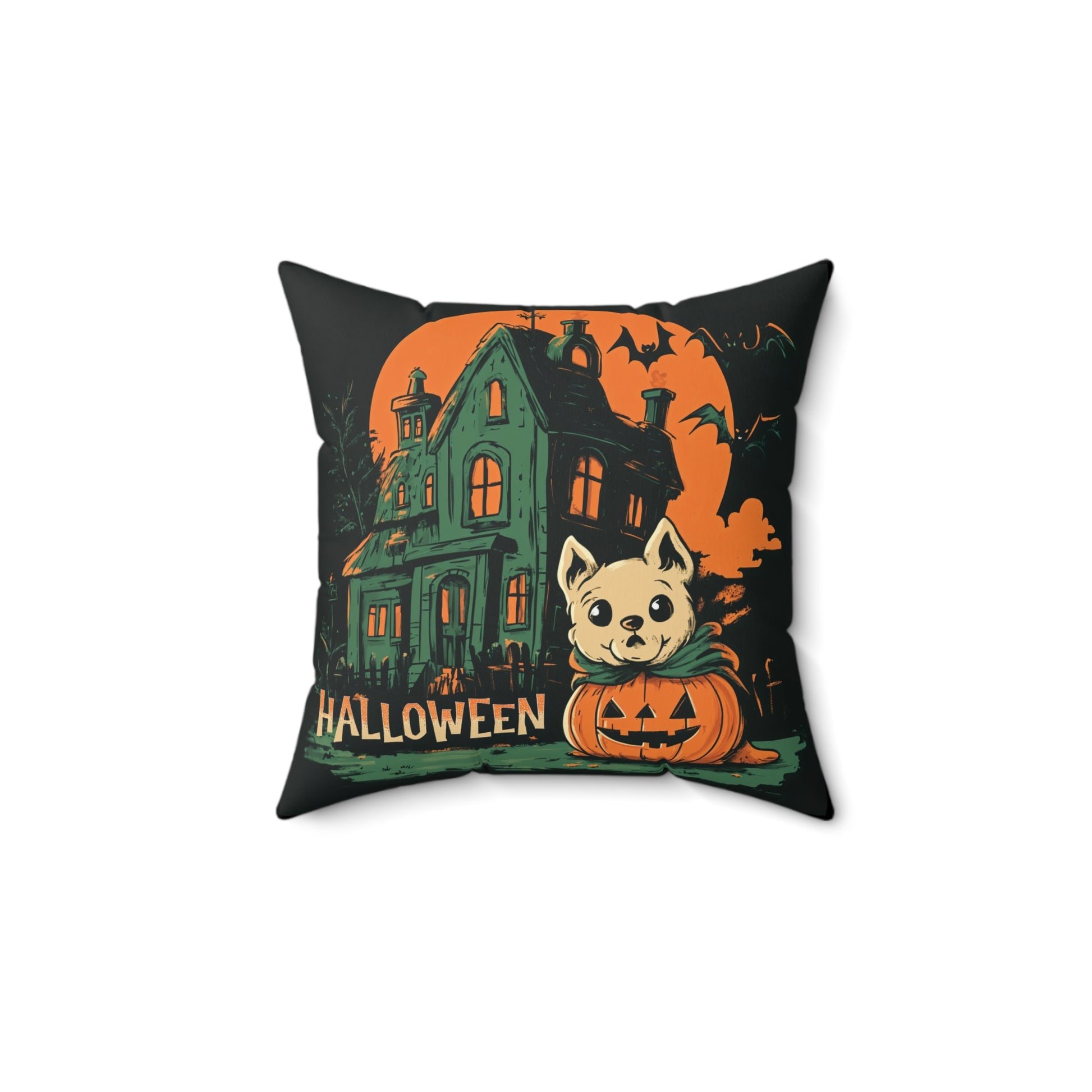 Cute Dog & Haunted House Halloween Throw Pillow – Square Decorative Pillow for Spooky Home Decor