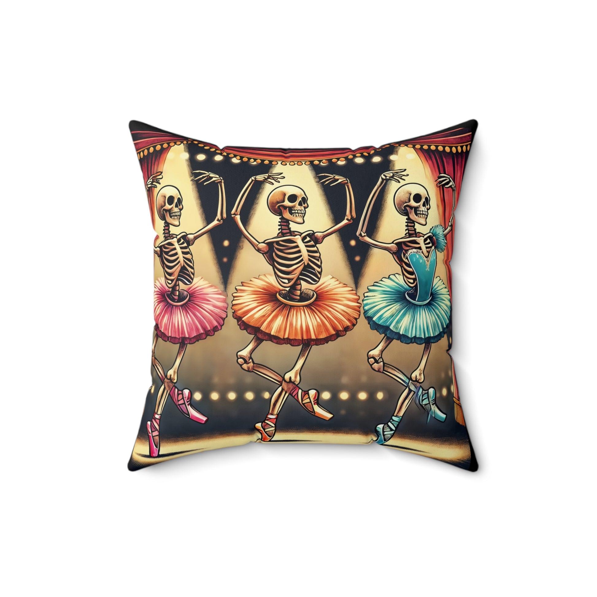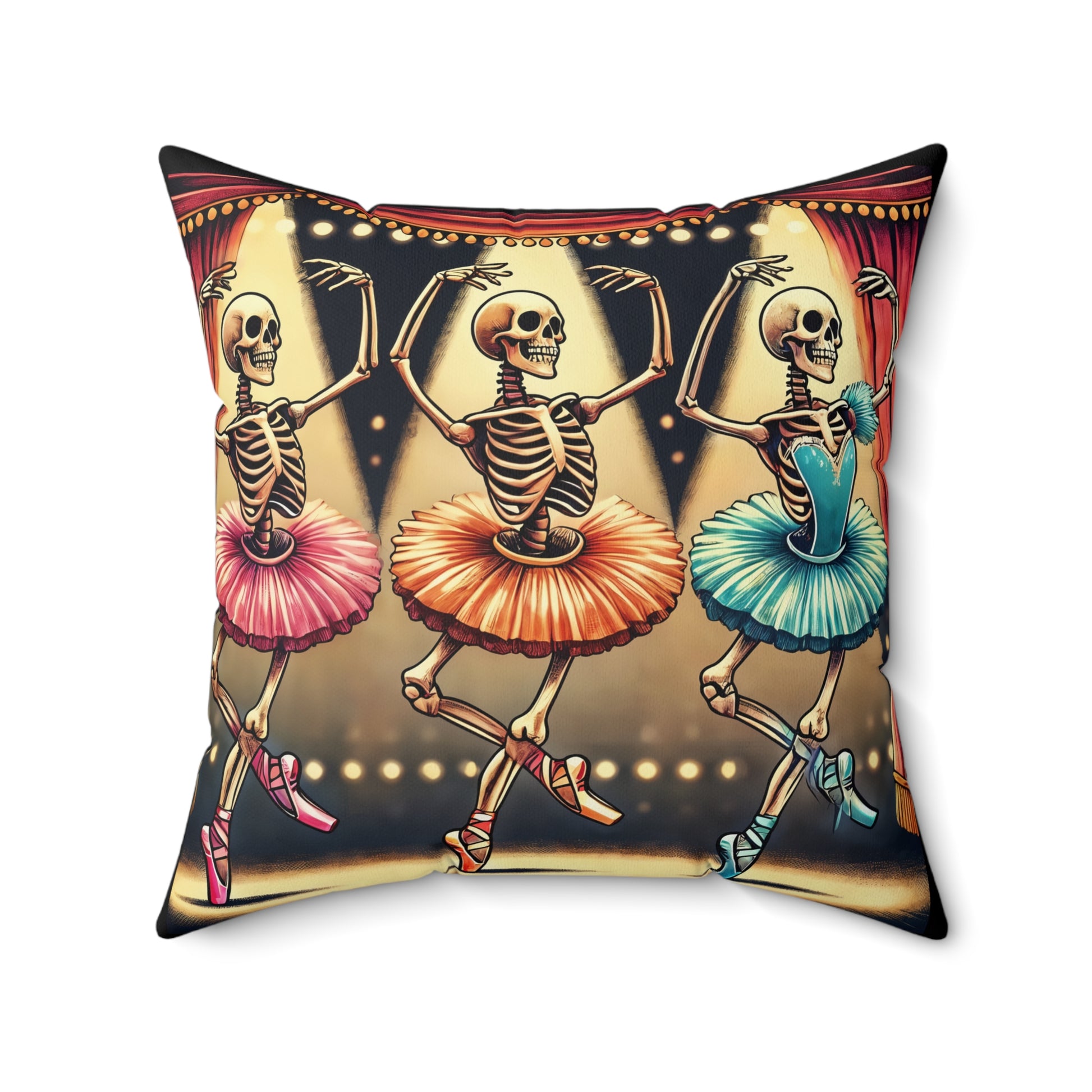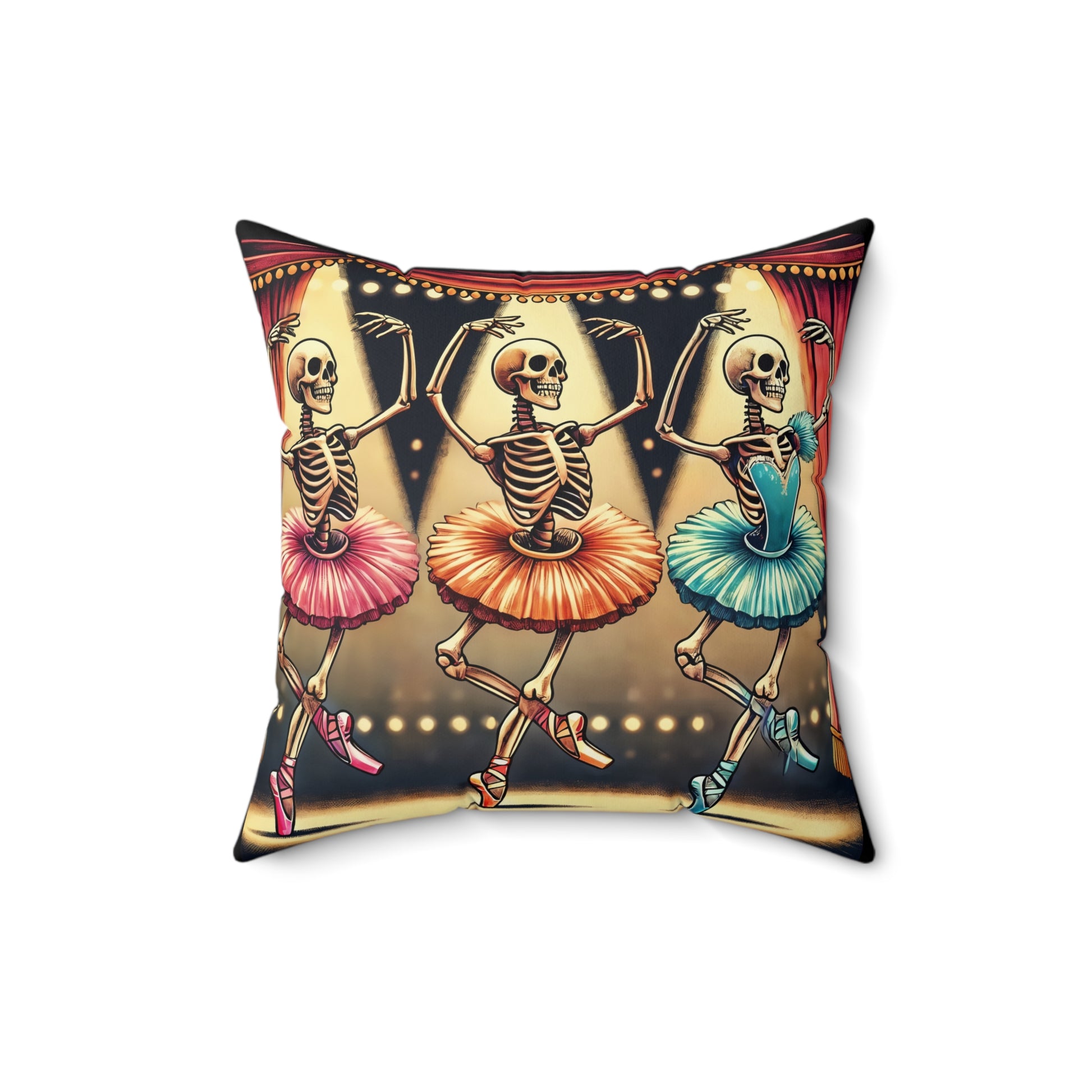 • Square-shaped throw pillow with a dancing skeleton ballerinas design