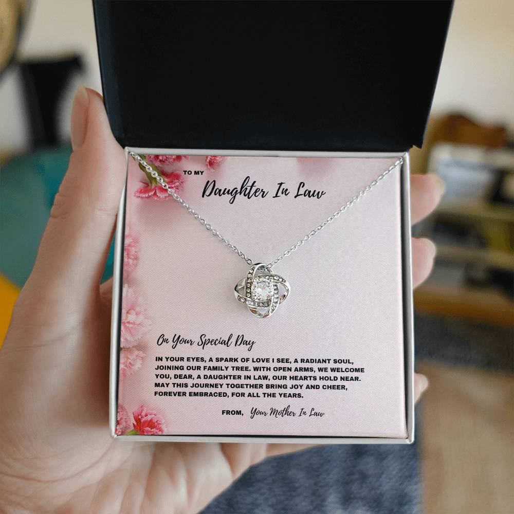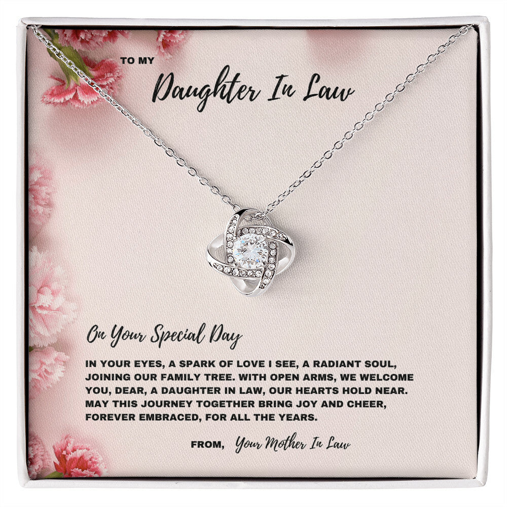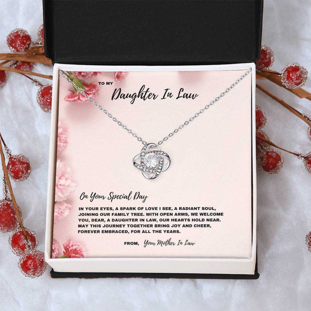 Celebrate the beautiful addition to your family with this Love Knot Necklace for your daughter-in-law. The message card reads, “In your eyes, a spark of love I see, a radiant soul joining our family tree.” This necklace symbolizes her place in the family, making it a heartfelt gift to commemorate the day she became part of your hearts. This piece is sure to melt her heart and reassure her that she has your acceptance, love and support.