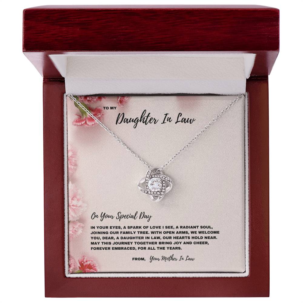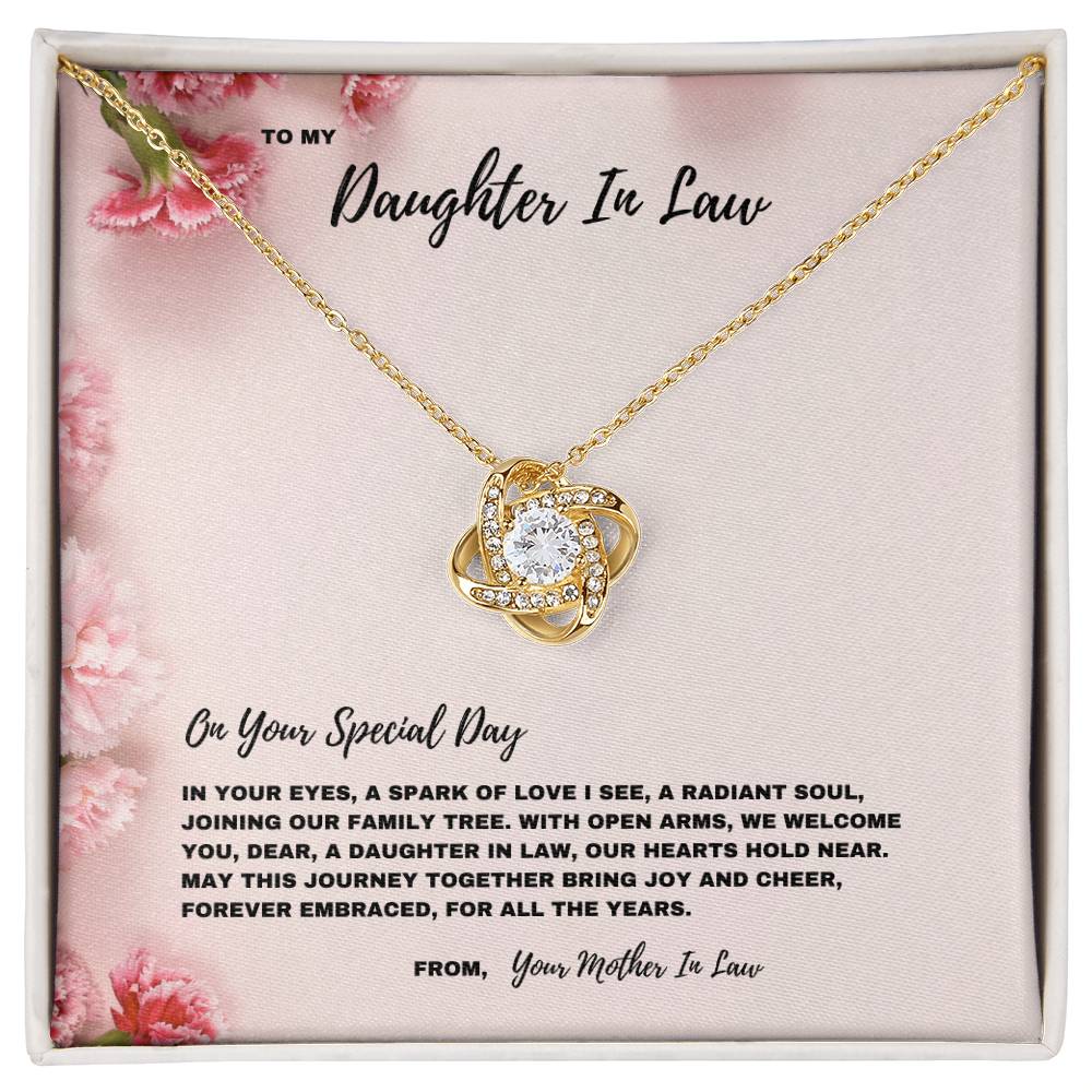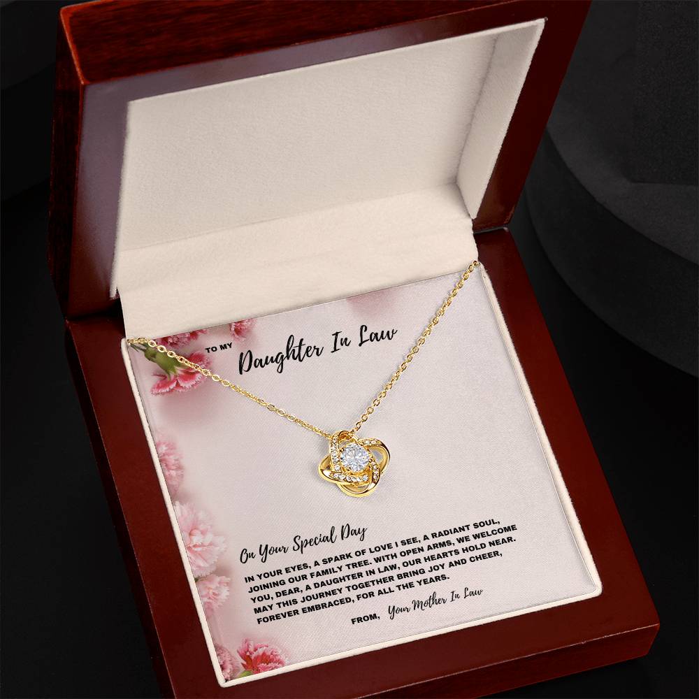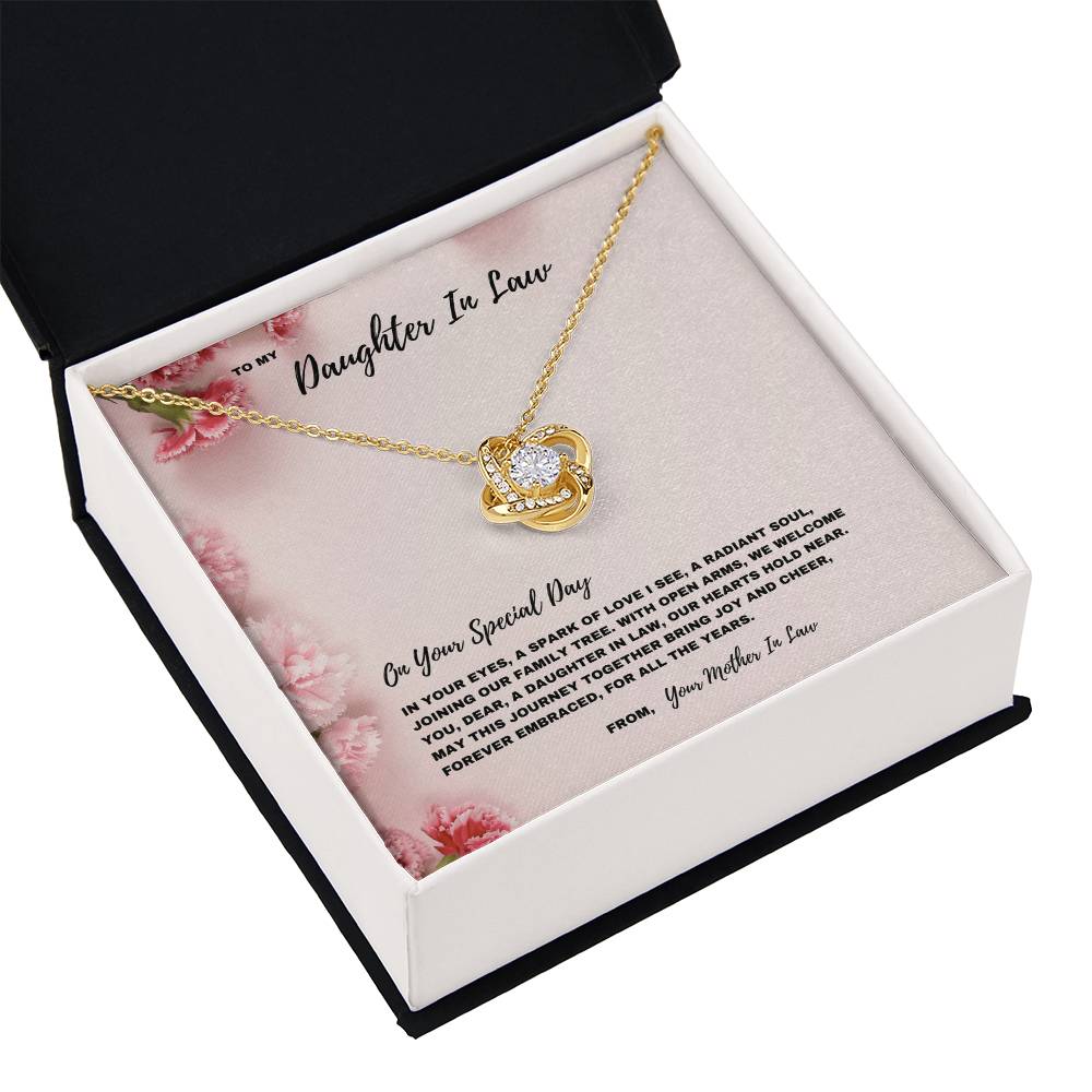 Celebrate the beautiful addition to your family with this Love Knot Necklace for your daughter-in-law. The message card reads, “In your eyes, a spark of love I see, a radiant soul joining our family tree.” This necklace symbolizes her place in the family, making it a heartfelt gift to commemorate the day she became part of your hearts. This piece is sure to melt her heart and reassure her that she has your acceptance, love and support.