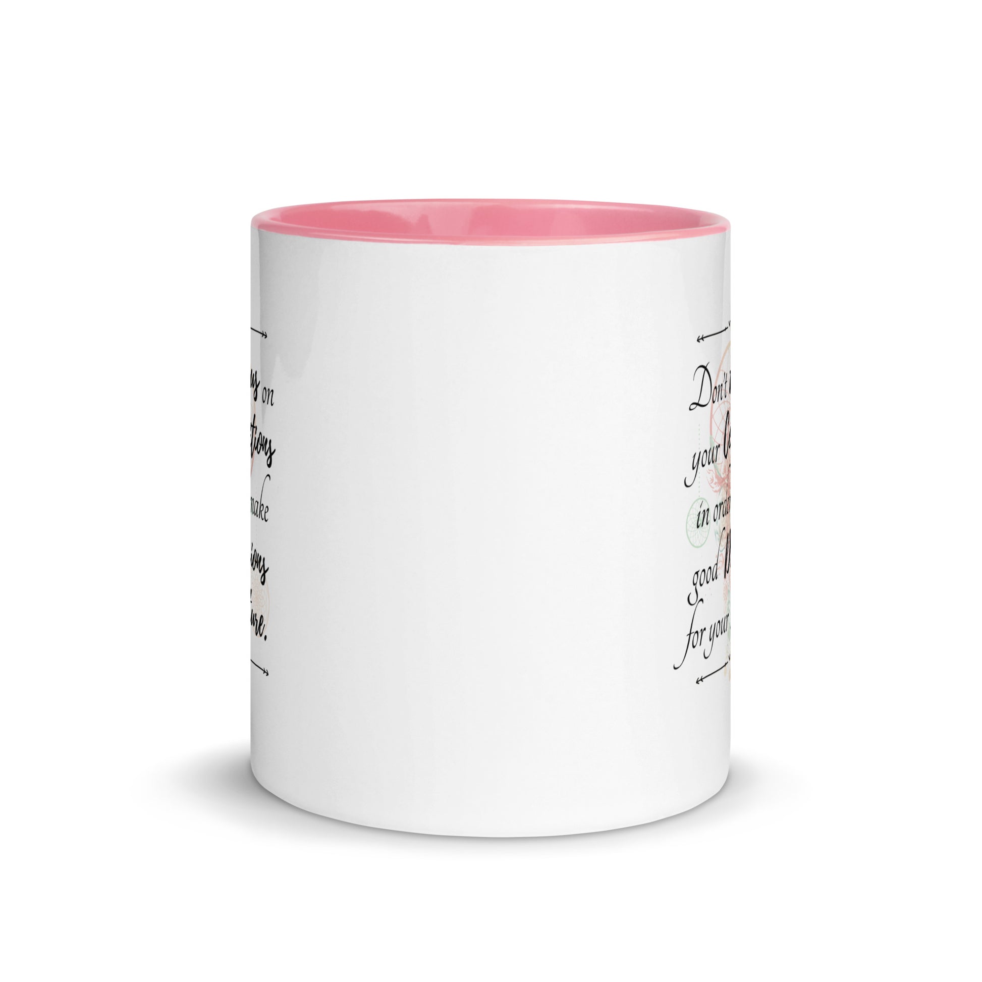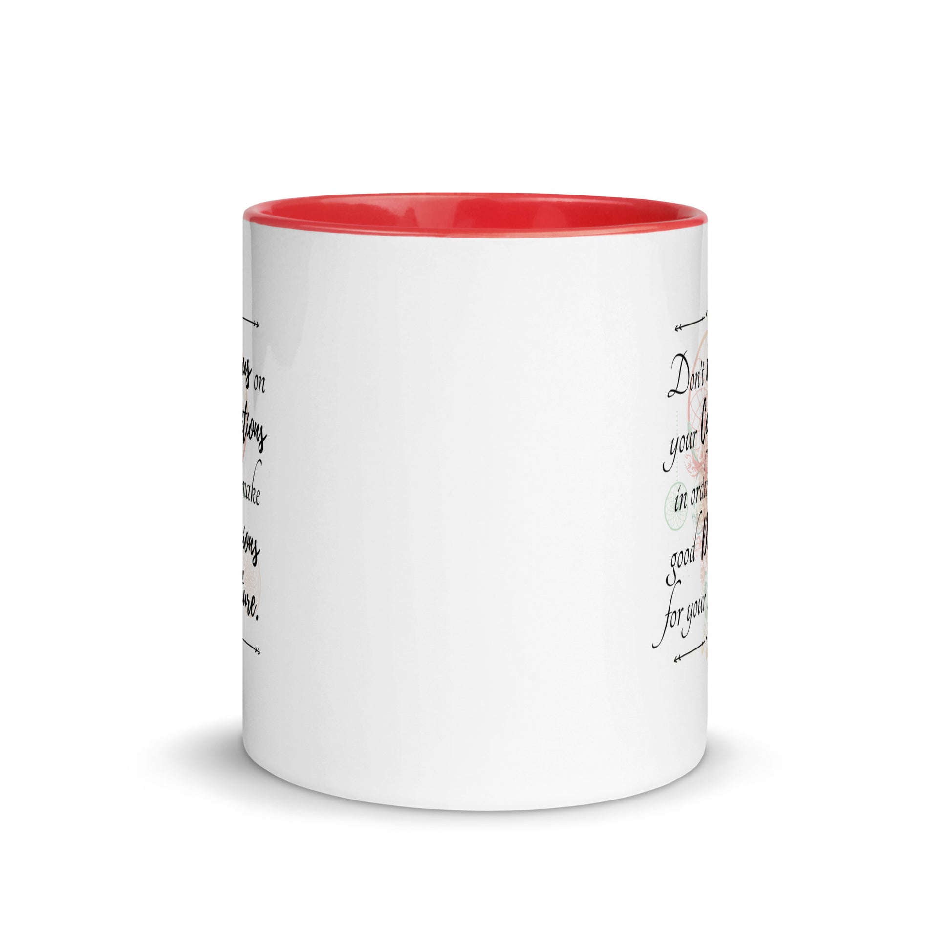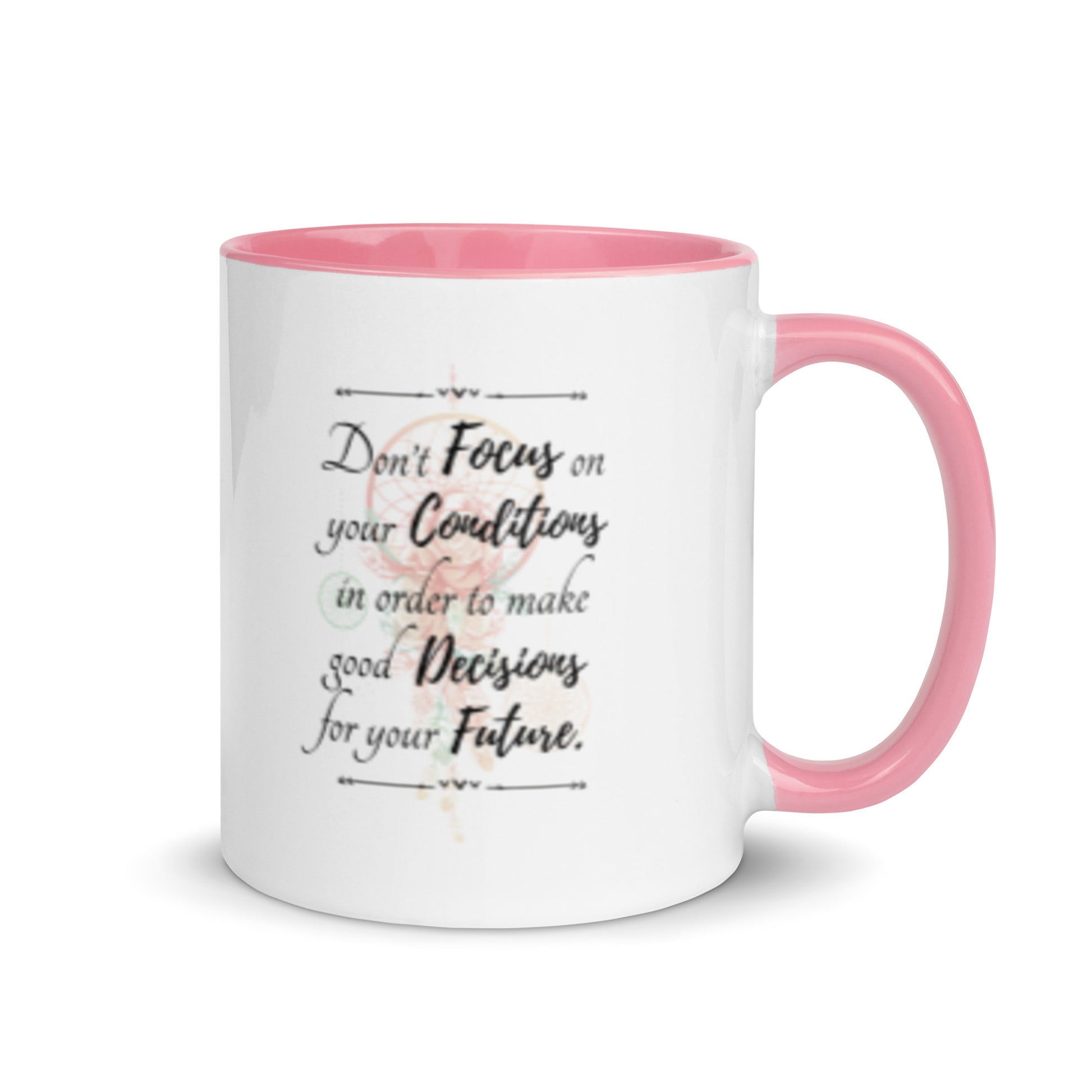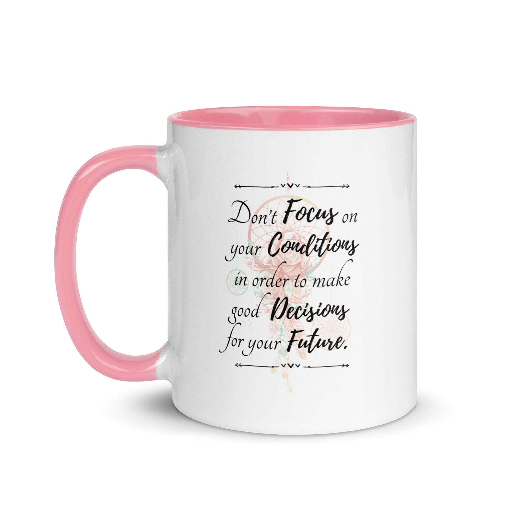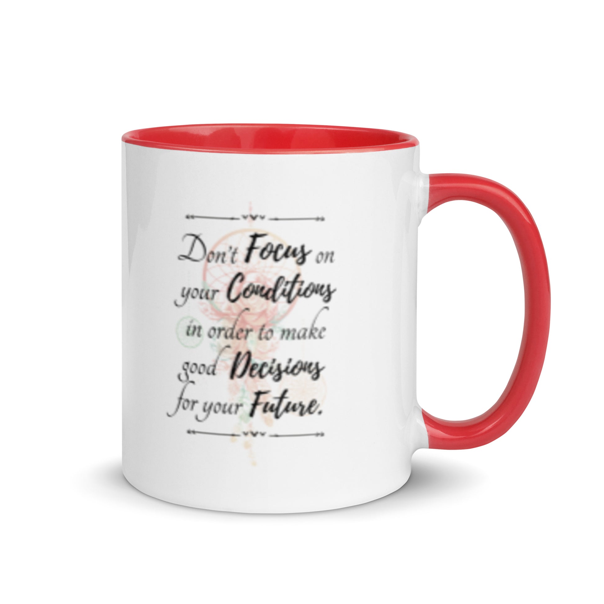Los colores vibrantes que adornan el borde, el asa y el interior de esta taza infunden energía a tu rutina matutina. Disfruta de tu café o té mientras reflexionas sobre el mensaje empoderador: "No te centres en tus condiciones para tomar buenas decisiones para tu futuro". Es un mantra de positividad y visión de futuro que marcará la pauta para un día exitoso.