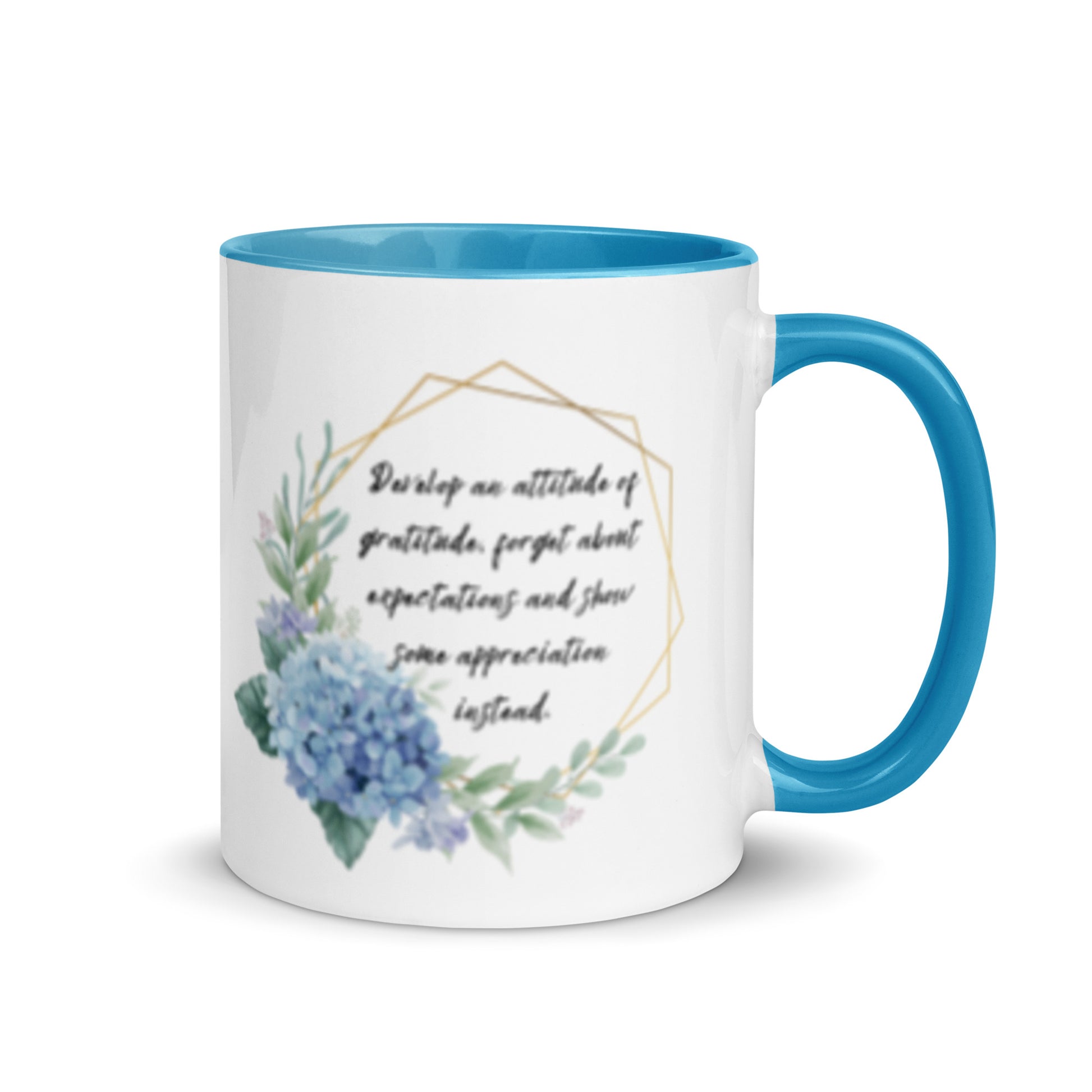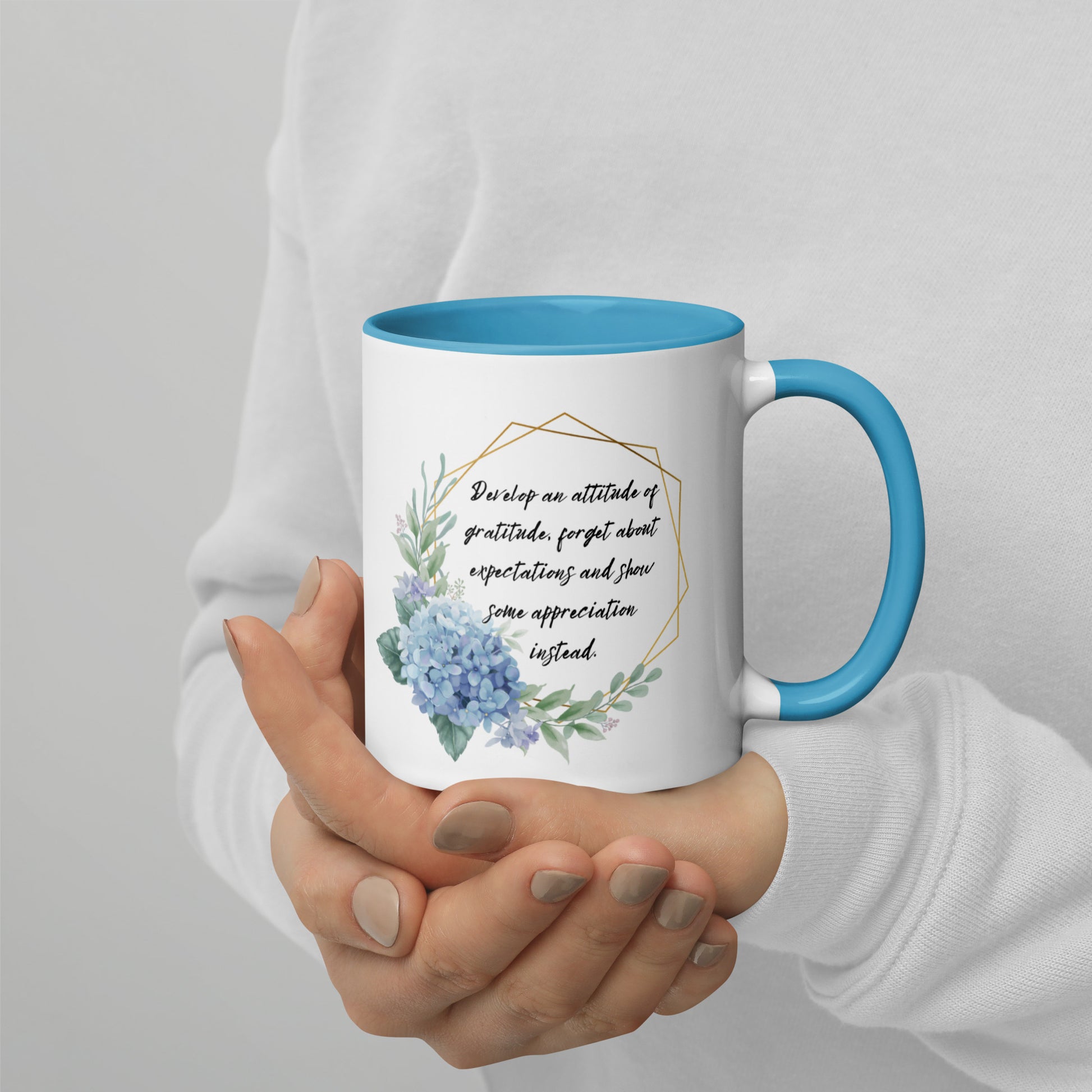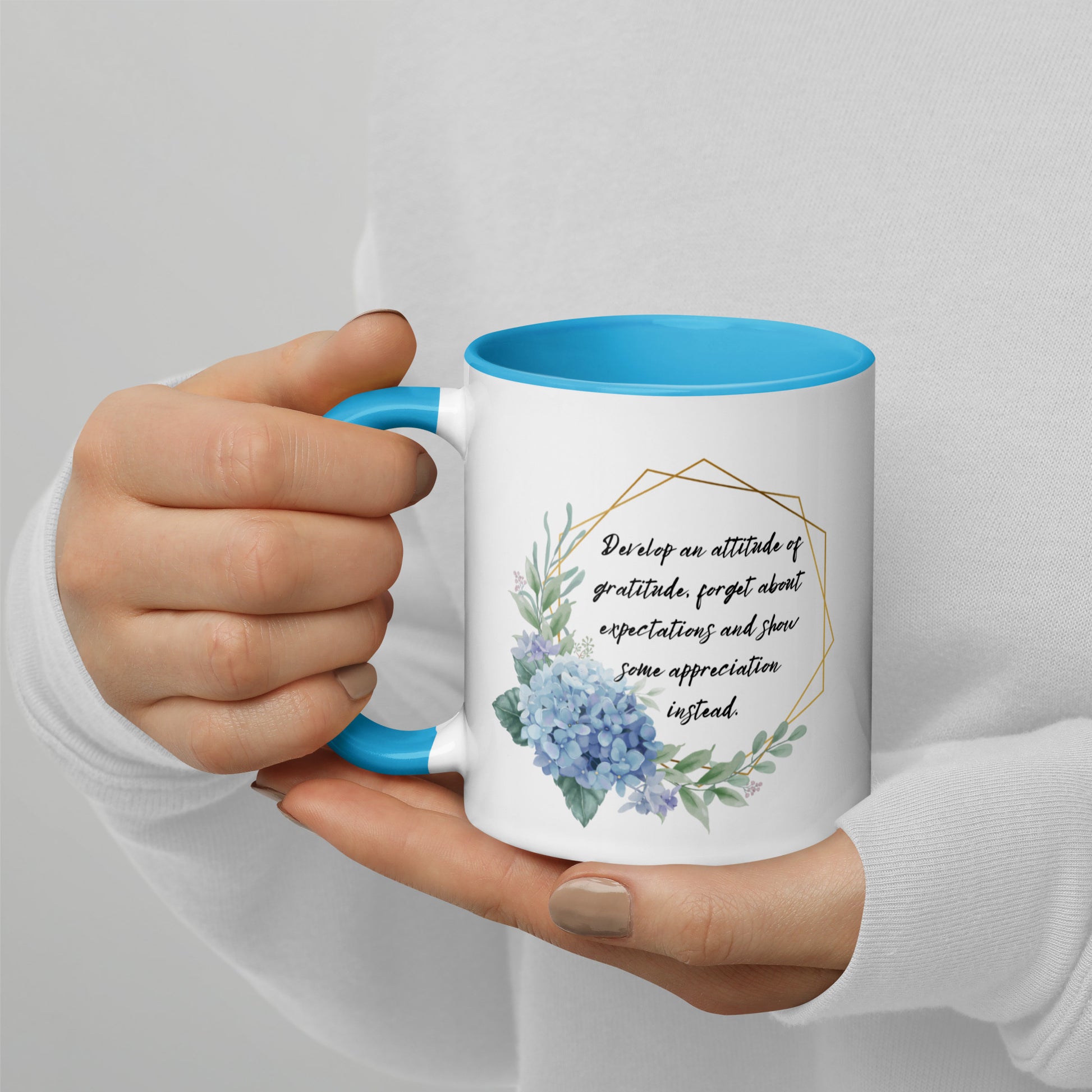 Adornada con colores vibrantes en el borde, el asa y el interior, esta taza infunde calidez y positividad a tu día. Cada sorbo es una invitación a reflexionar sobre los dones de la vida, a apreciar los pequeños y grandes momentos y a dejar de lado las expectativas poco realistas.