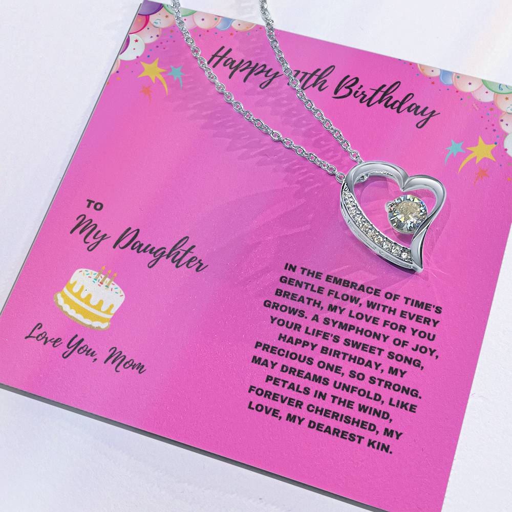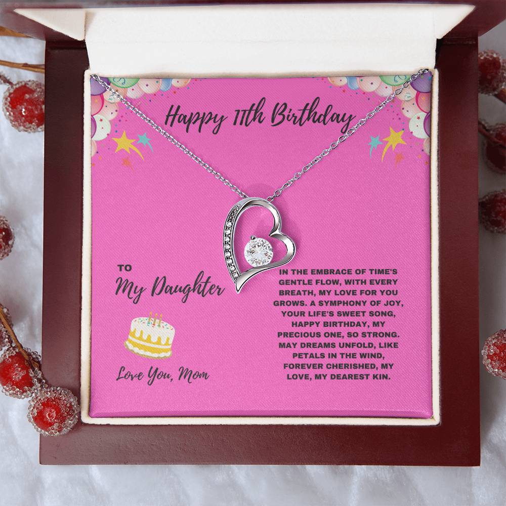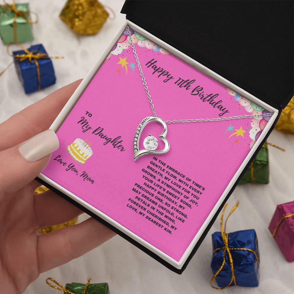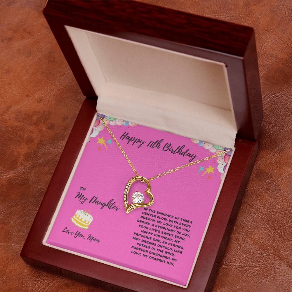 Celebra el cumpleaños número 11 de tu hija con un regalo de joyería que encapsula el amor incondicional de una madre. Este collar especial Forever Love viene acompañado de una tarjeta con un mensaje bellamente elaborado, donde las palabras de amor y alegría celebran los hitos en la vida de tu hija.