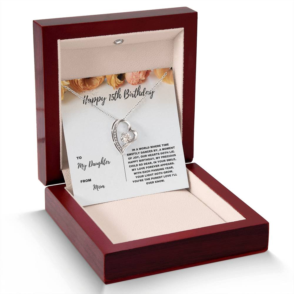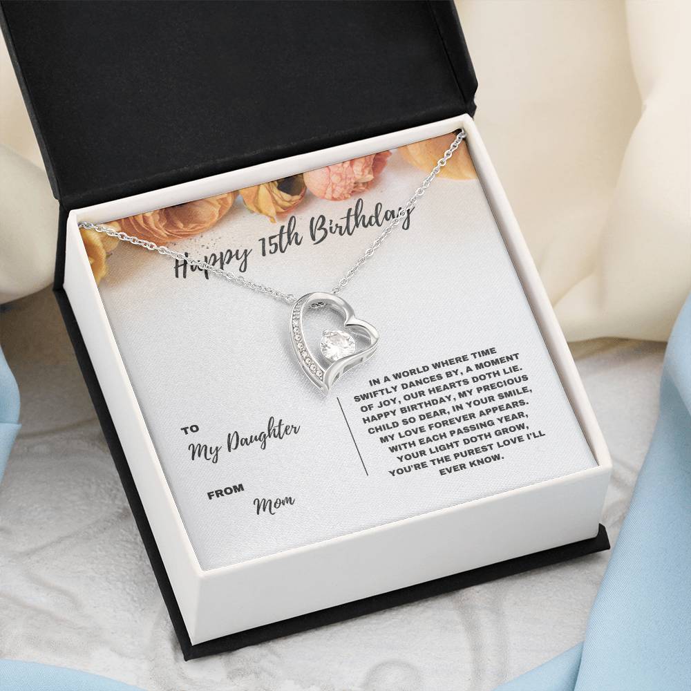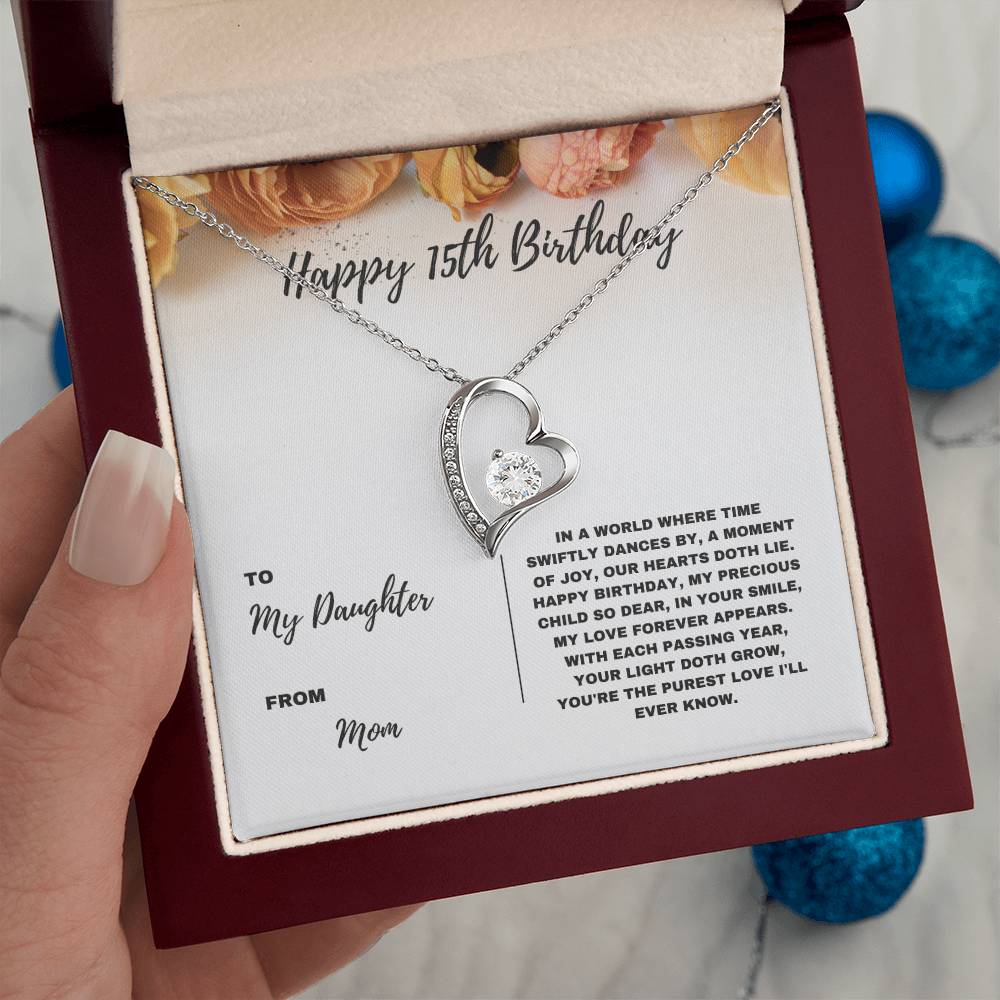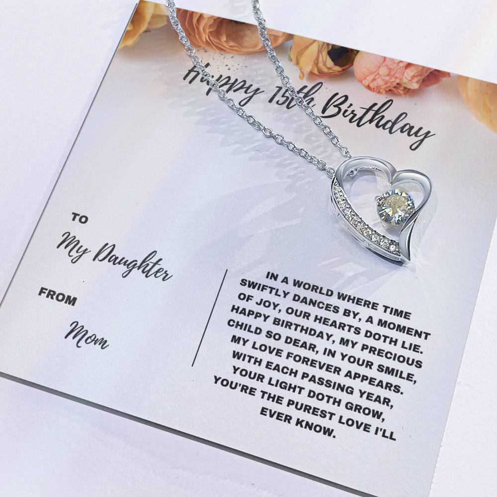 Celebre el cumpleaños número 15 de su hija con este hermoso collar Forever Love, acompañado de una tarjeta con un mensaje sincero de mamá. El verso poético expresa el profundo amor que siente como madre, lo que lo convierte en un regalo inolvidable para el día especial de su hija.