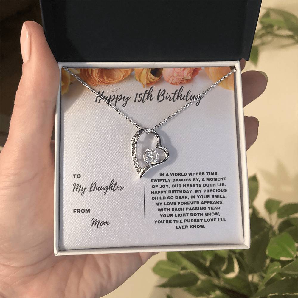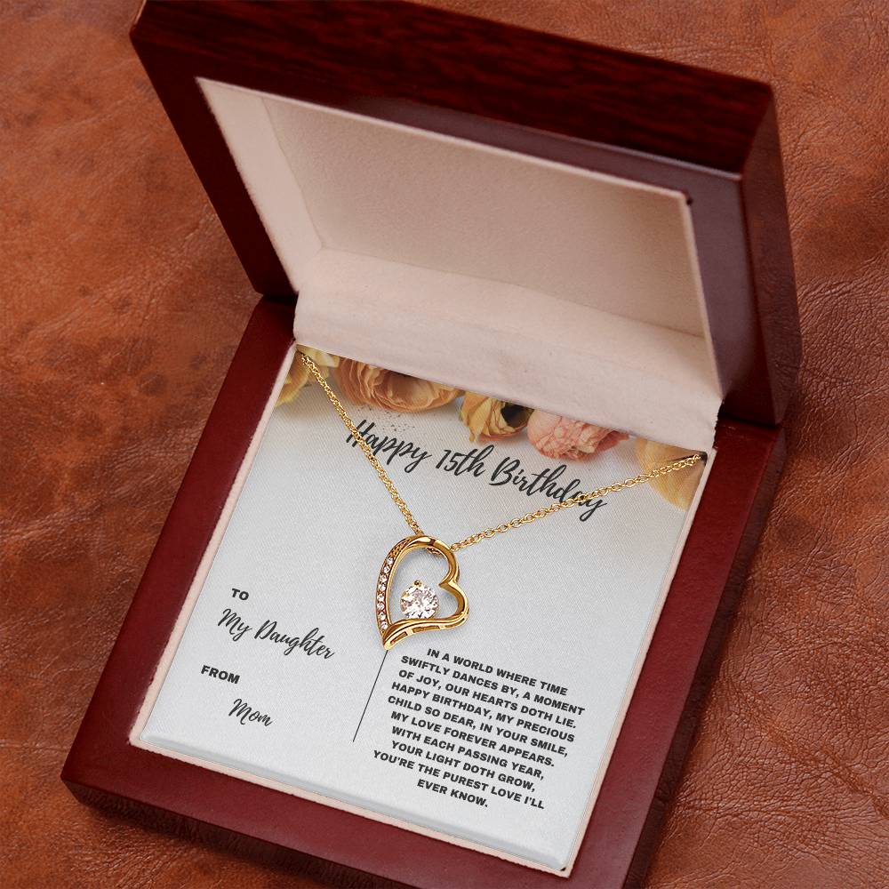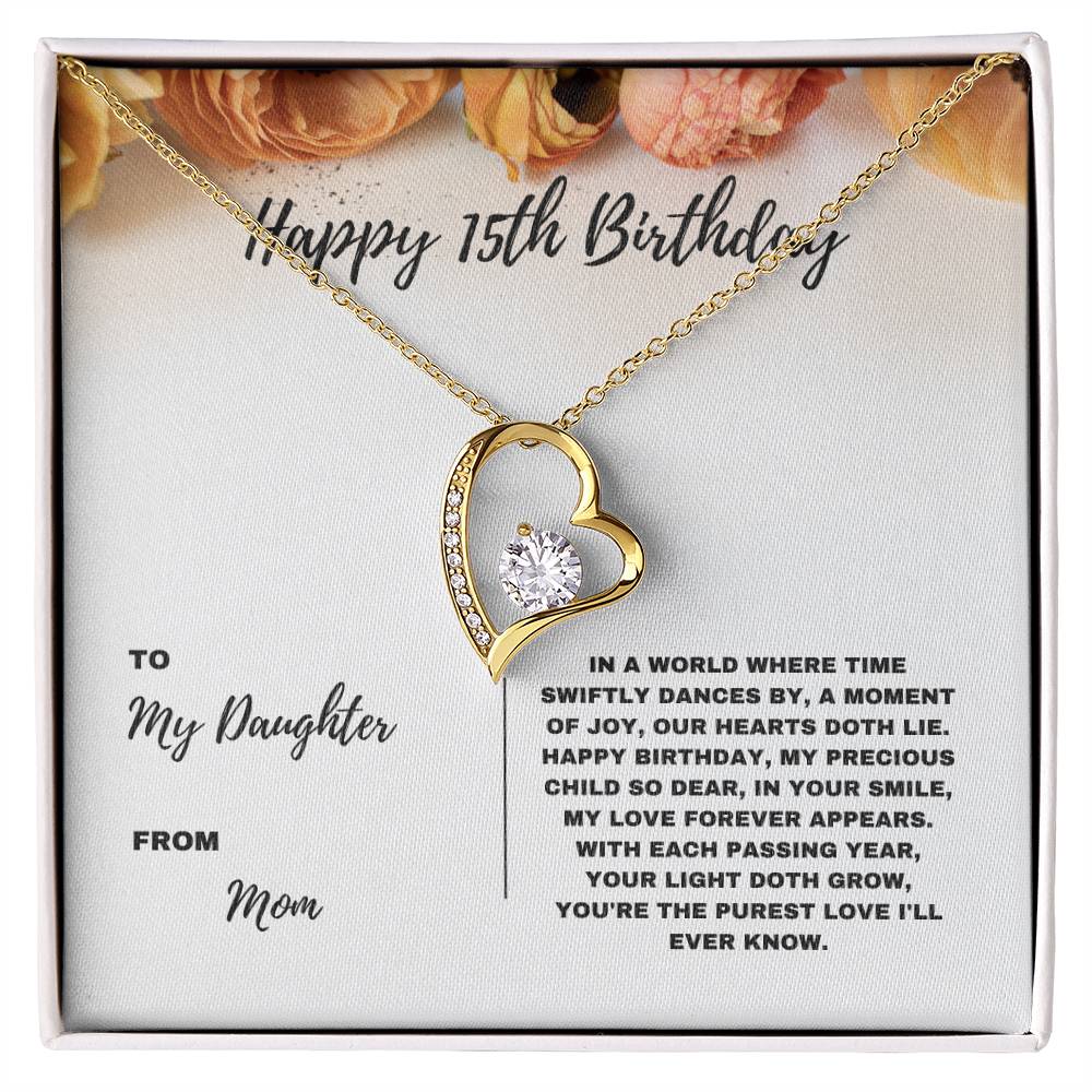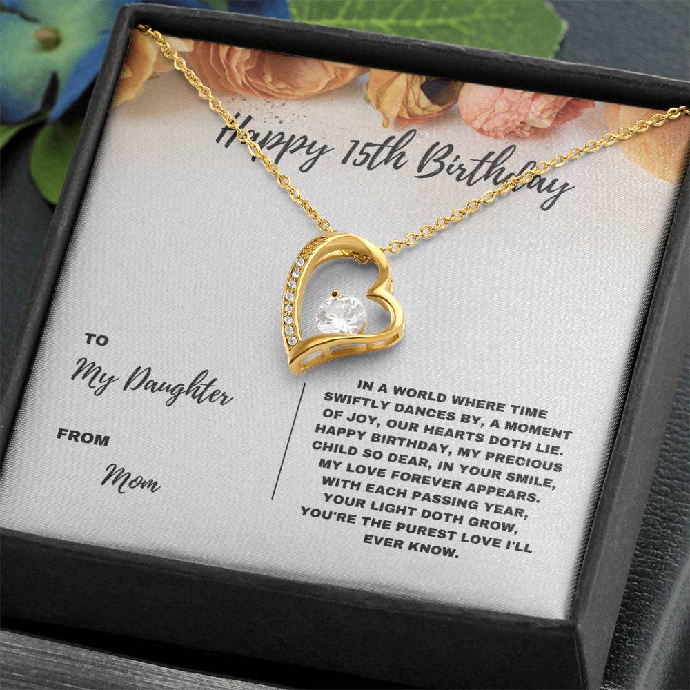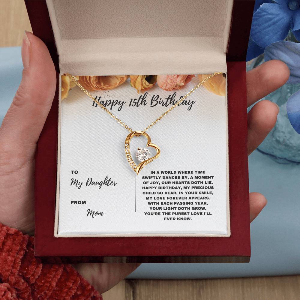 Celebre el cumpleaños número 15 de su hija con este hermoso collar Forever Love, acompañado de una tarjeta con un mensaje sincero de mamá. El verso poético expresa el profundo amor que siente como madre, lo que lo convierte en un regalo inolvidable para el día especial de su hija.
