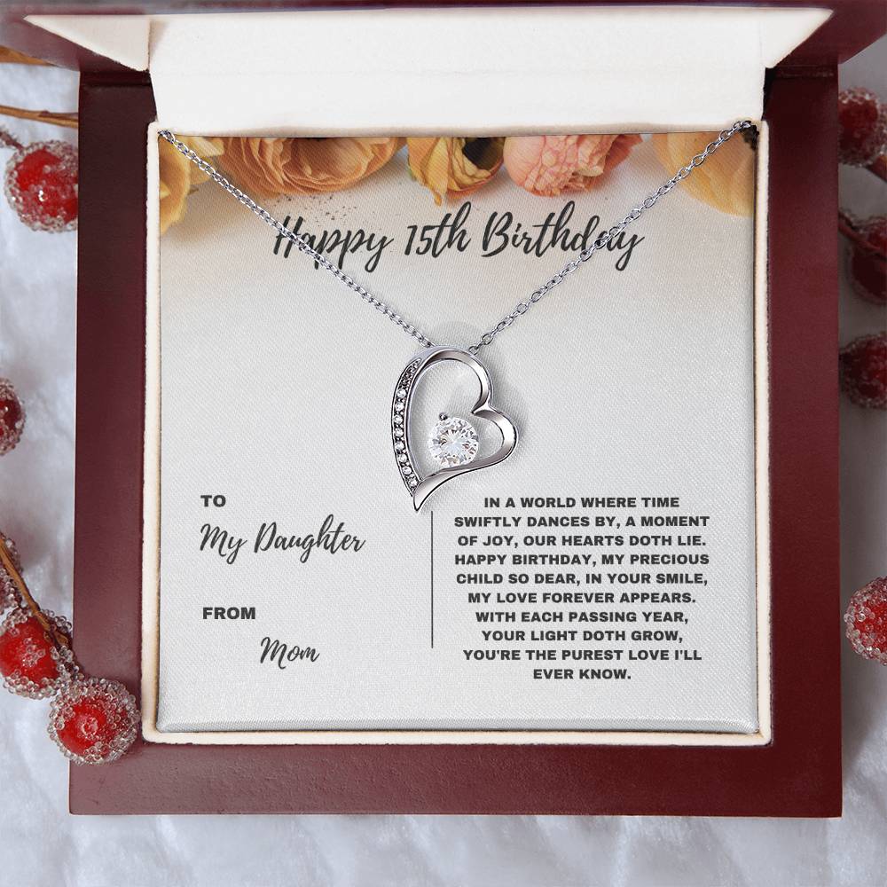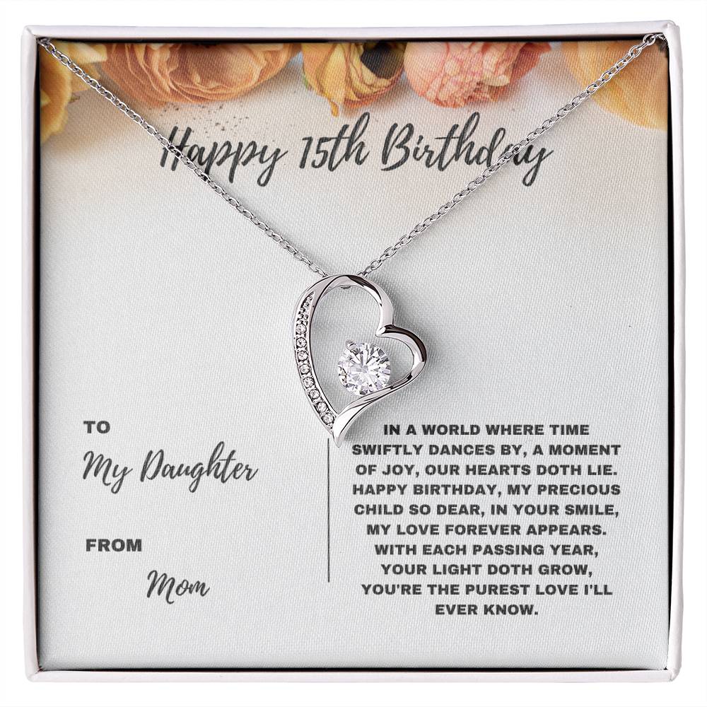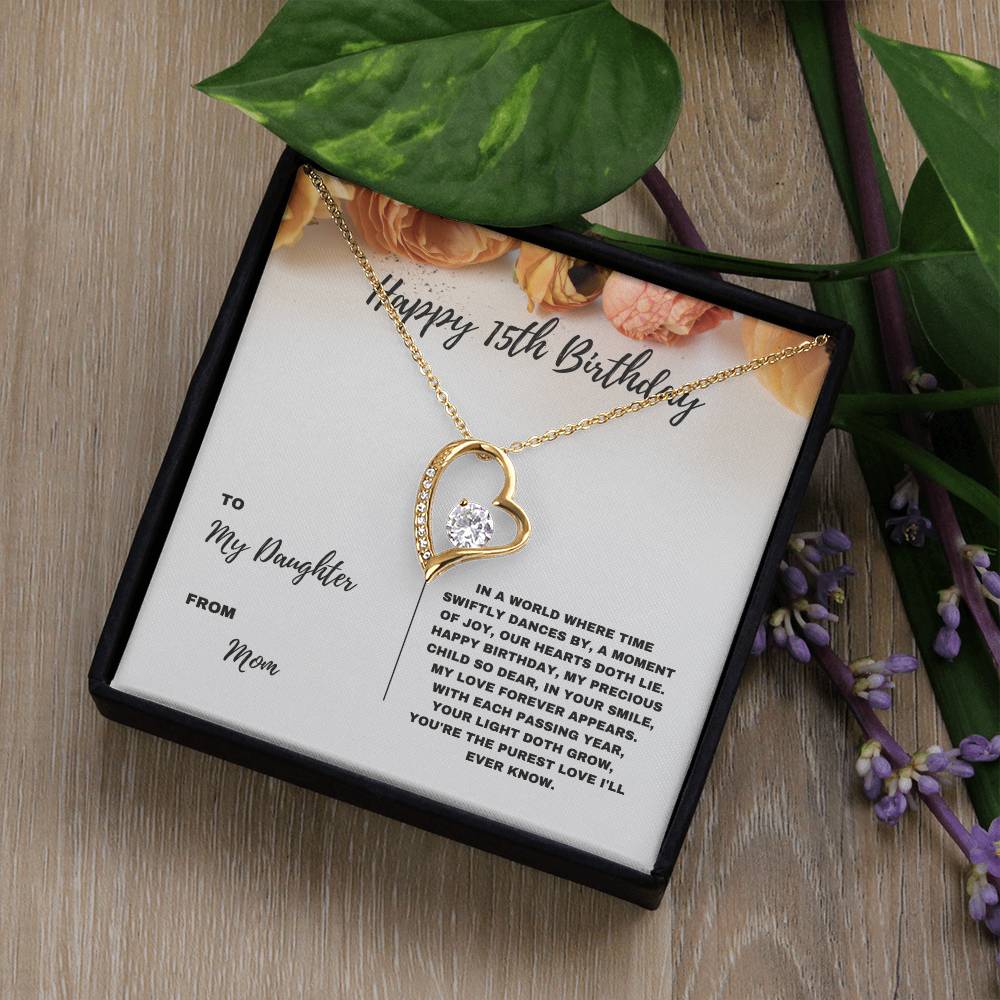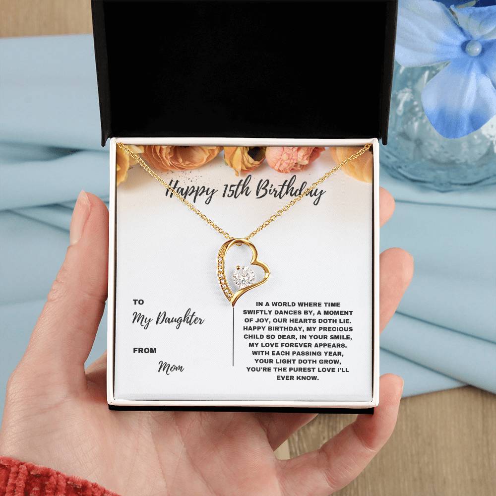 Celebre el cumpleaños número 15 de su hija con este hermoso collar Forever Love, acompañado de una tarjeta con un mensaje sincero de mamá. El verso poético expresa el profundo amor que siente como madre, lo que lo convierte en un regalo inolvidable para el día especial de su hija.