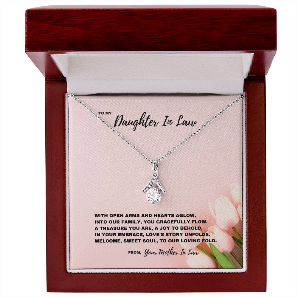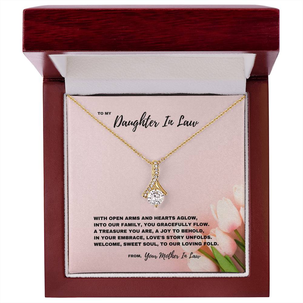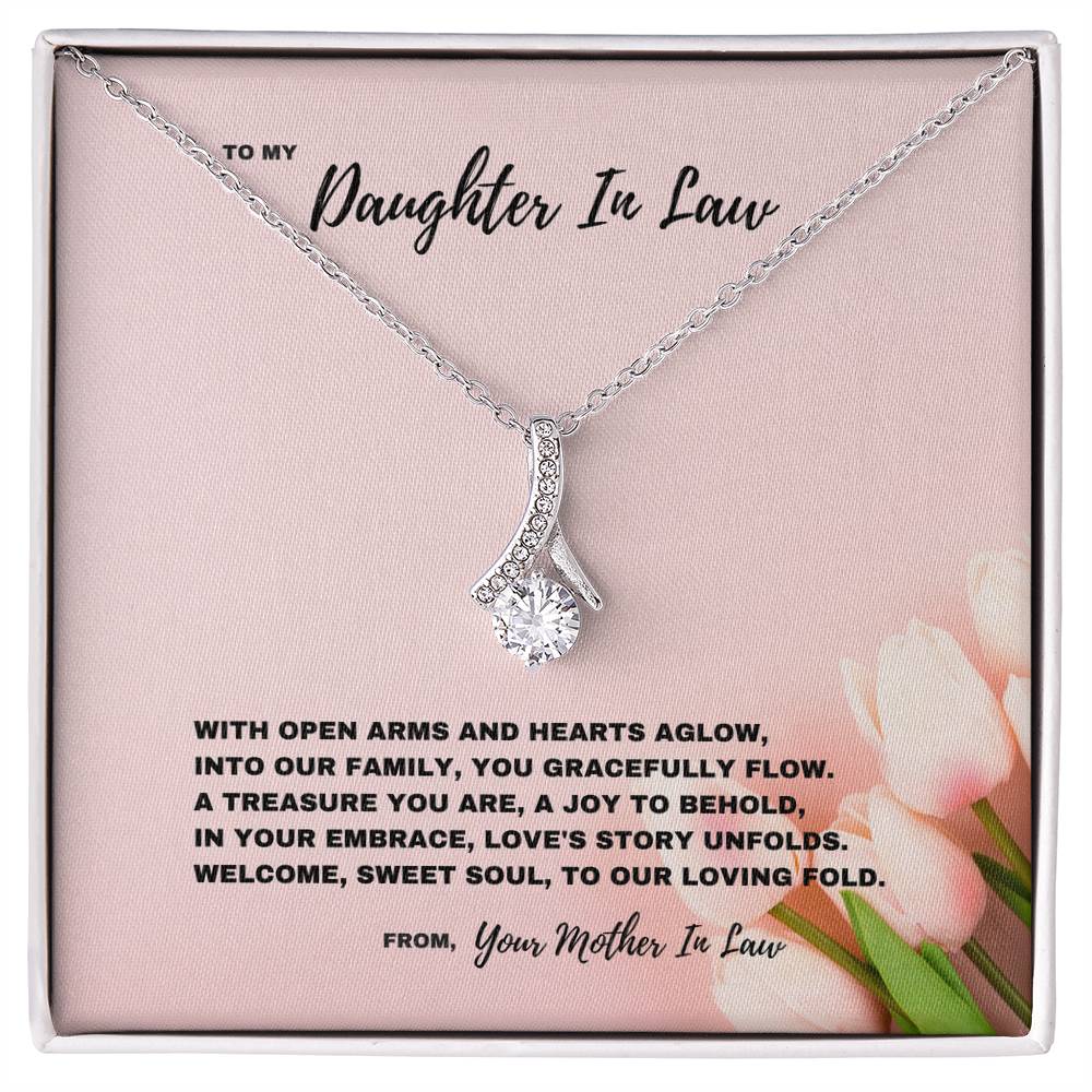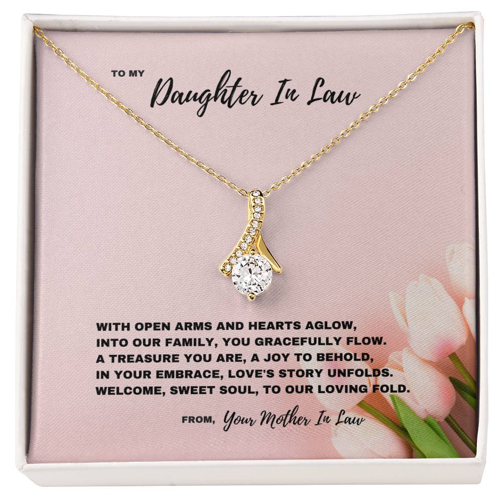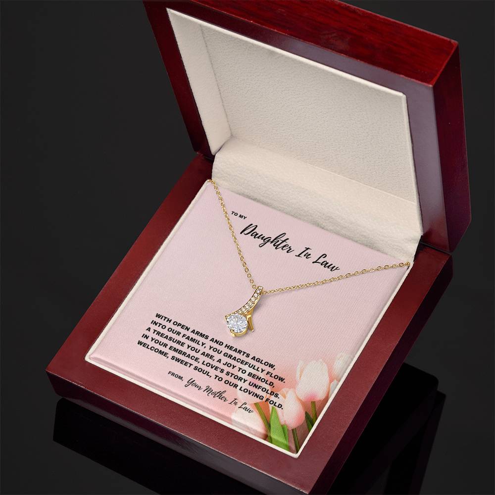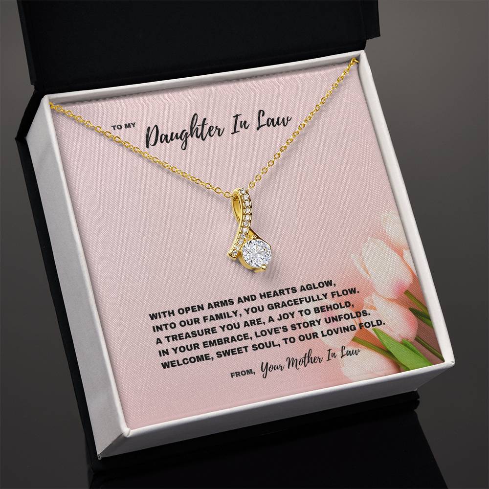 Welcome your daughter-in-law with this elegant Alluring Beauty Necklace, symbolizing the love and light she brings to your family. The message card reads, “With open arms and hearts aglow, into our family, you gracefully flow.” This necklace is the perfect gift to celebrate the beginning of a lifelong bond filled with love and joy. This piece is sure to melt her heart and reassure her that she has your acceptance, love and support.