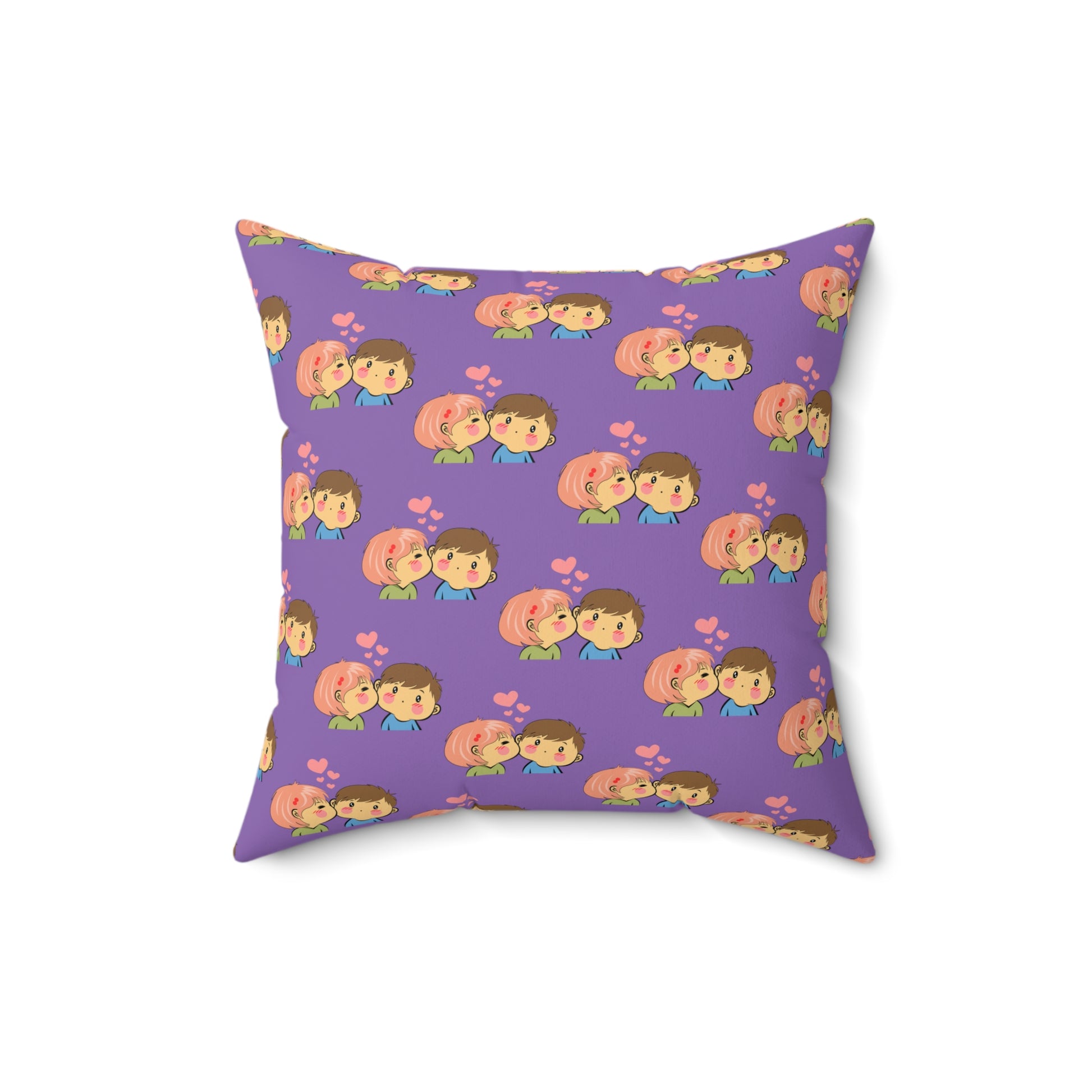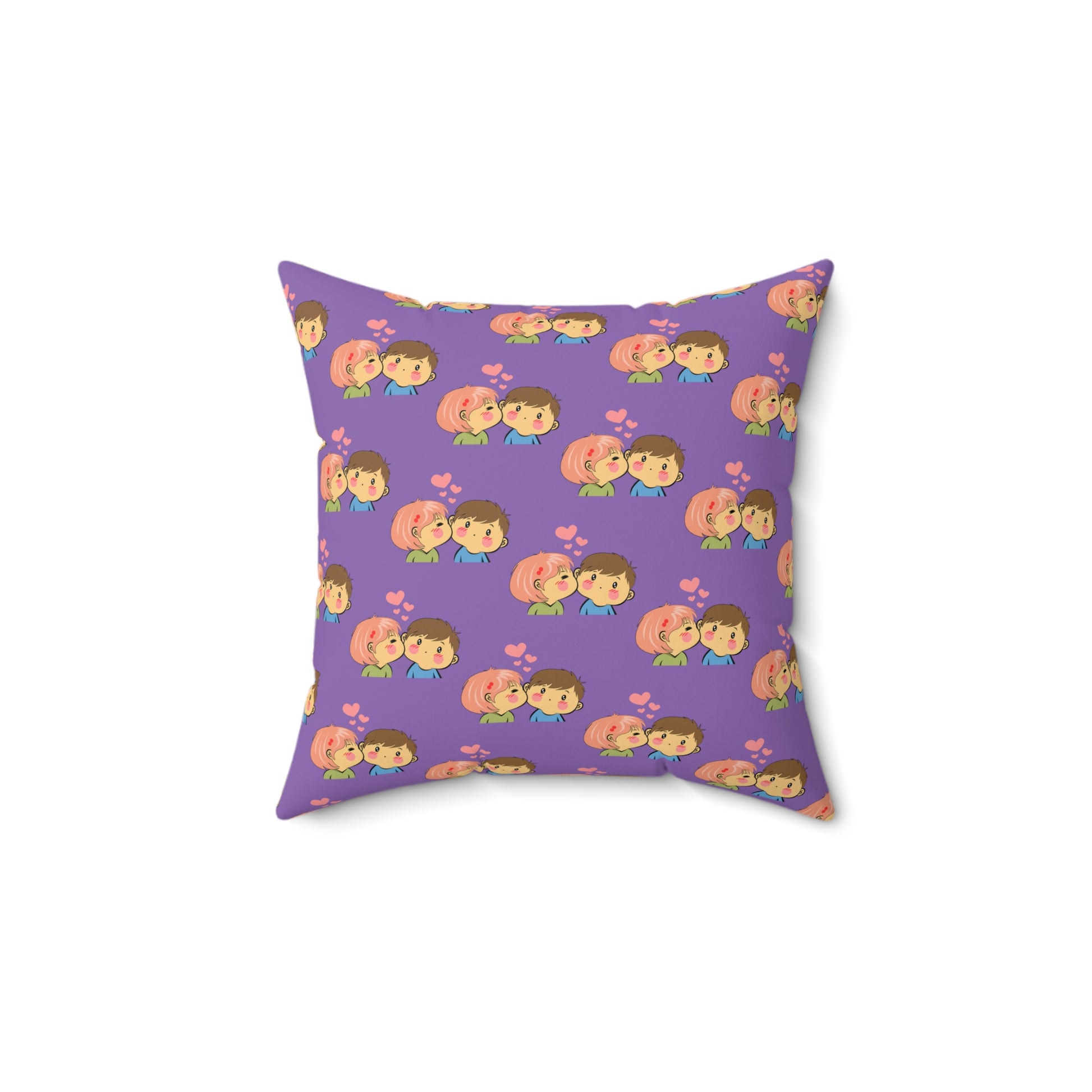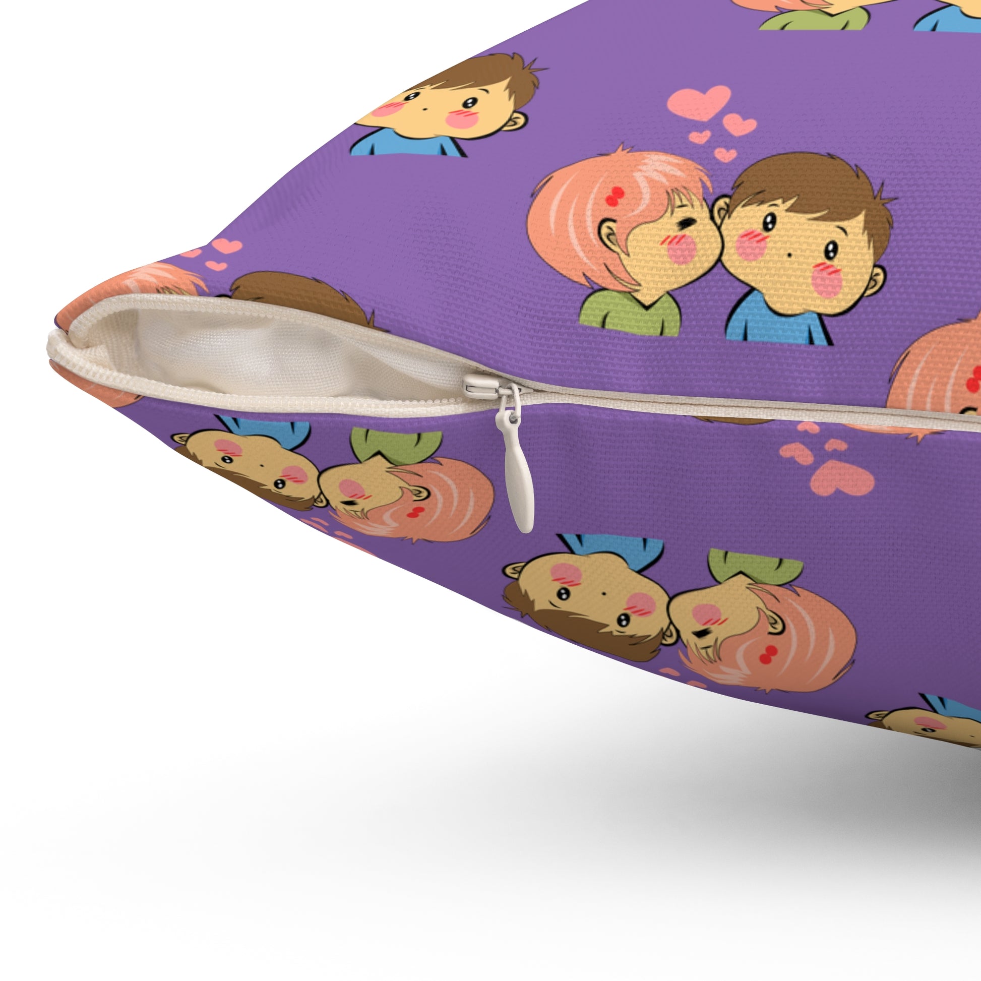 Presentamos el cojín decorativo con estampado "Love's Embrace: Purple Kiss", un toque emotivo para tu espacio. Este exquisito cojín decorativo presenta un dulce diseño de una niña besando a un niño, unidos por un efecto de corazón. Disponible en varios tamaños, es una pieza personalizada.