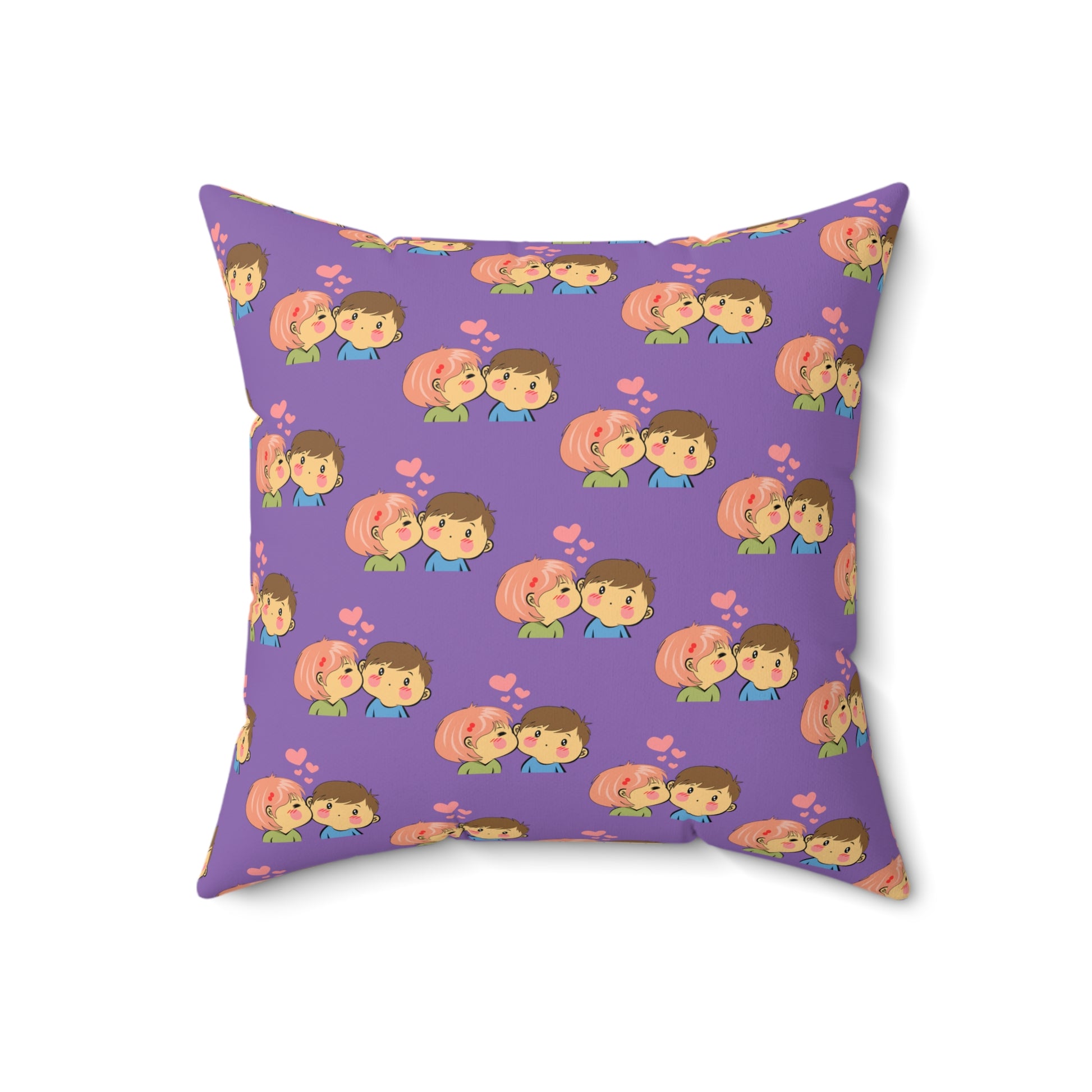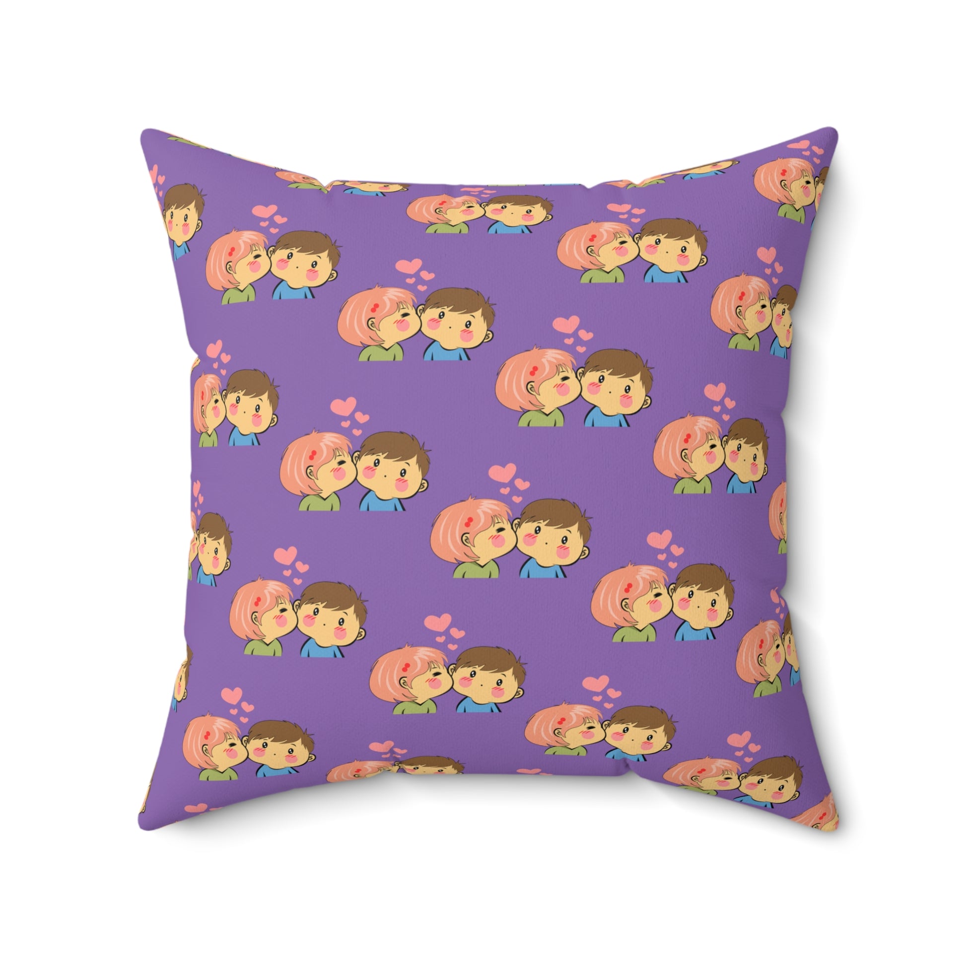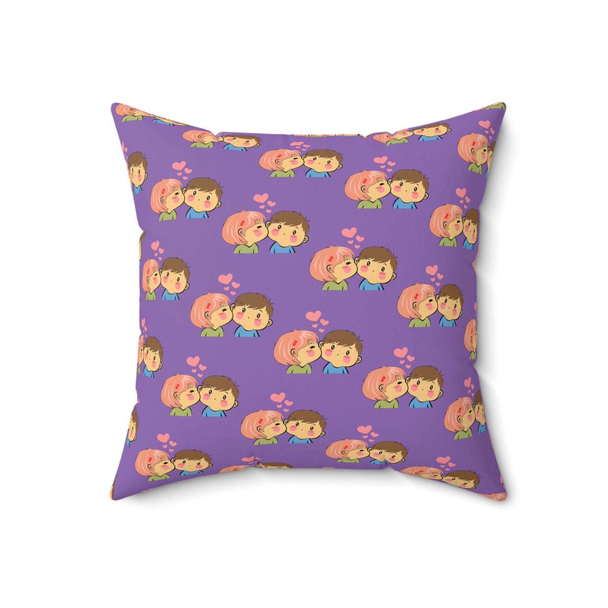 Presentamos el cojín decorativo con estampado "Love's Embrace: Purple Kiss", un toque emotivo para tu espacio. Este exquisito cojín decorativo presenta un dulce diseño de una niña besando a un niño, unidos por un efecto de corazón. Disponible en varios tamaños, es una pieza personalizada.