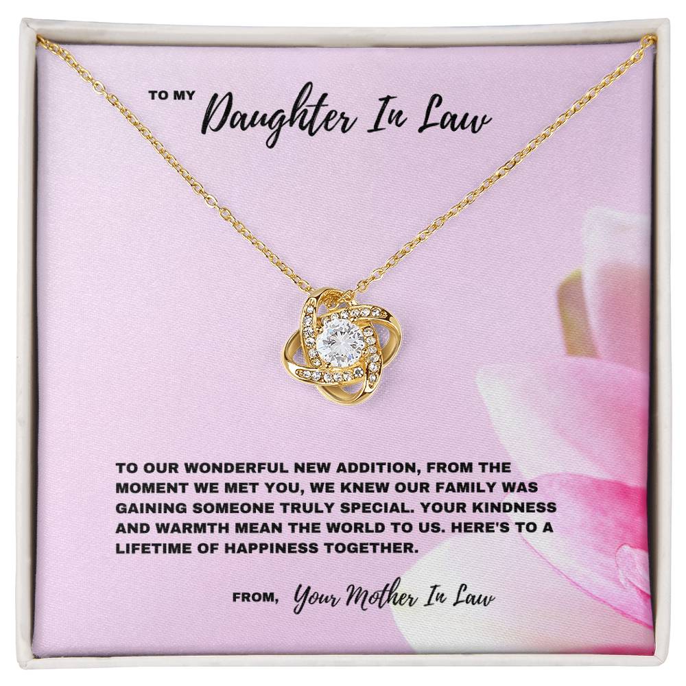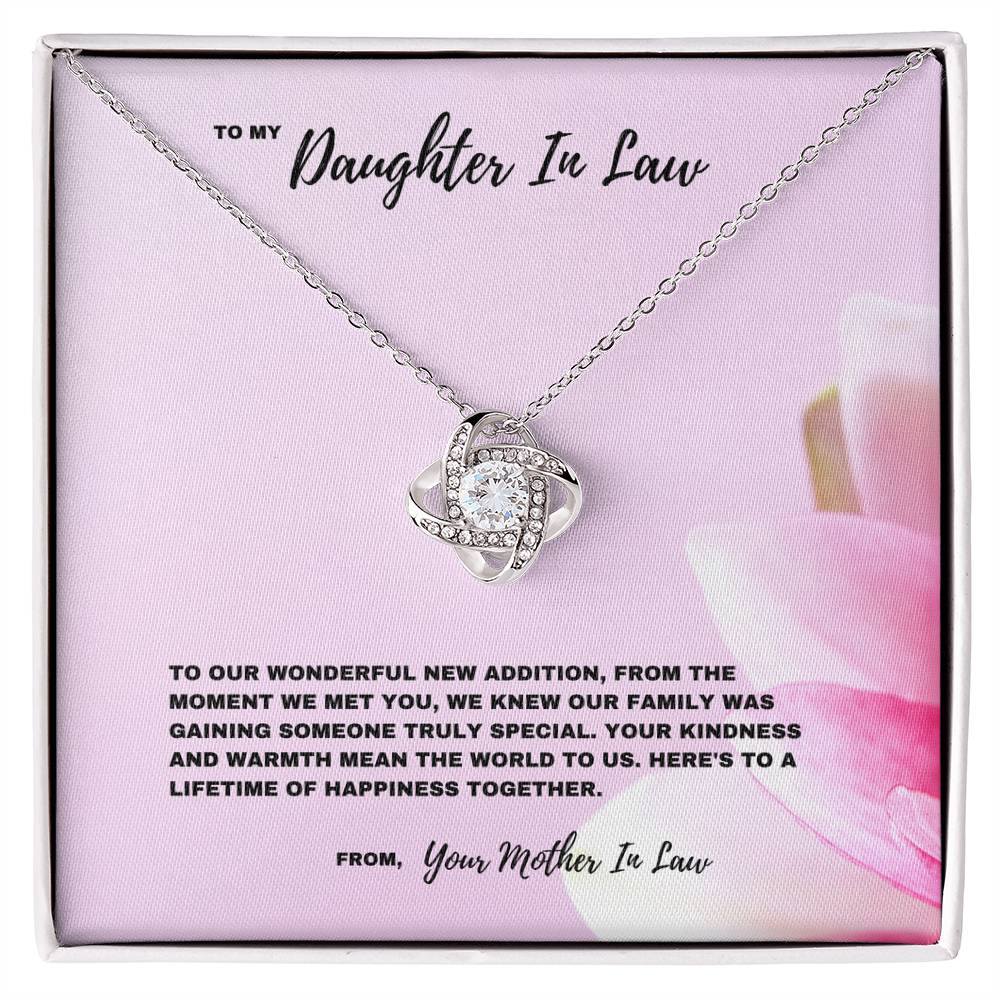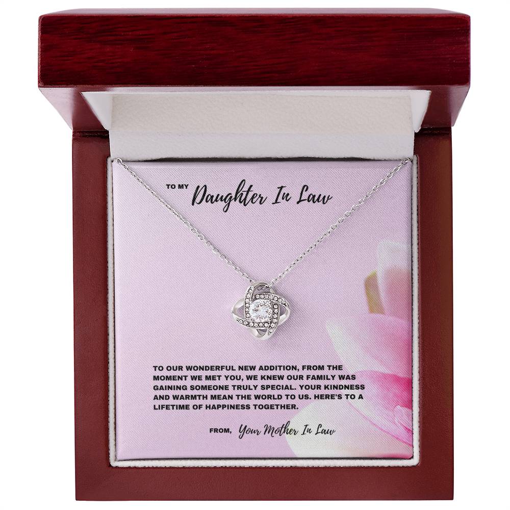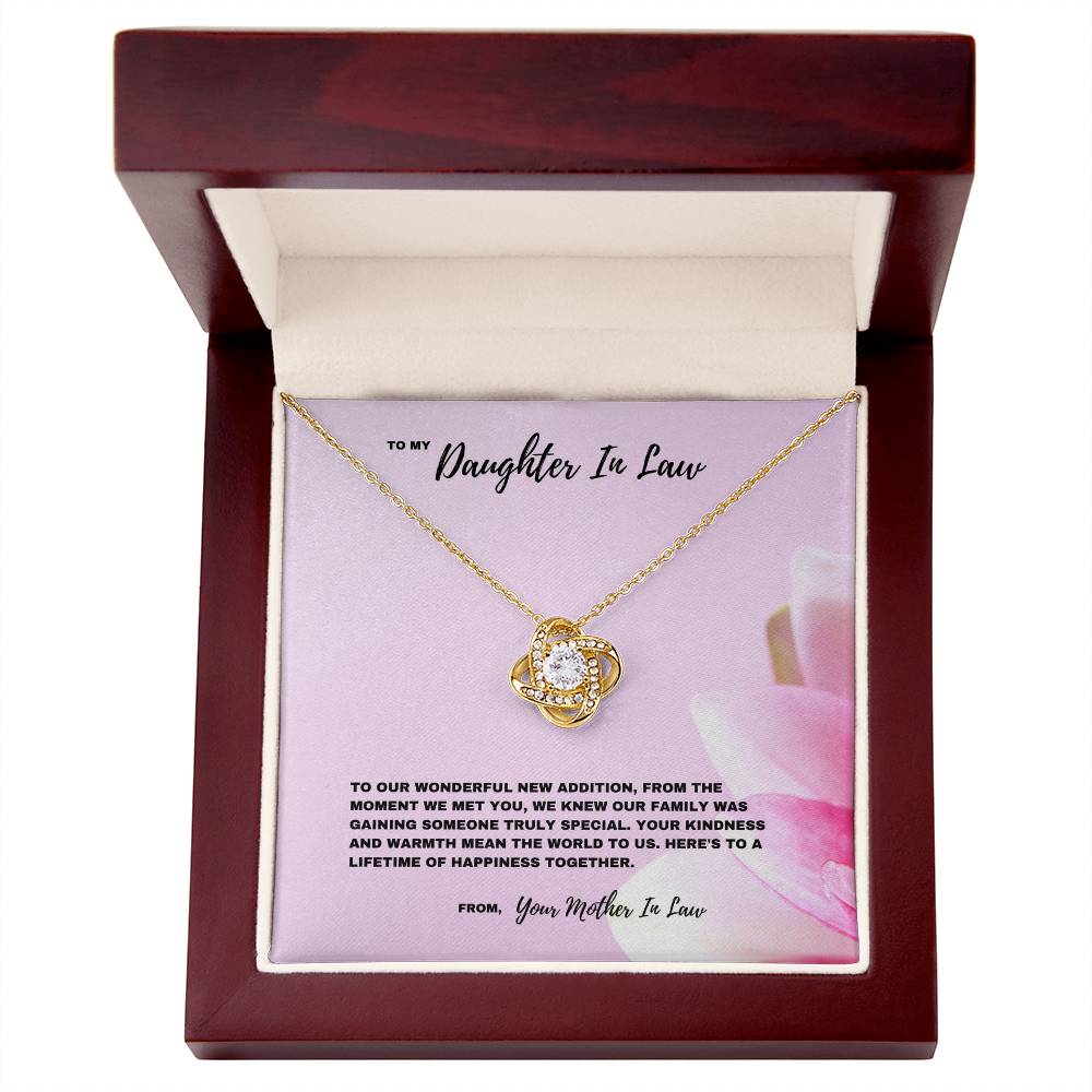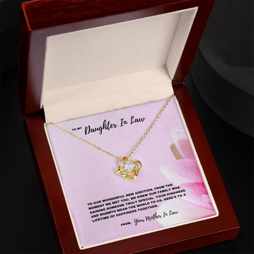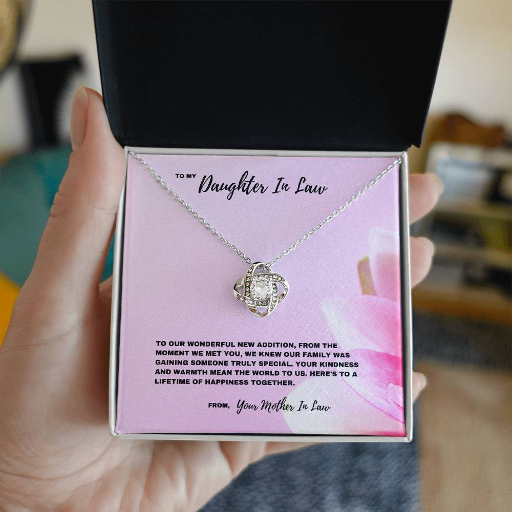 Celebrate your daughter-in-law’s kindness and warmth with this stunning Love Knot Necklace. The message card reads, “From the moment we met you, we knew our family was gaining someone truly special.” This necklace is a symbol of the love and appreciation you have for her, making it a perfect gift to welcome her into the family.