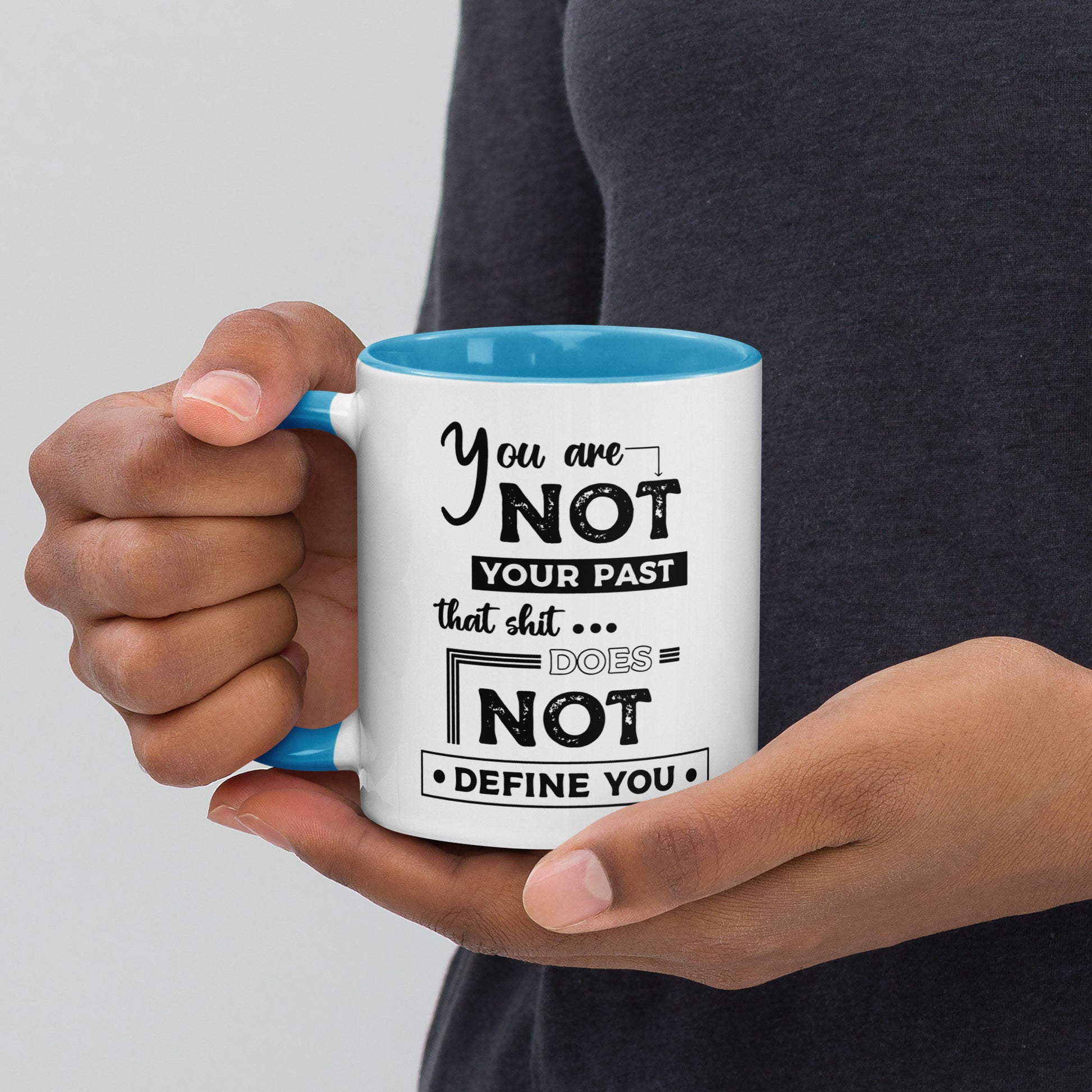Sumérgete en los colores vibrantes que adornan esta taza, desde el llamativo borde y el asa hasta el interior. Cada sorbo se convierte en una experiencia, un viaje hacia mañanas más brillantes y días mejores. Pero lo que realmente distingue a esta taza es el mensaje empoderador que transmite: "No eres tu pasado; esa mierda no te define".