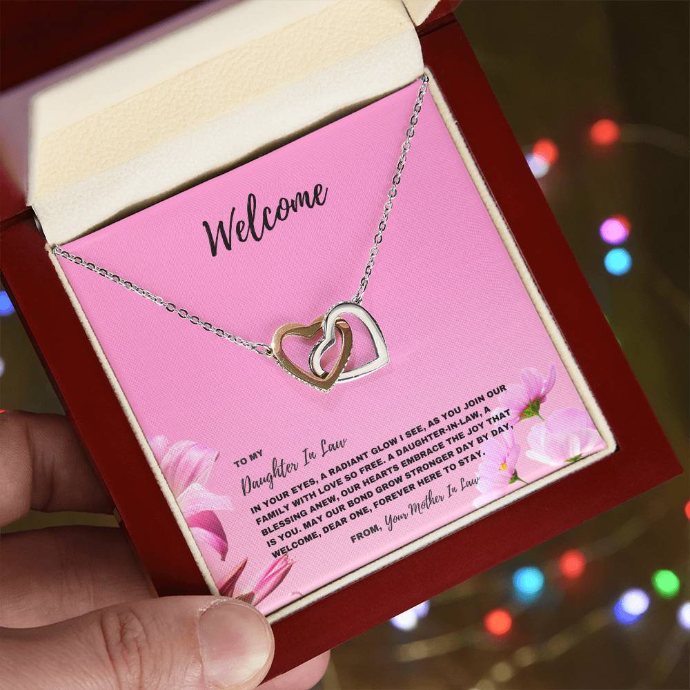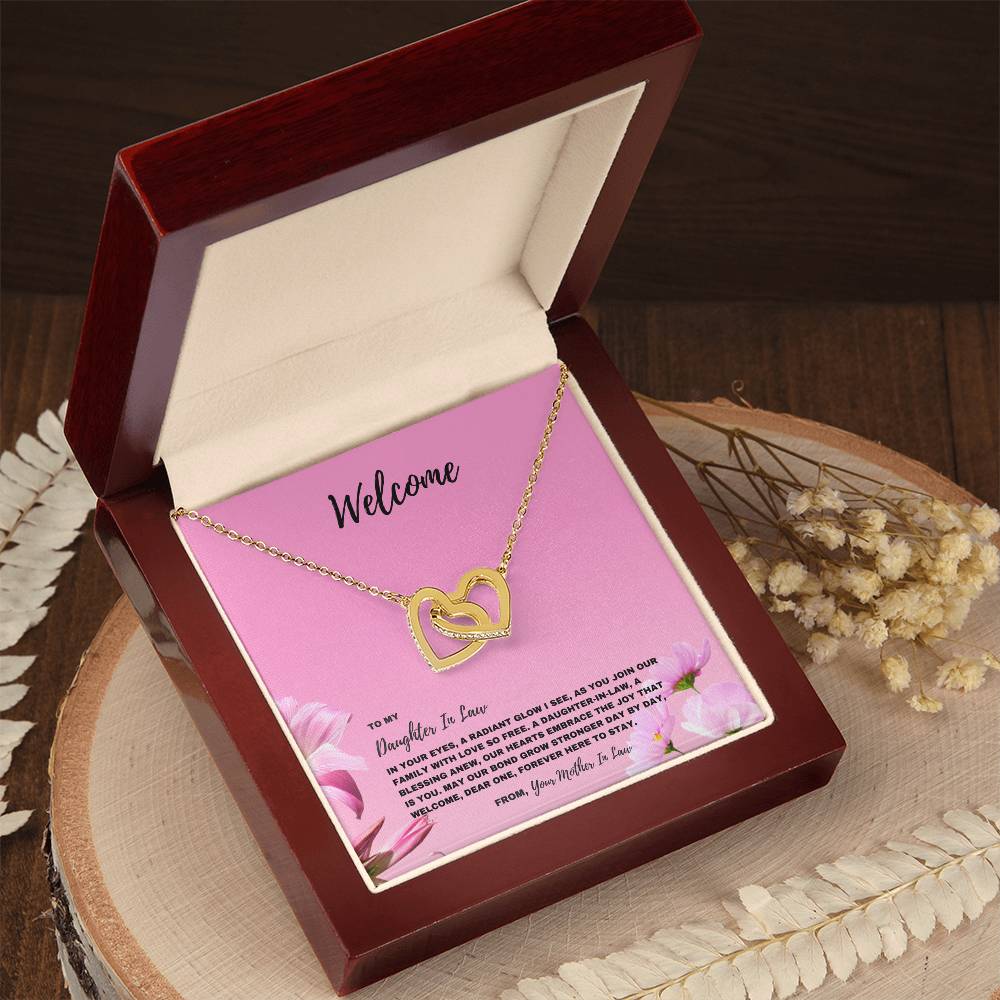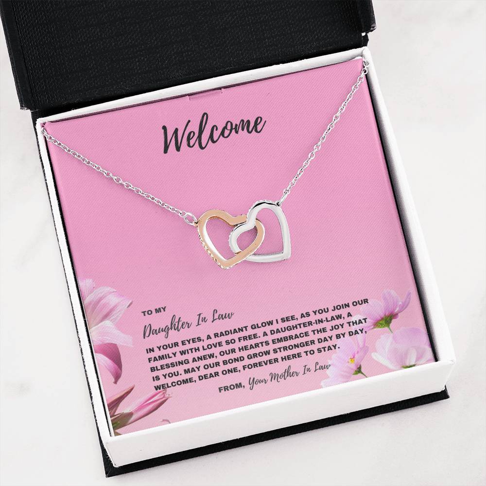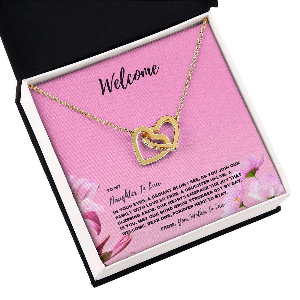 Welcome your daughter-in-law with this beautiful Interlocking Hearts Necklace, symbolizing the new bond between your families. The message card reads, “In your eyes, a radiant glow I see, as you join our family with love so free.” This touching gift expresses your excitement and love, ensuring she feels embraced by her new family.