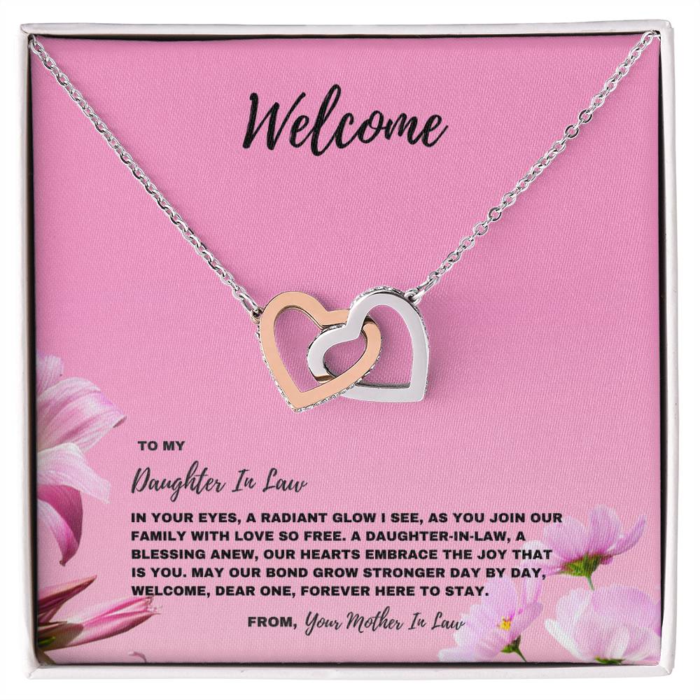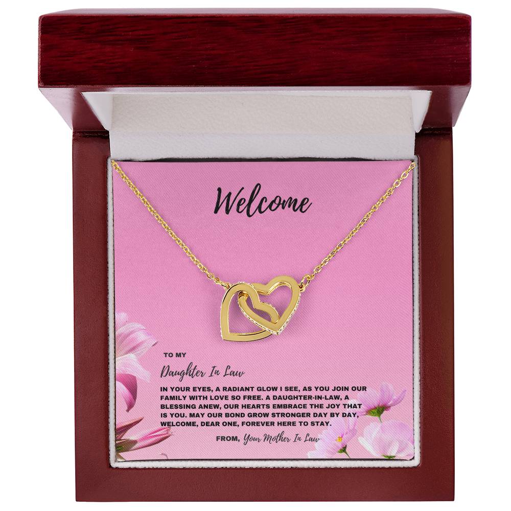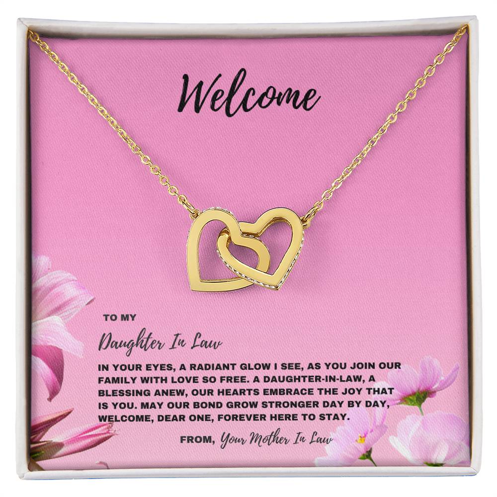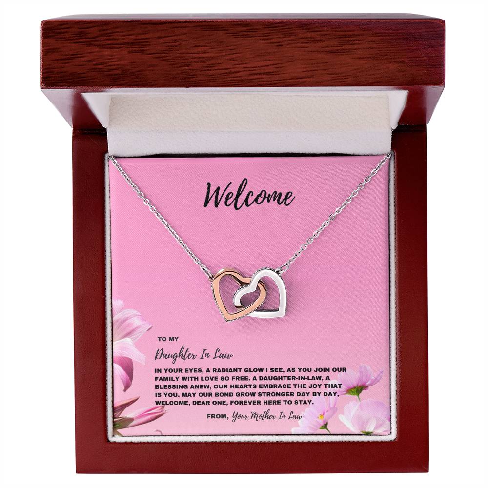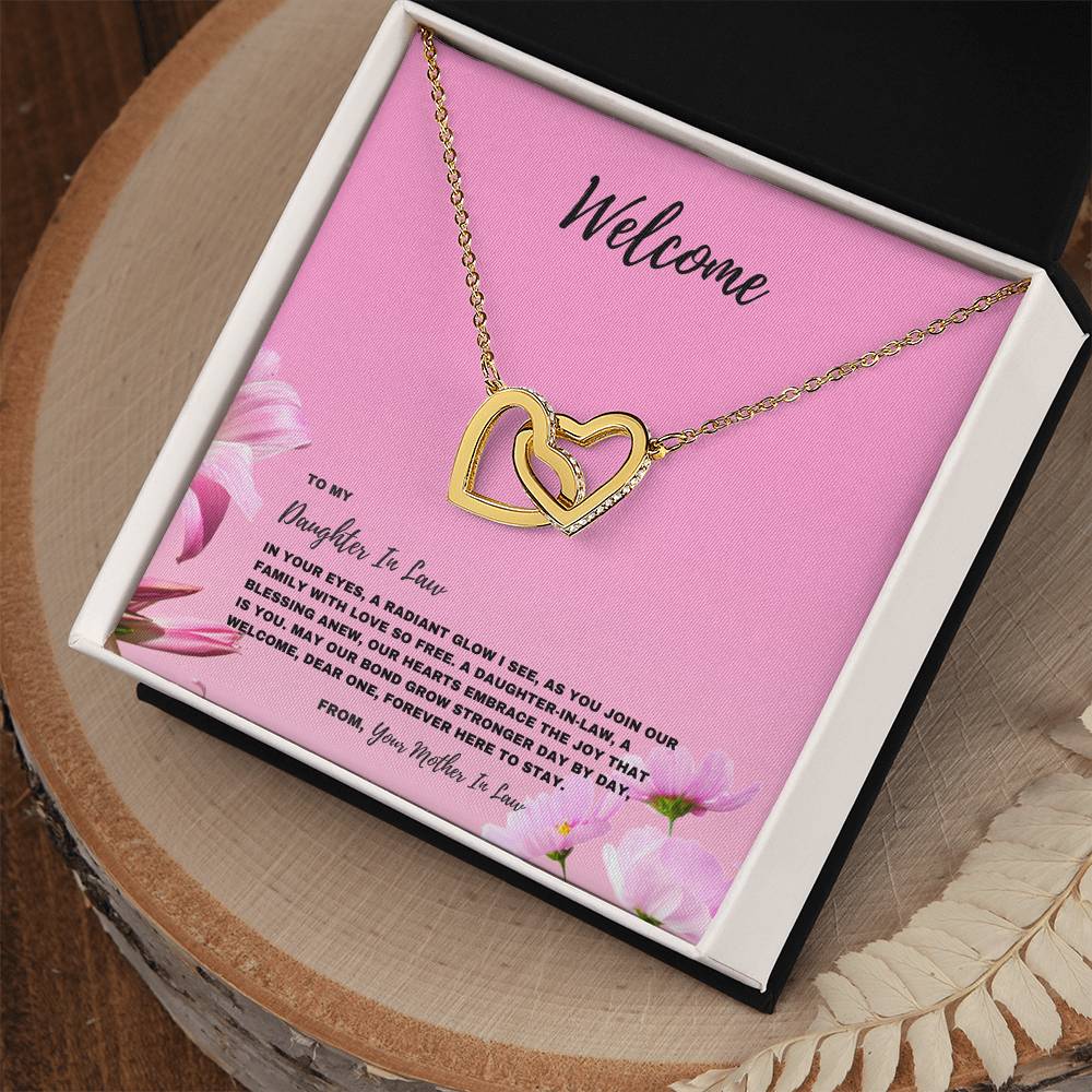 Welcome your daughter-in-law with this beautiful Interlocking Hearts Necklace, symbolizing the new bond between your families. The message card reads, “In your eyes, a radiant glow I see, as you join our family with love so free.” This touching gift expresses your excitement and love, ensuring she feels embraced by her new family.