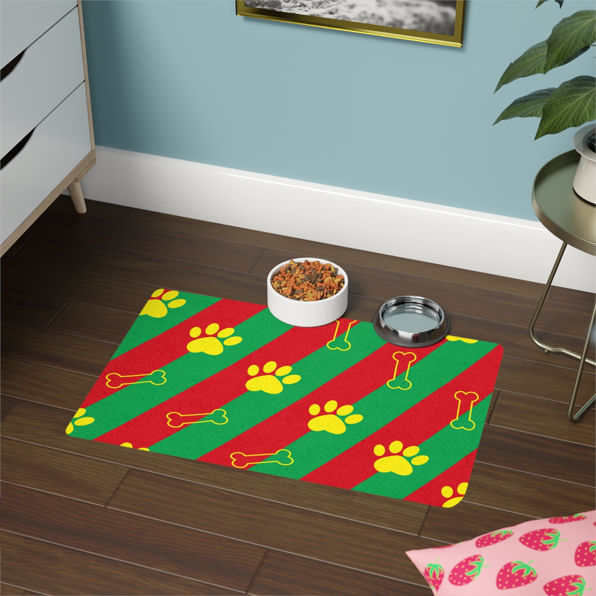 Alfombrilla para comida para mascotas con rayas rojas y verdes con diseño de huellas de patas y huesos