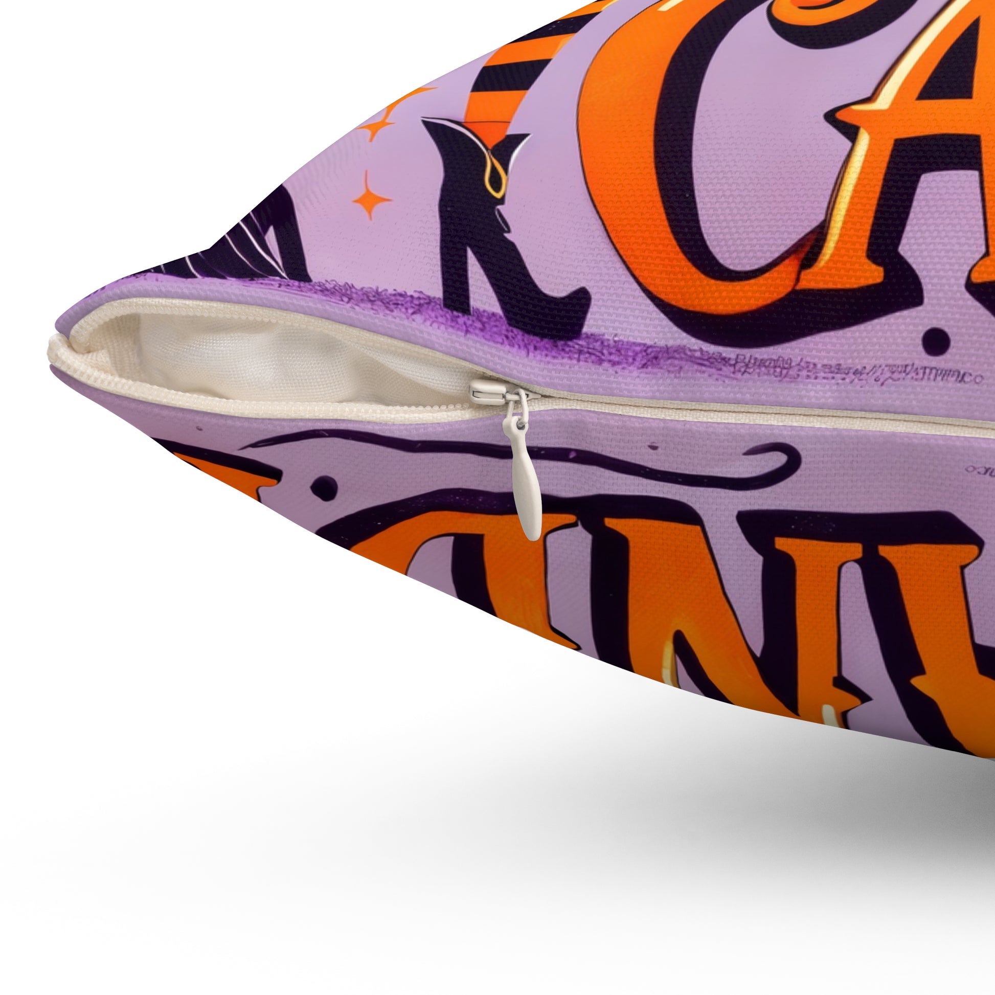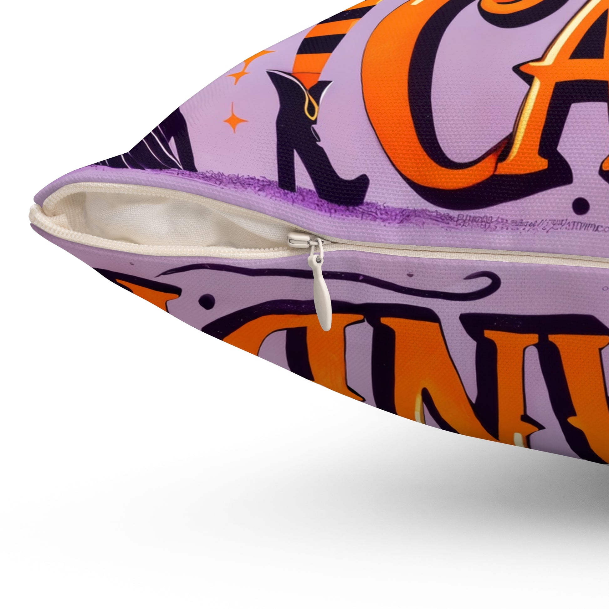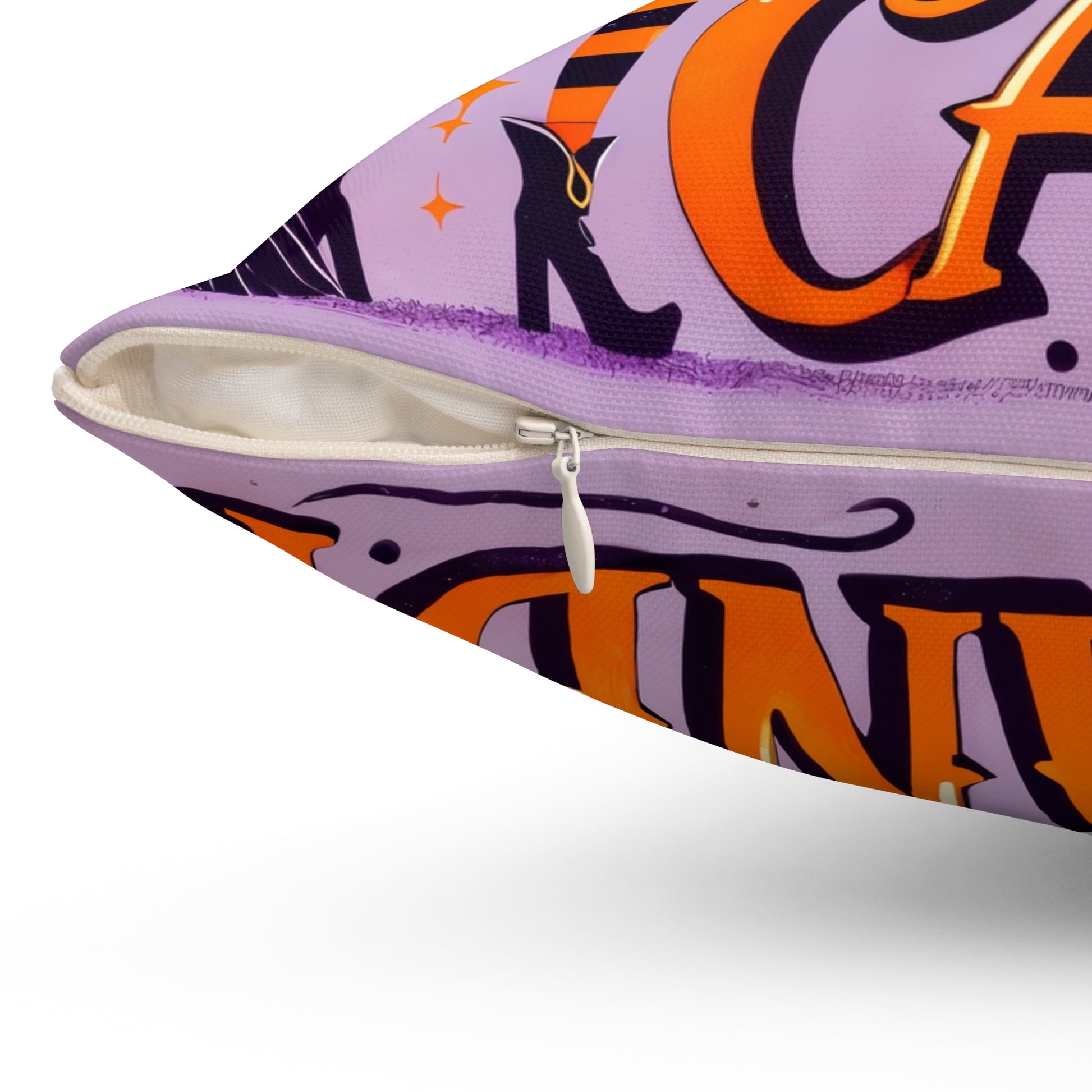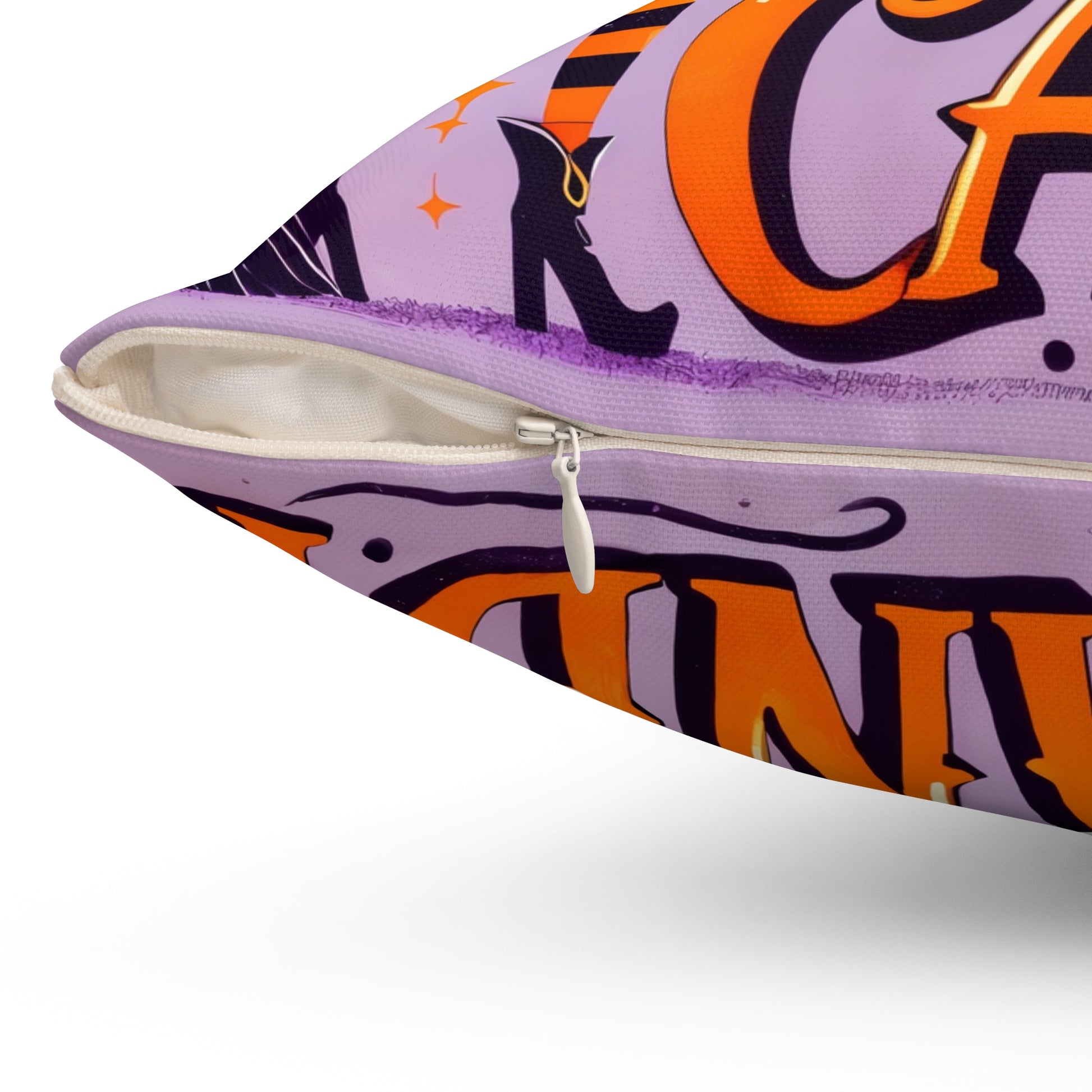 • Square Halloween throw pillow with a colorful witch and candy-themed design