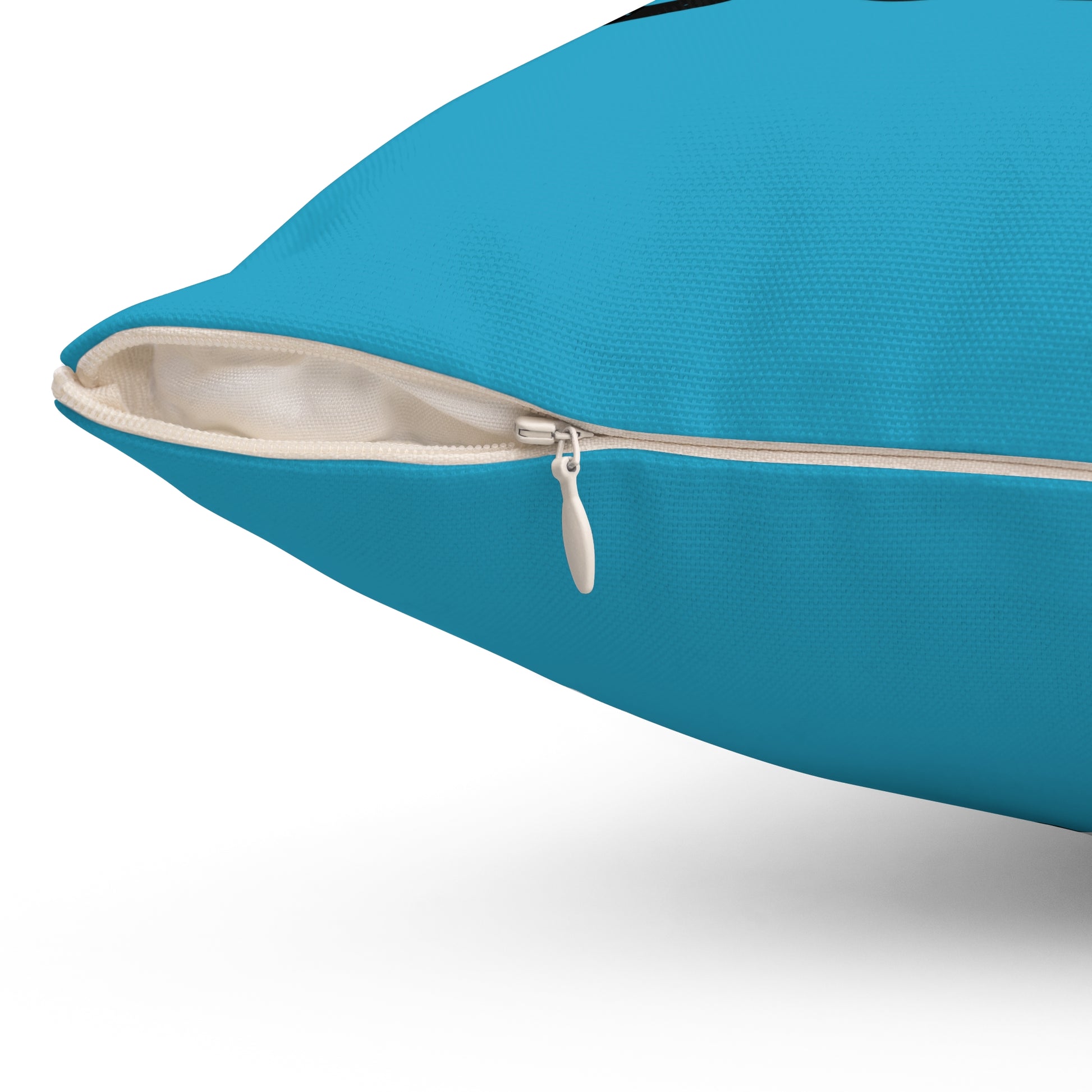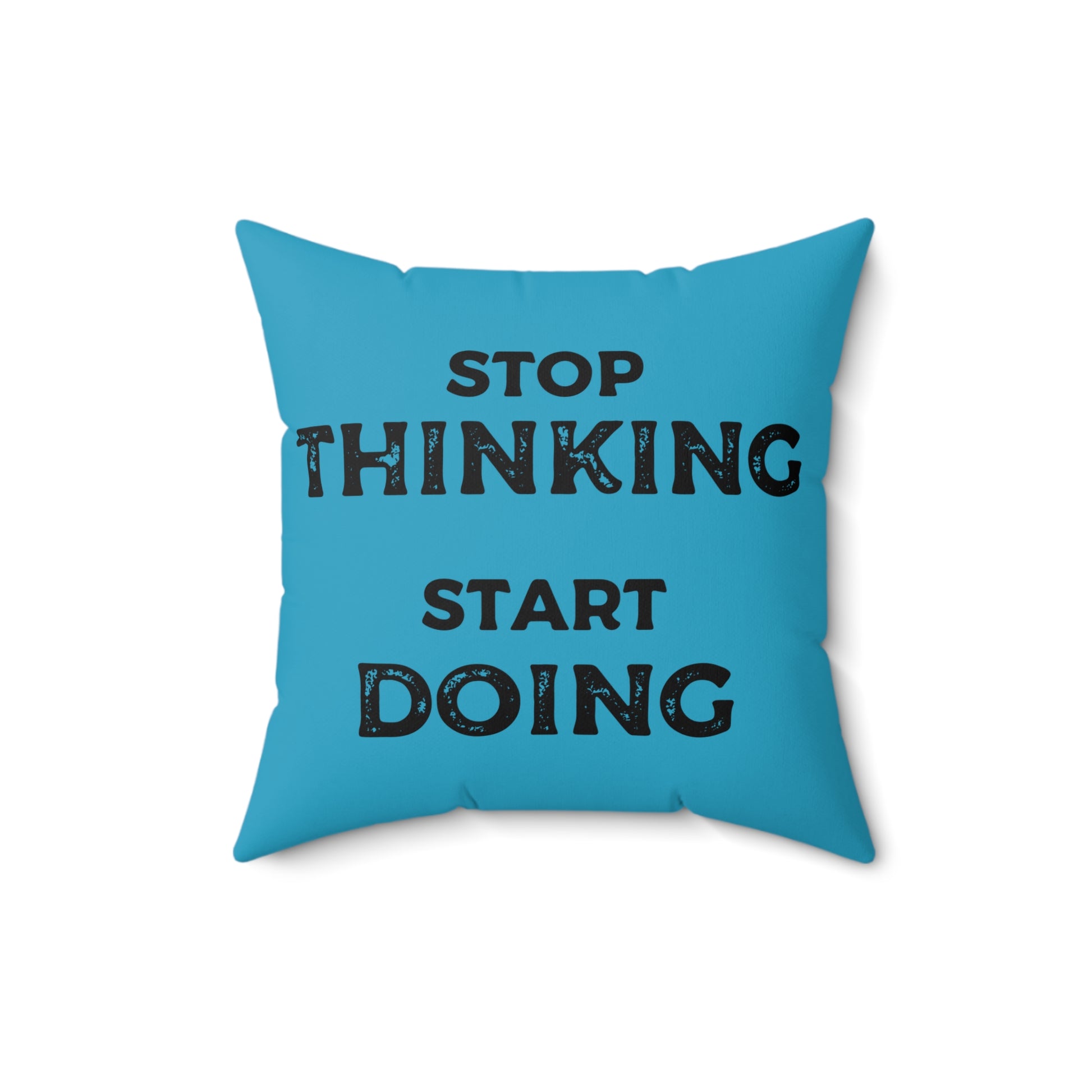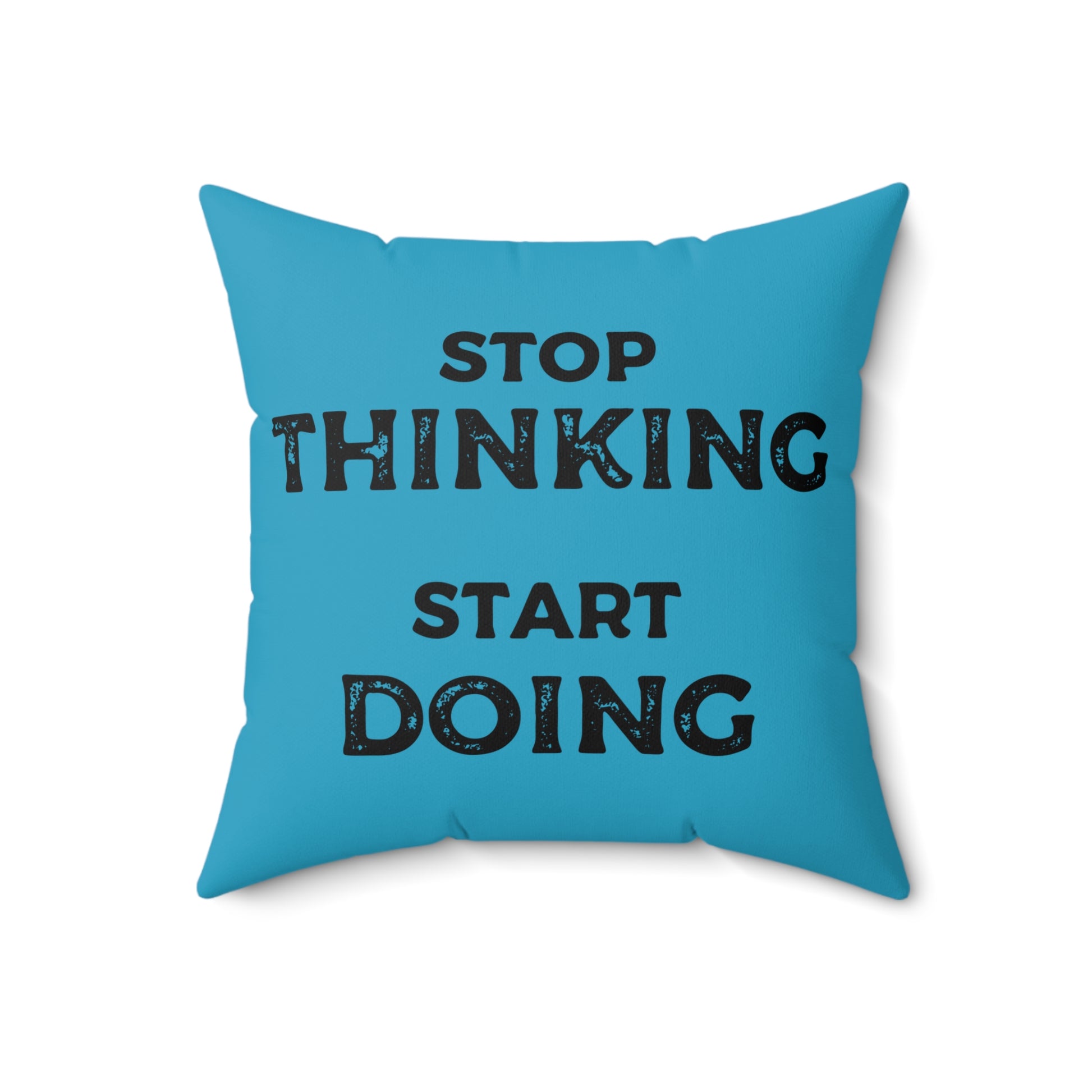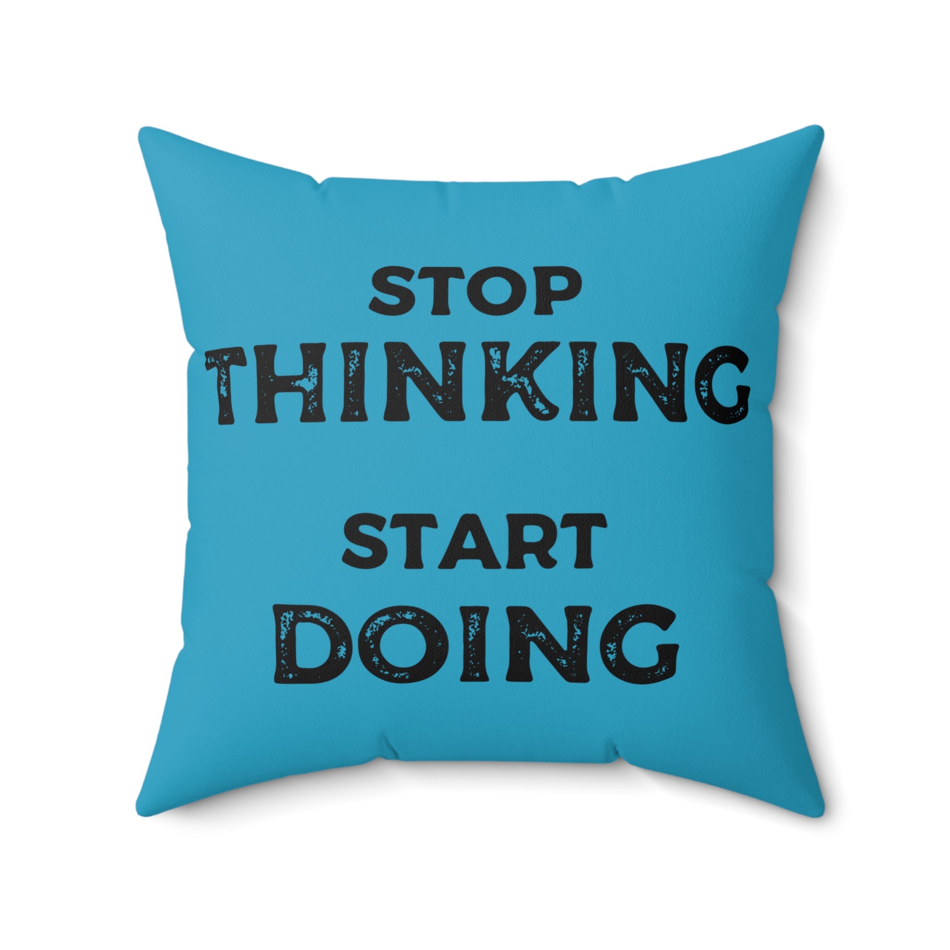 Cojín azul motivacional con frase impresa «Deja de pensar y empieza a actuar»