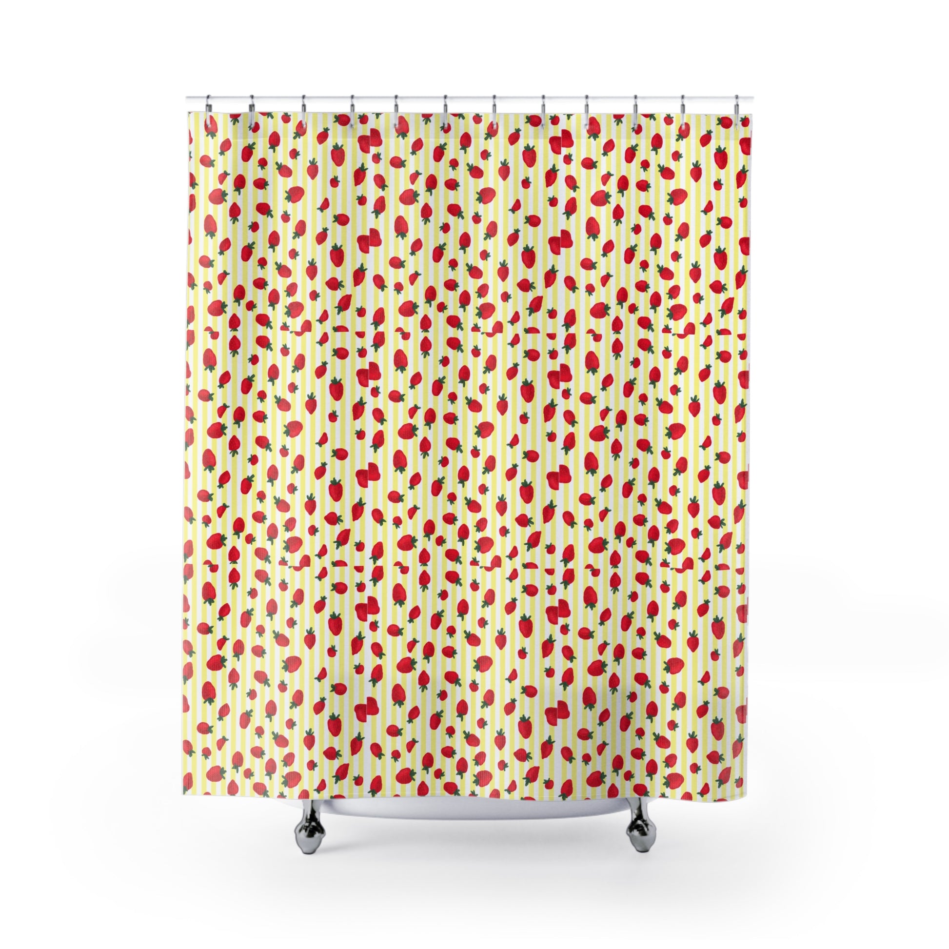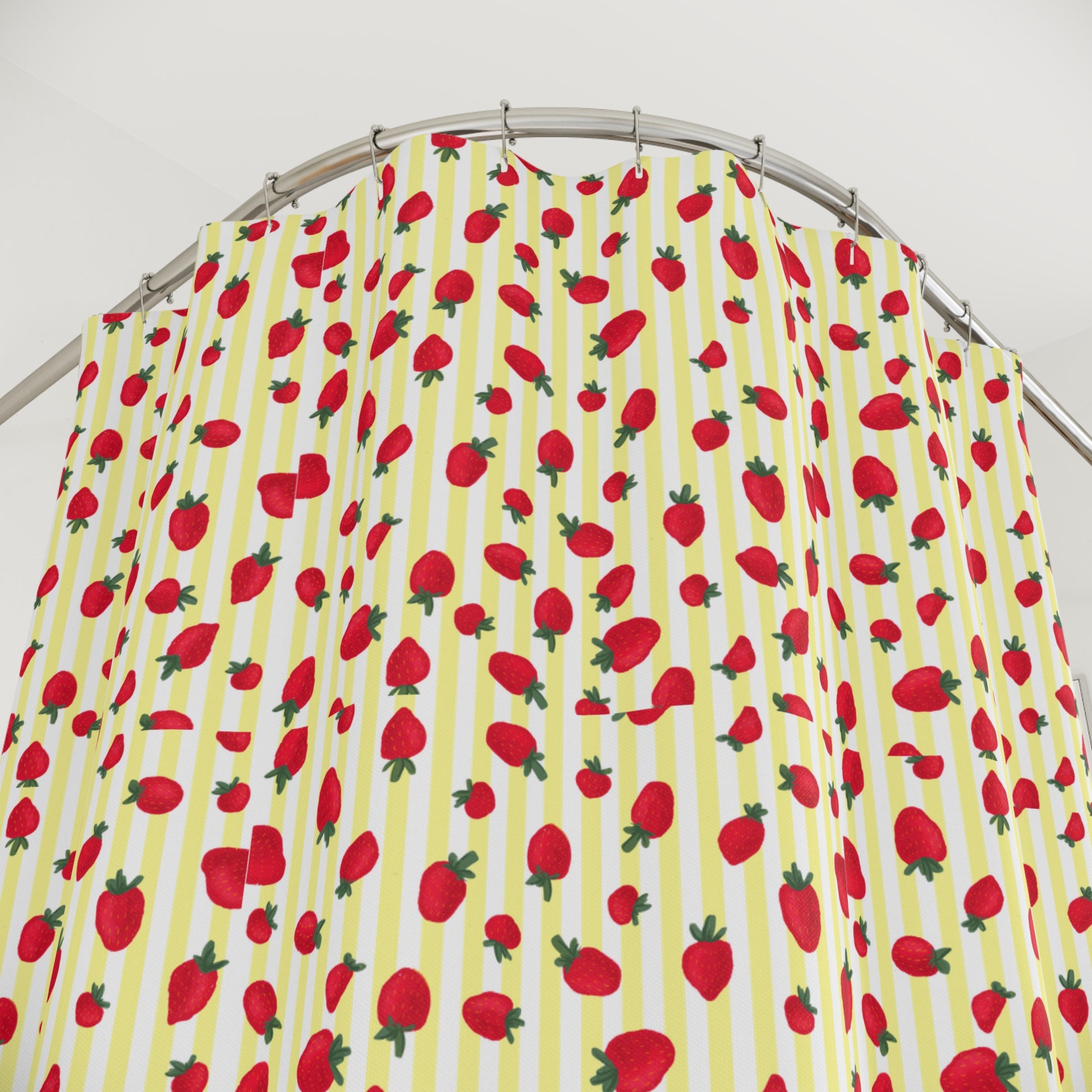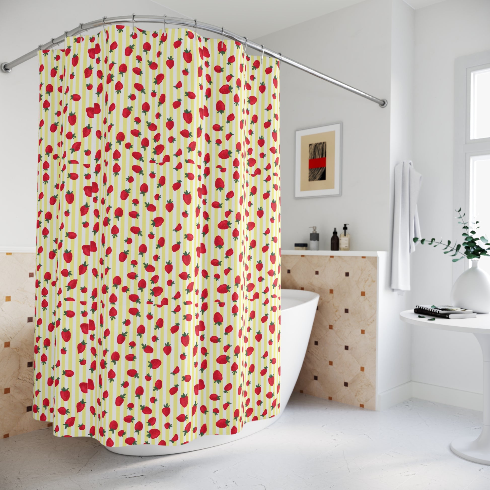 Realza tu baño con nuestra cortina de ducha Sun-Kissed Strawberry Stripes. Elaborada con materiales de calidad, presenta un encantador patrón de fresas sobre rayas amarillas, que infunde energía vibrante a tu espacio. Es elegante y funcional, diseñada para una limpieza fácil y una belleza duradera. Agrega un toque de sol a tu rutina diaria con nuestra encantadora cortina.