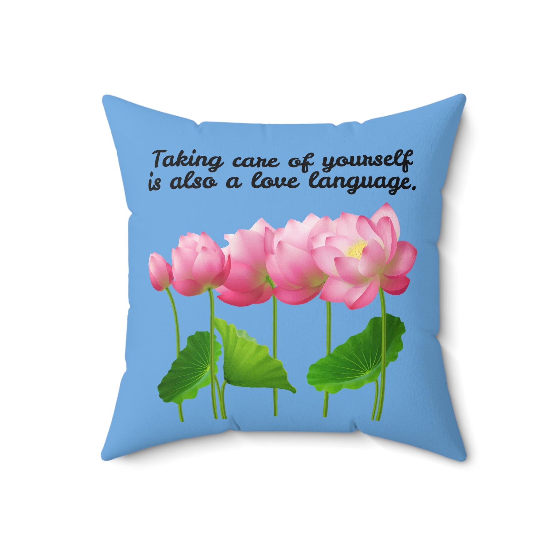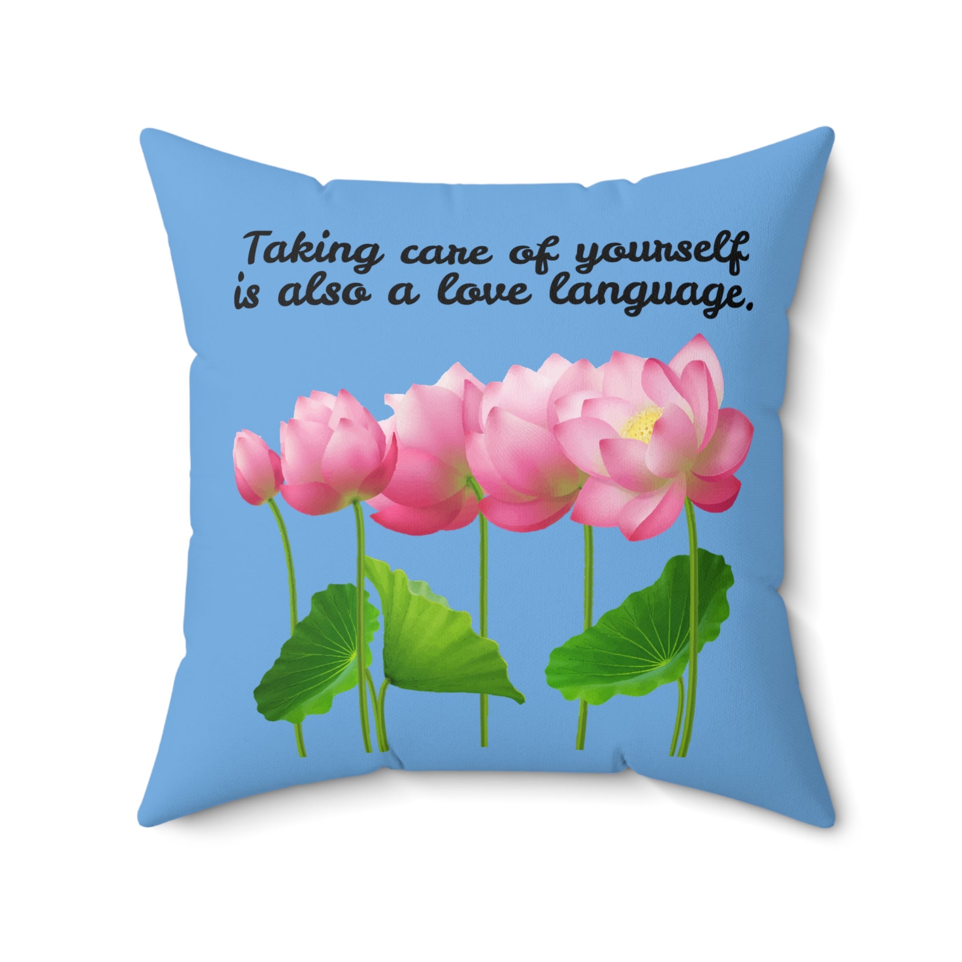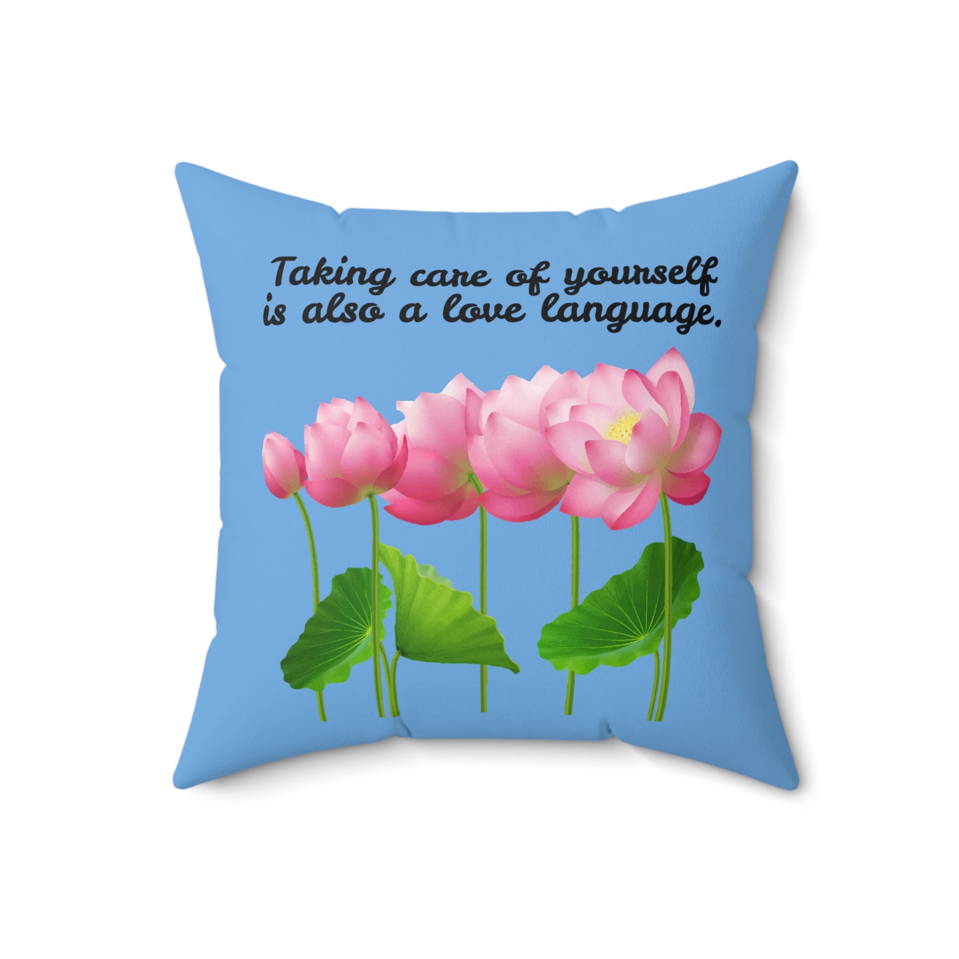Cuidarse a uno mismo también es un lenguaje de amor, almohada con diseño de flores florecientes, almohada azul con flores rosas, almohada decorativa