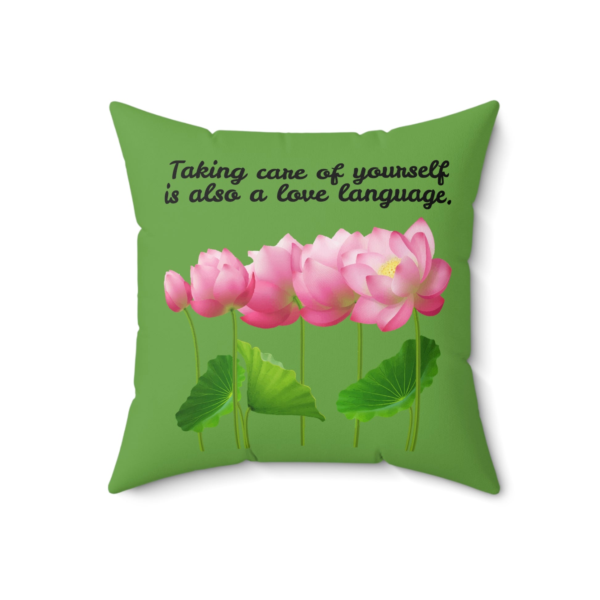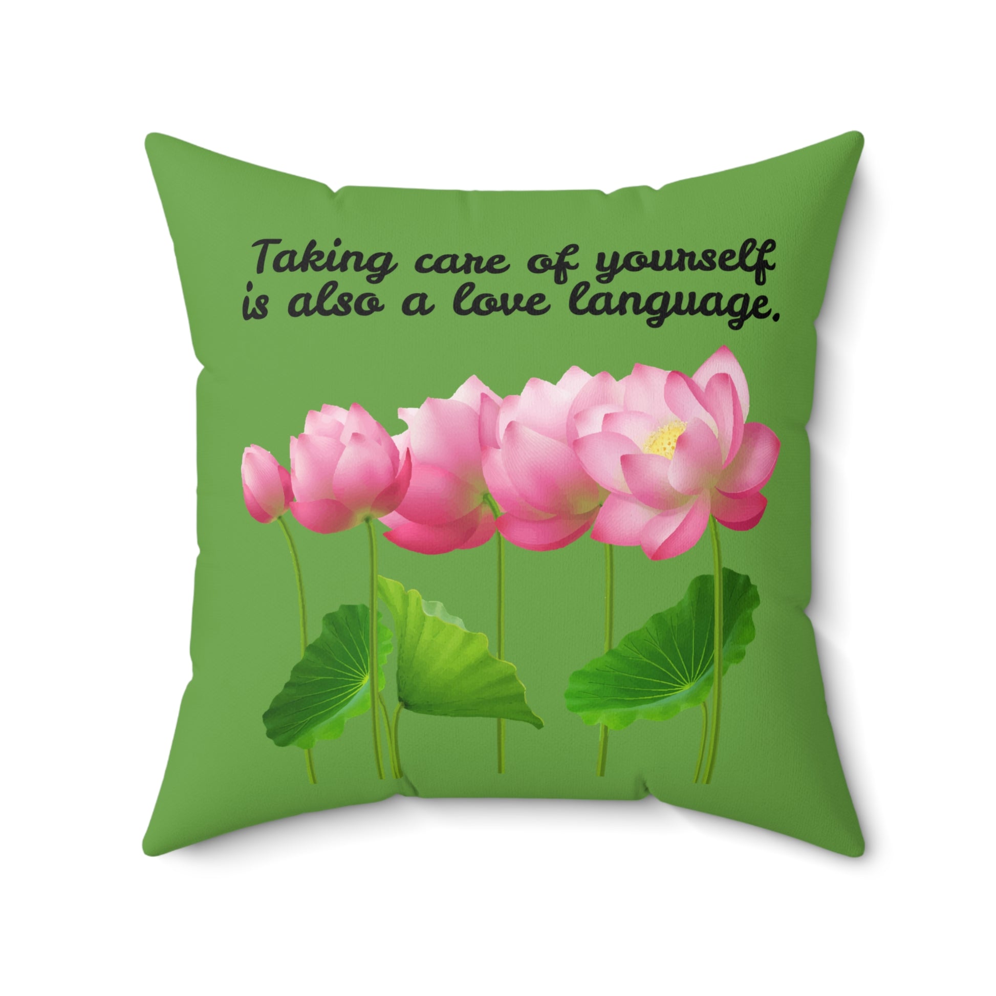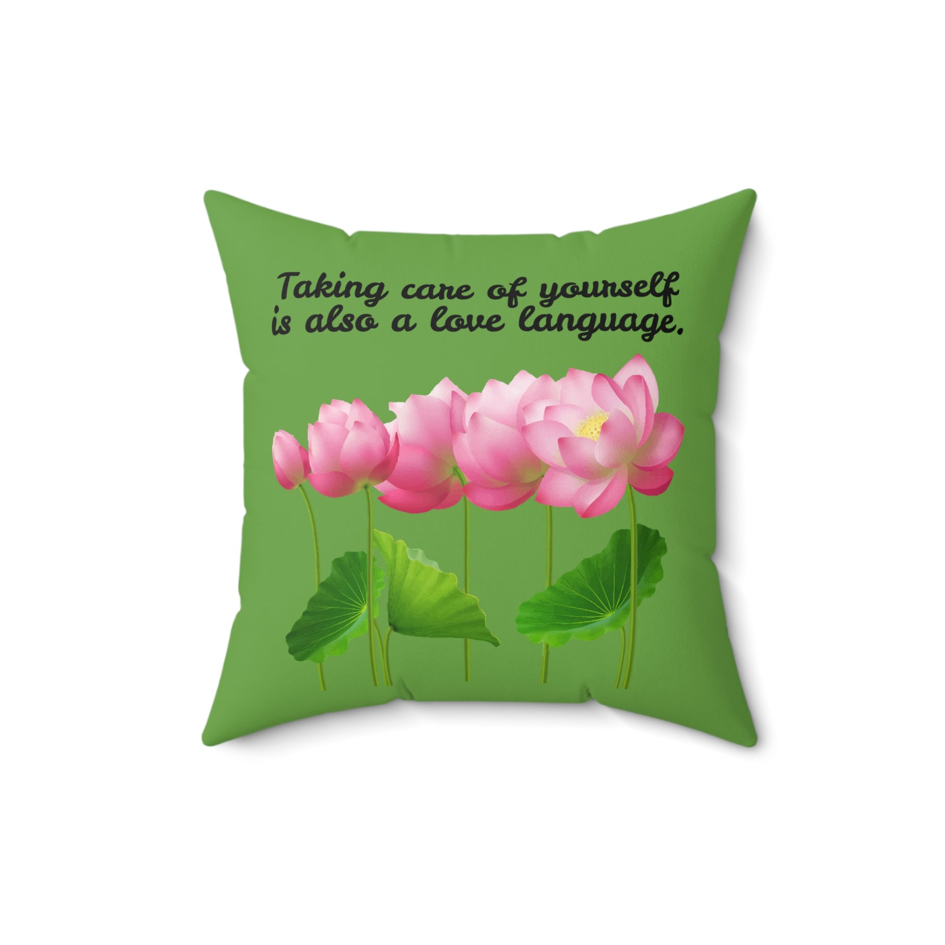 Cuidarse a uno mismo también es un lenguaje de amor, almohada con diseño de flores florecientes, almohada verde con flores rosas, almohada decorativa