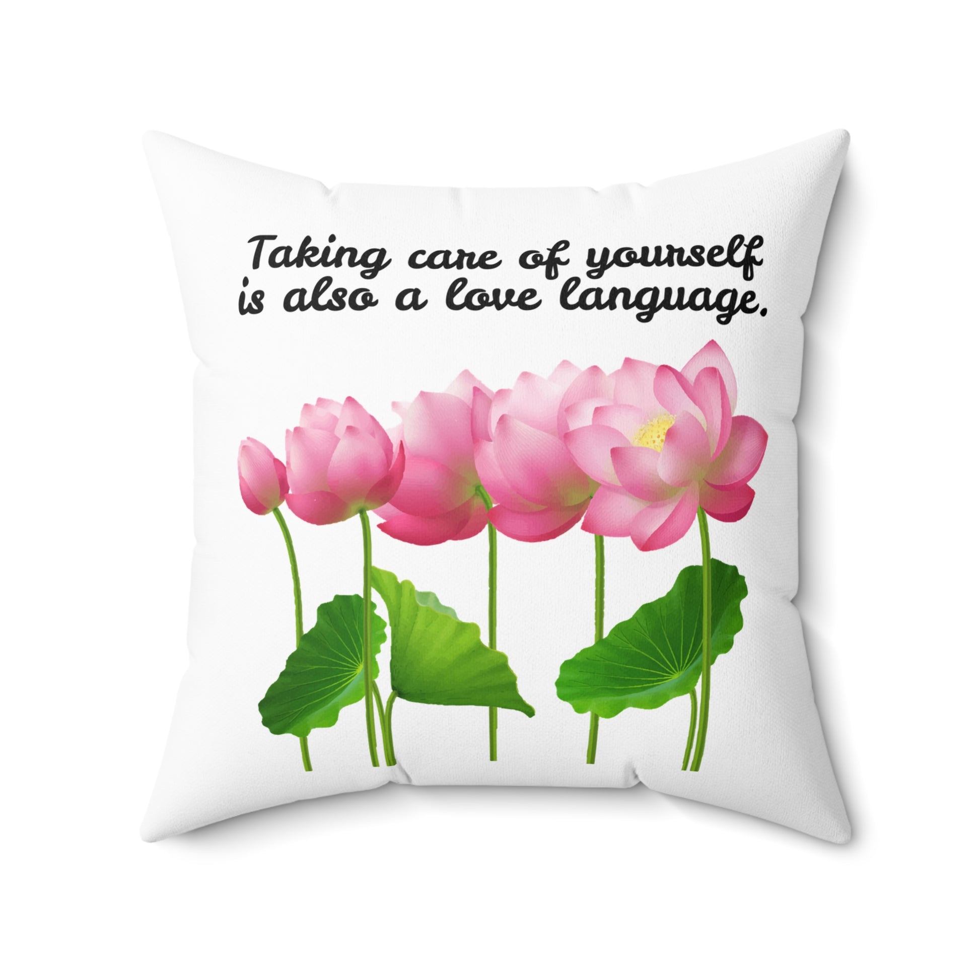 Cuidarse a uno mismo también es un lenguaje de amor, almohada con diseño de flores florecientes, almohada blanca con flores rosas, almohada decorativa