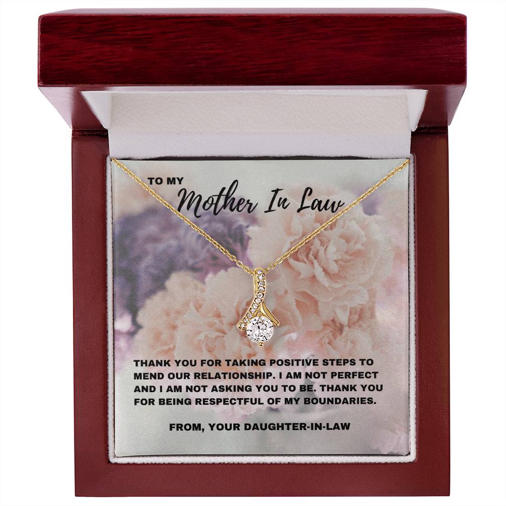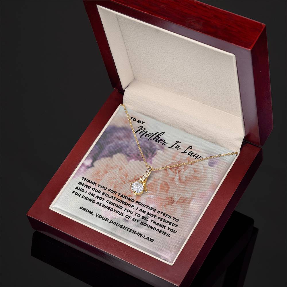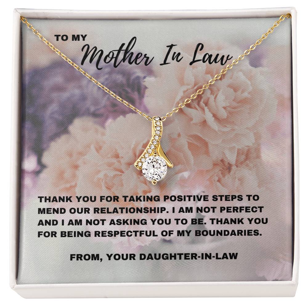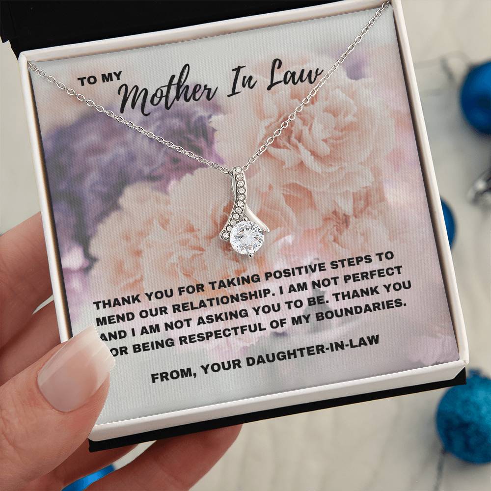 Esta impresionante y seductora belleza Un collar, combinado con una tarjeta con un mensaje sincero que dice: “Gracias por tomar medidas positivas para reparar nuestra relación”, es una hermosa manera de reconocer el progreso que has logrado con tu suegra. Celebra el camino hacia la comprensión y el respeto mutuos con un regalo que refleje la profunda conexión que sientes. Ya sea para el Día de la Madre, su cumpleaños o simplemente porque sí, este regalo es una manera significativa de expresar tu gratitud por los esfuerzos que ha hecho.