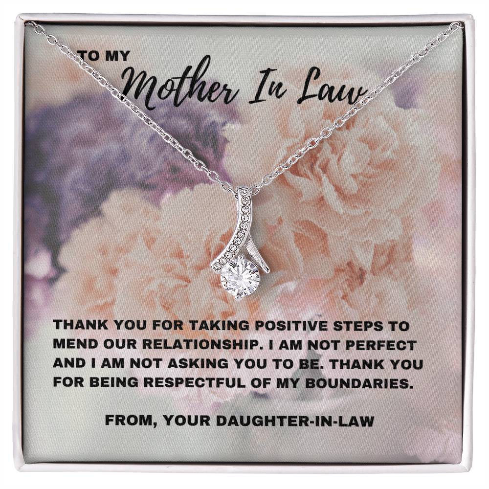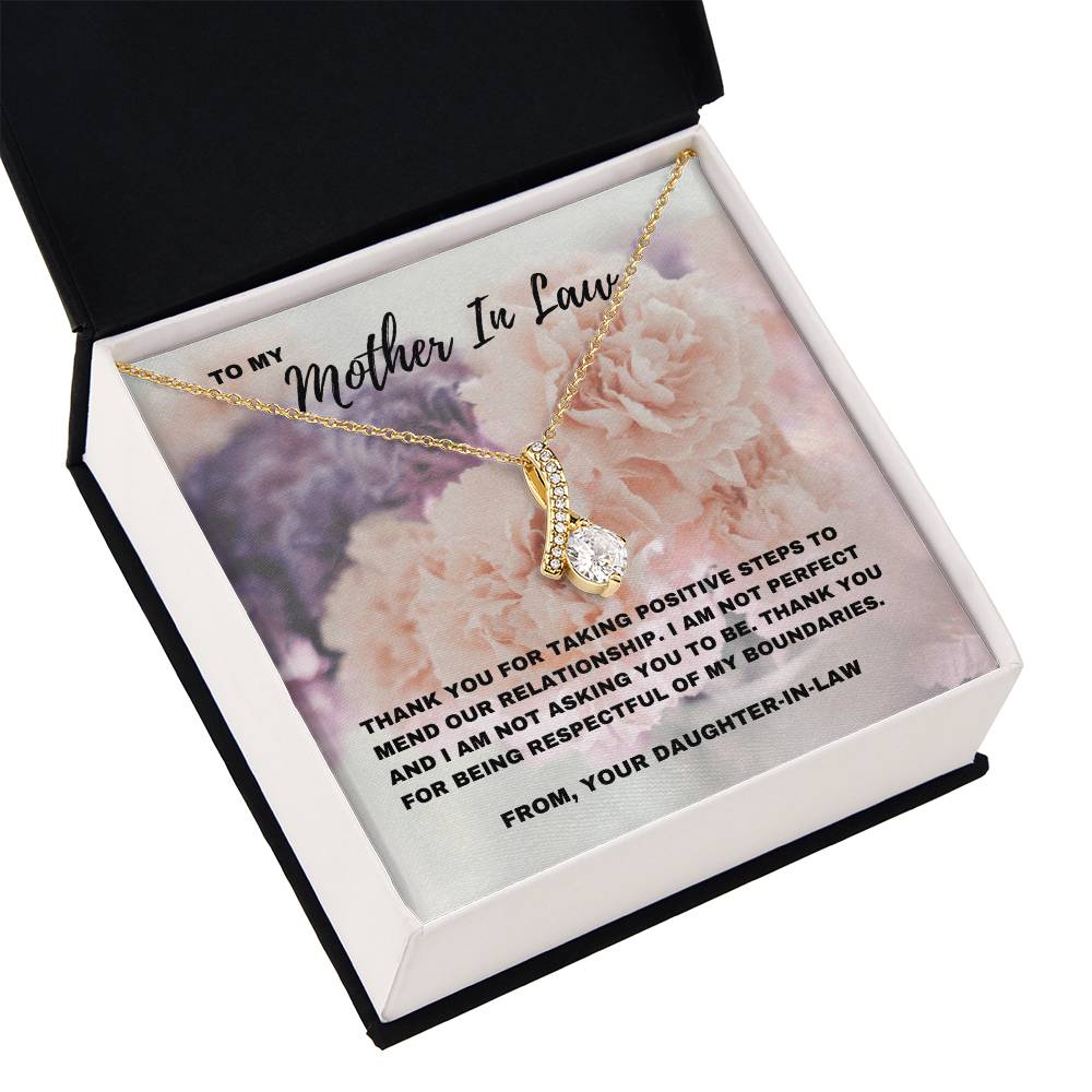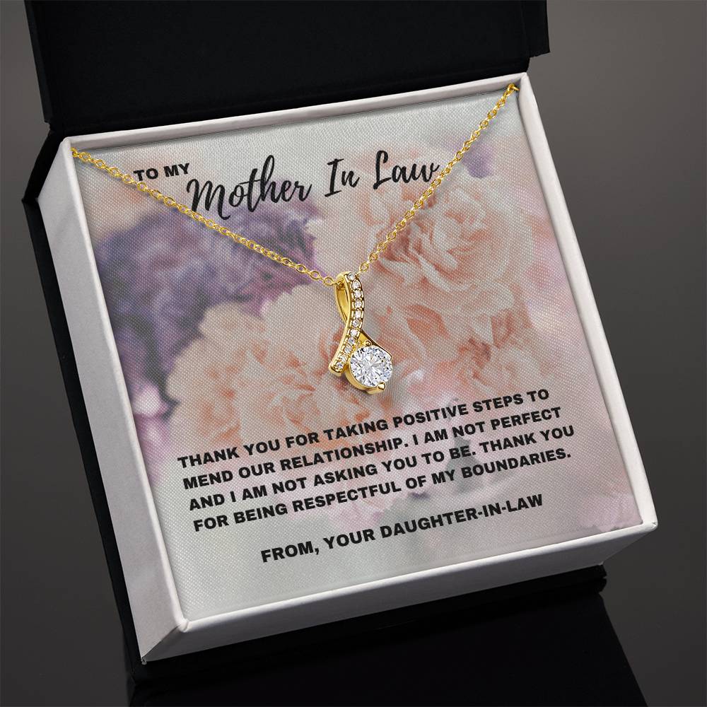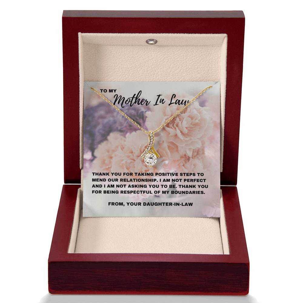 Esta impresionante y seductora belleza Un collar, combinado con una tarjeta con un mensaje sincero que dice: “Gracias por tomar medidas positivas para reparar nuestra relación”, es una hermosa manera de reconocer el progreso que has logrado con tu suegra. Celebra el camino hacia la comprensión y el respeto mutuos con un regalo que refleje la profunda conexión que sientes. Ya sea para el Día de la Madre, su cumpleaños o simplemente porque sí, este regalo es una manera significativa de expresar tu gratitud por los esfuerzos que ha hecho.