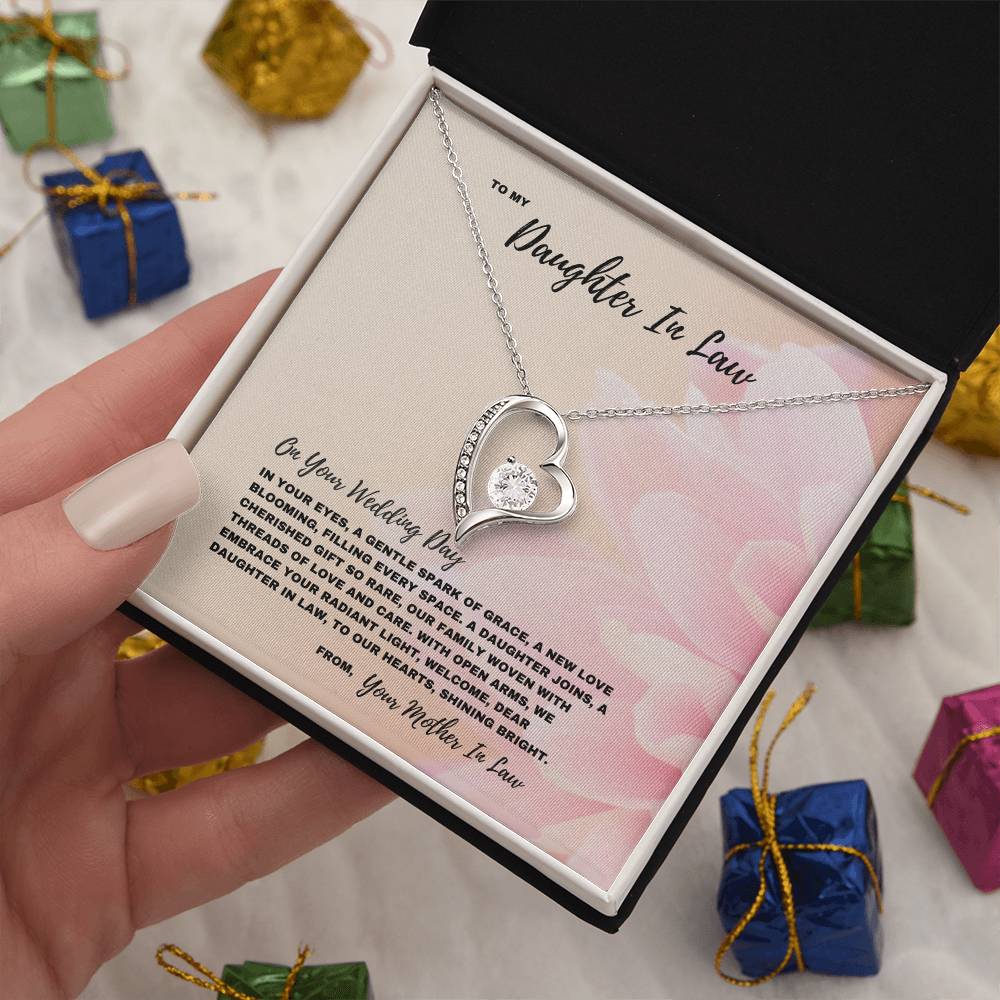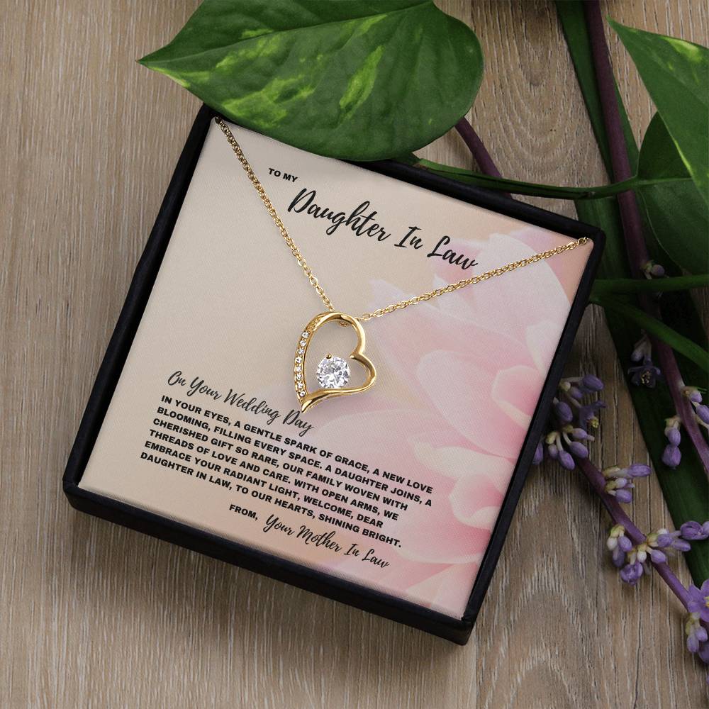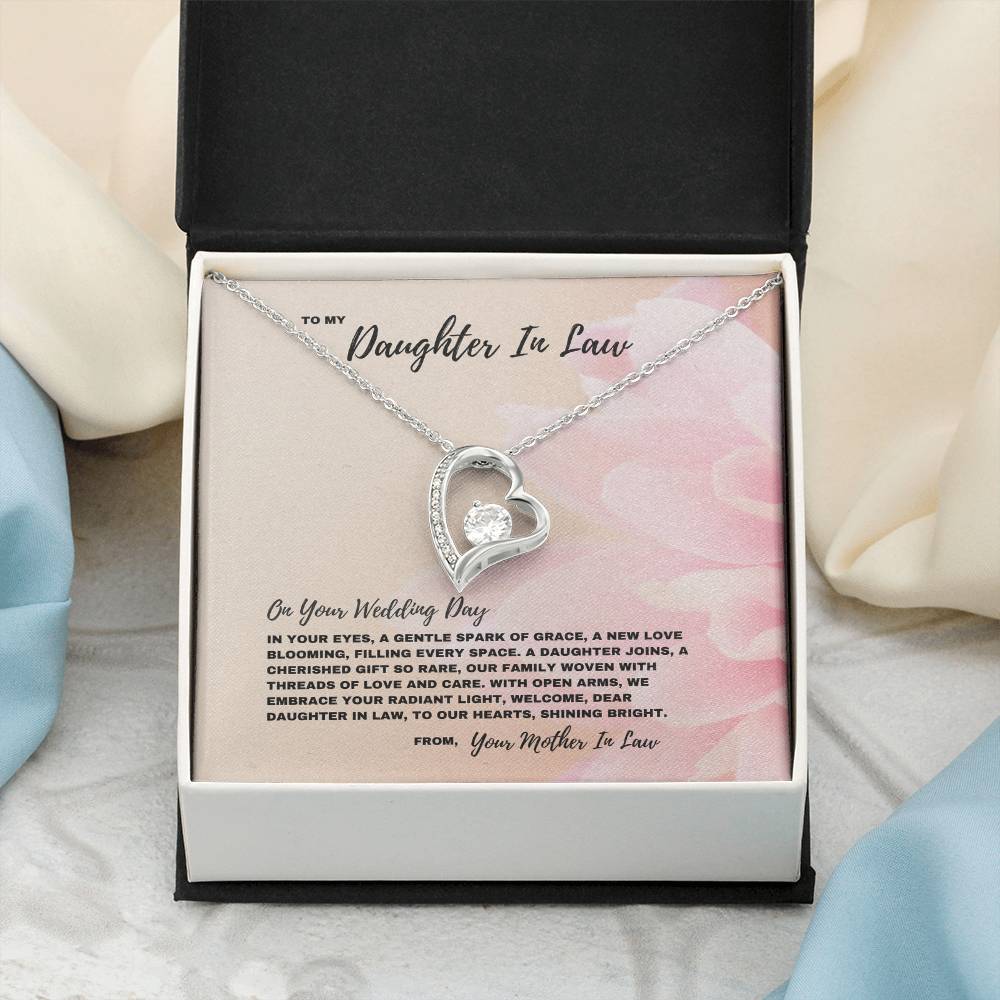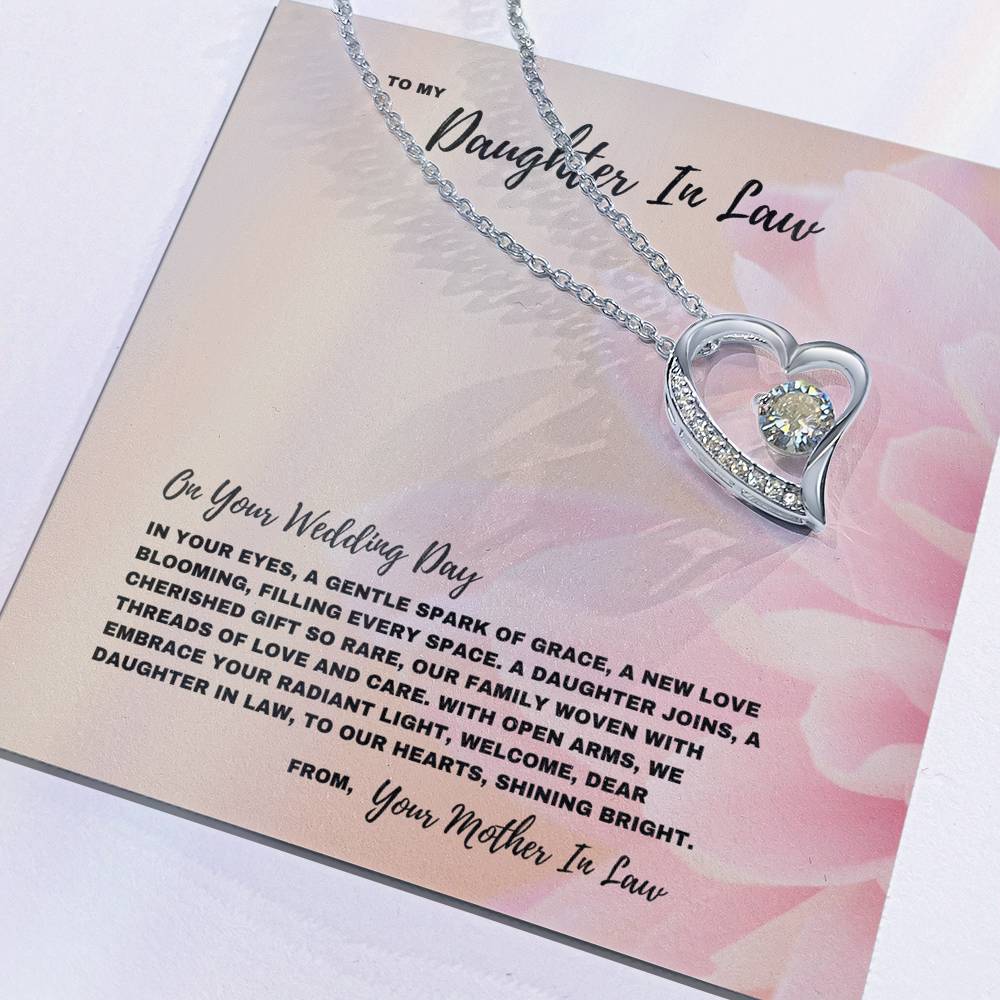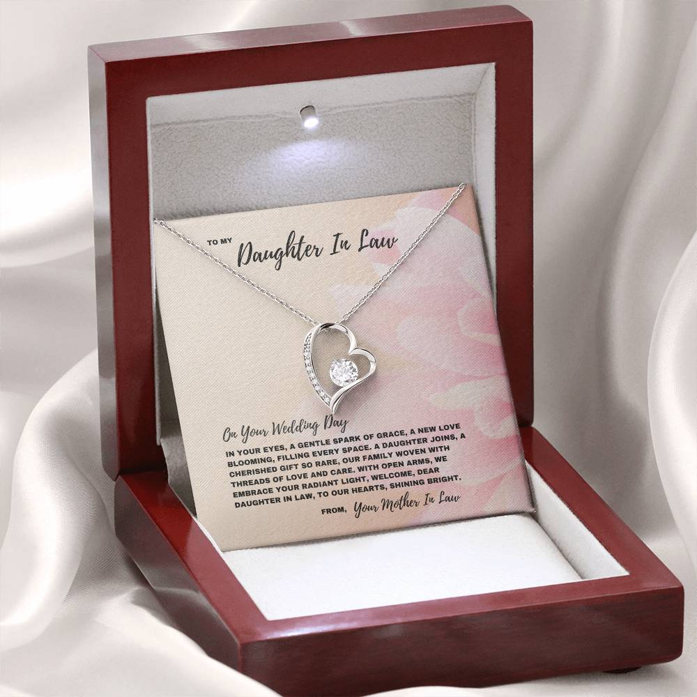Celebrate your daughter-in-law’s wedding day with this beautiful Forever Love Necklace. The message card reads, “In your eyes, a gentle spark of grace, a new love blooming, filling every space.” This necklace is a symbol of the love and grace she brings to the family, making it the perfect keepsake for her special day. This piece is sure to melt her heart and reassure her that she has your acceptance, love and support.
