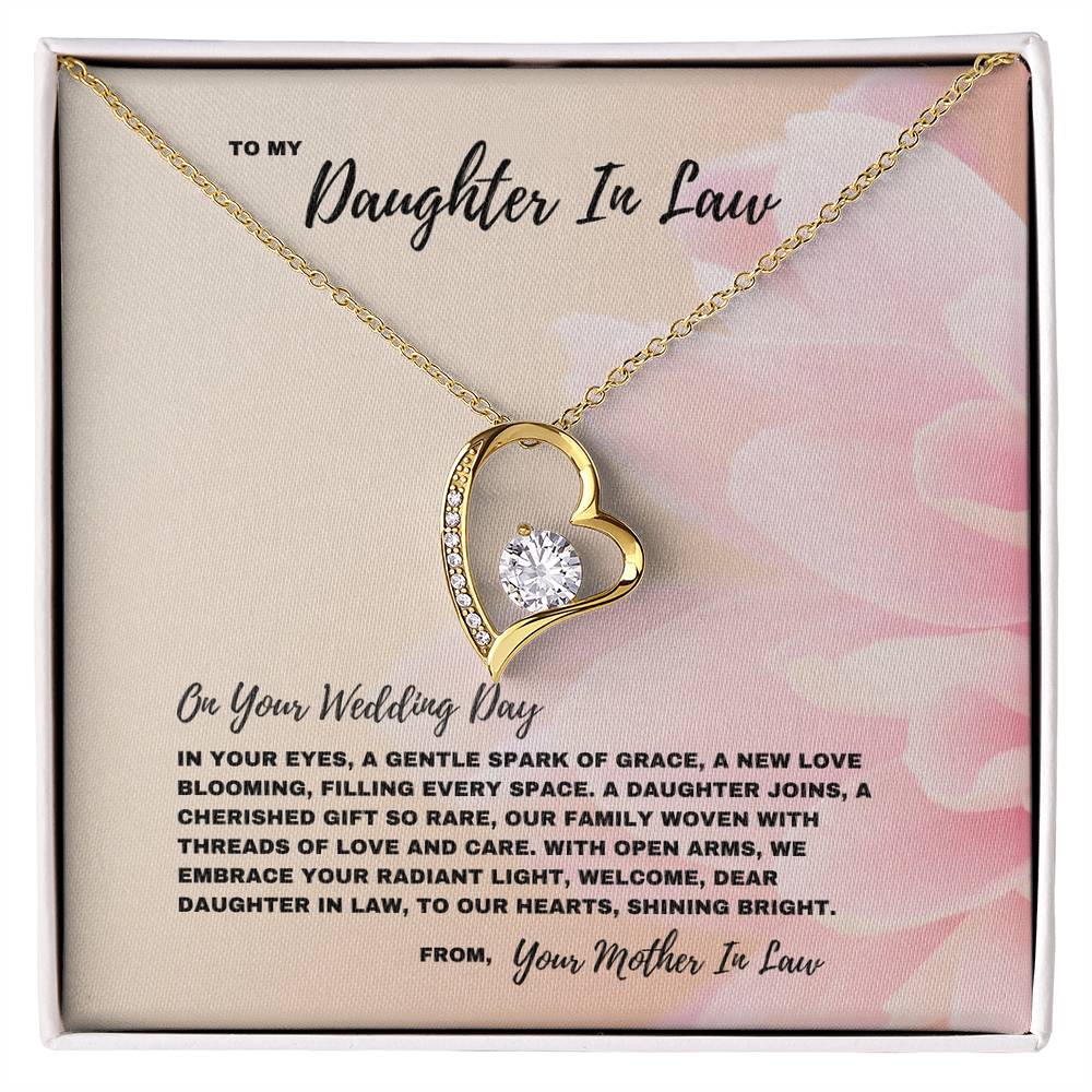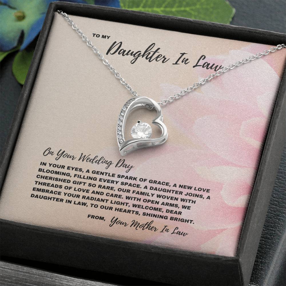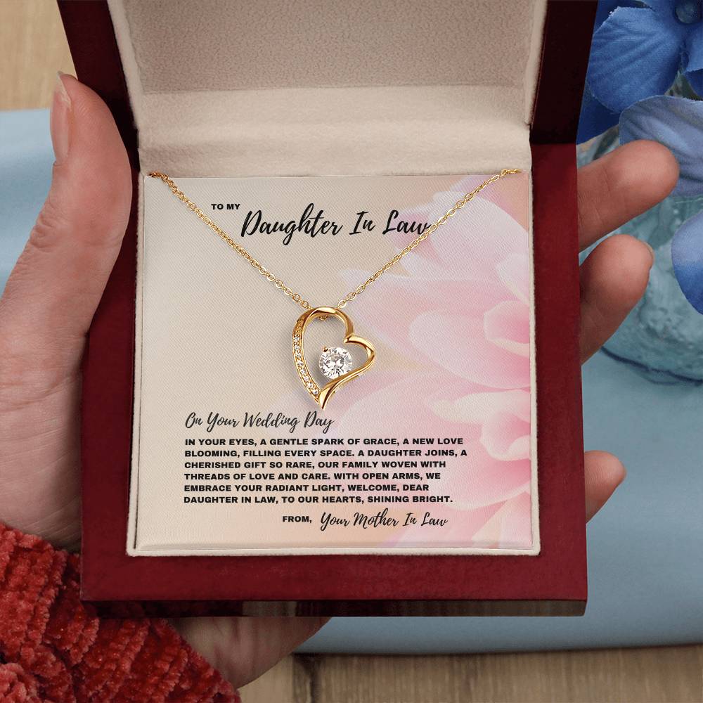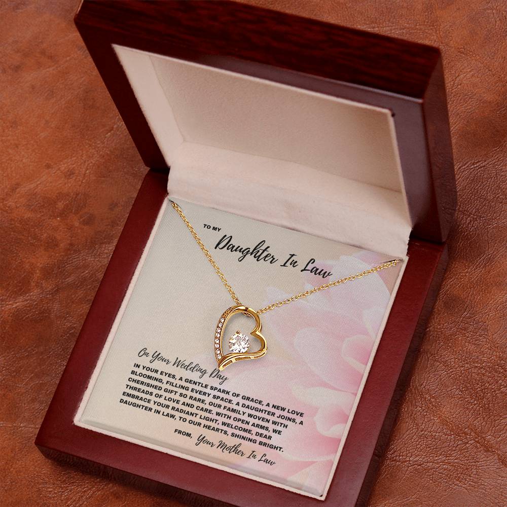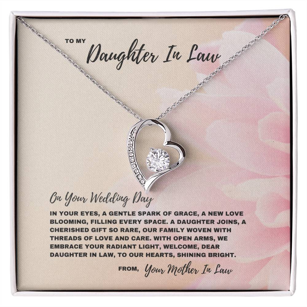 Celebrate your daughter-in-law’s wedding day with this beautiful Forever Love Necklace. The message card reads, “In your eyes, a gentle spark of grace, a new love blooming, filling every space.” This necklace is a symbol of the love and grace she brings to the family, making it the perfect keepsake for her special day. This piece is sure to melt her heart and reassure her that she has your acceptance, love and support.